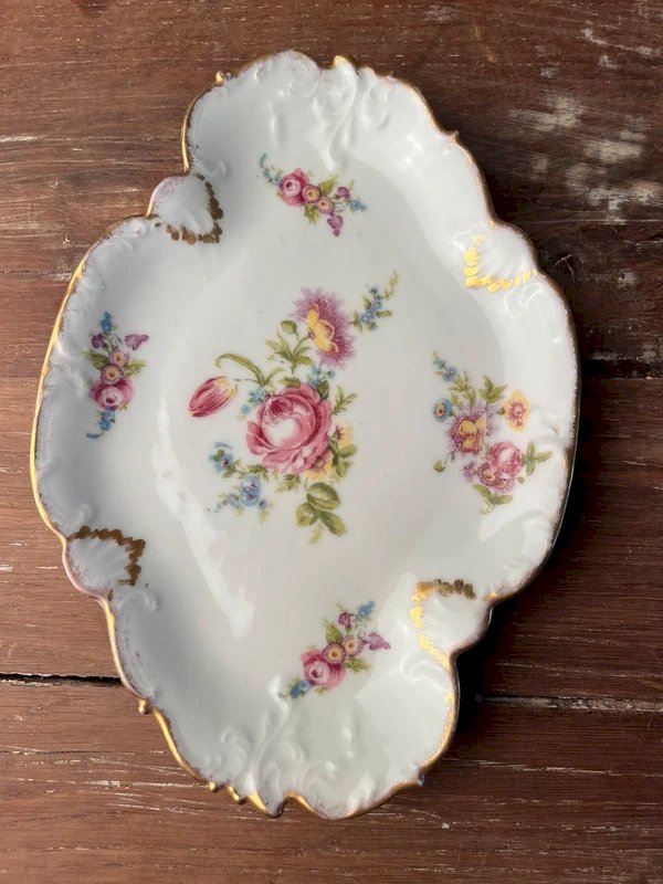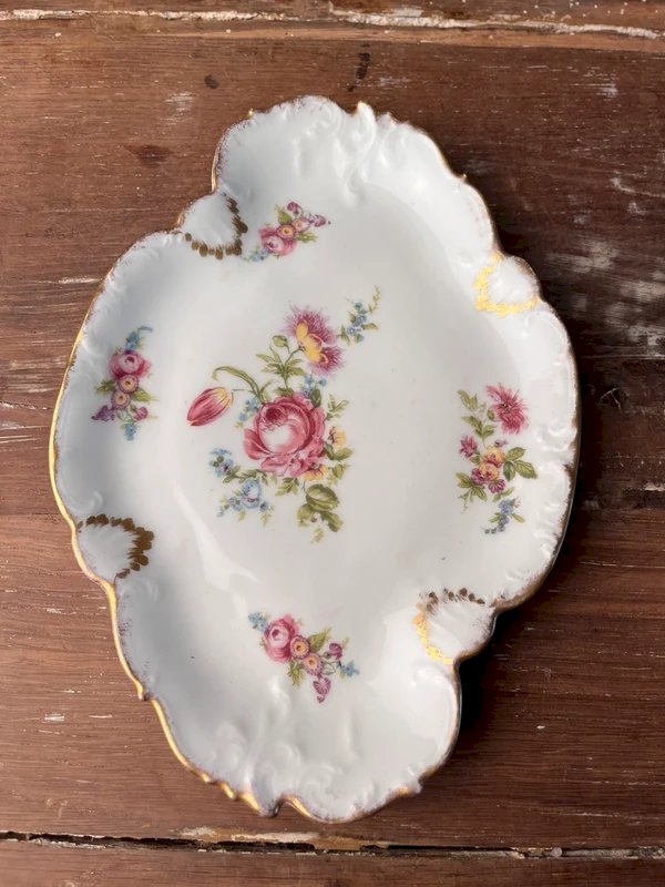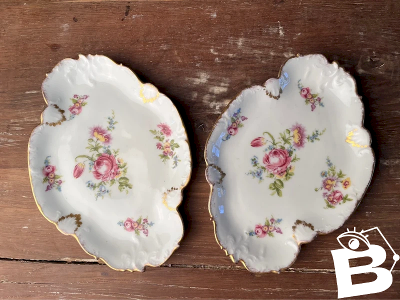 Paire de raviers en porcelaine ancienne de couleur blanche à motifs floraux, tour doré.