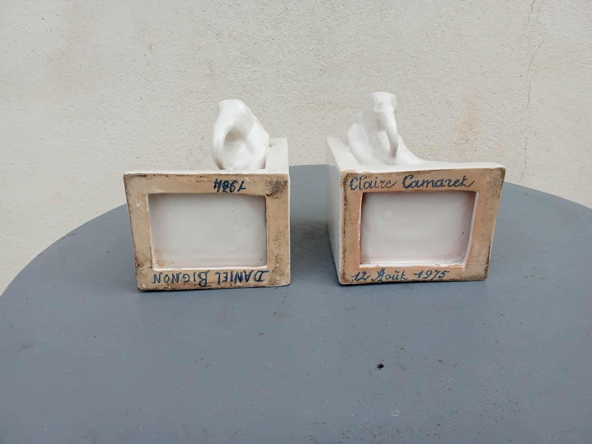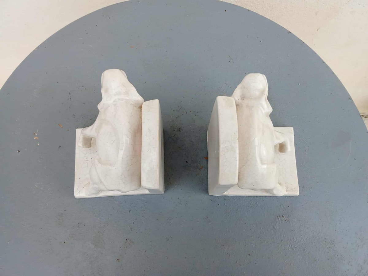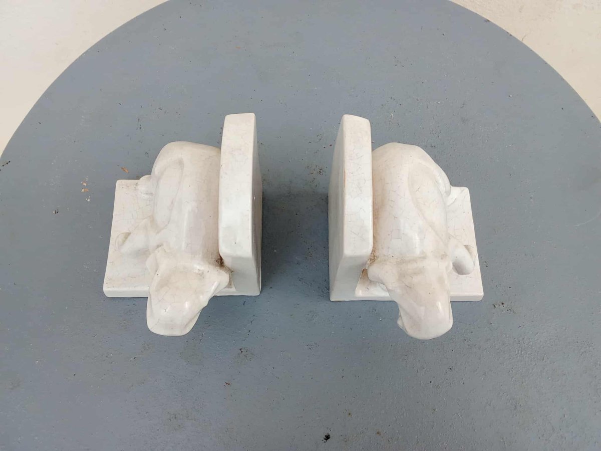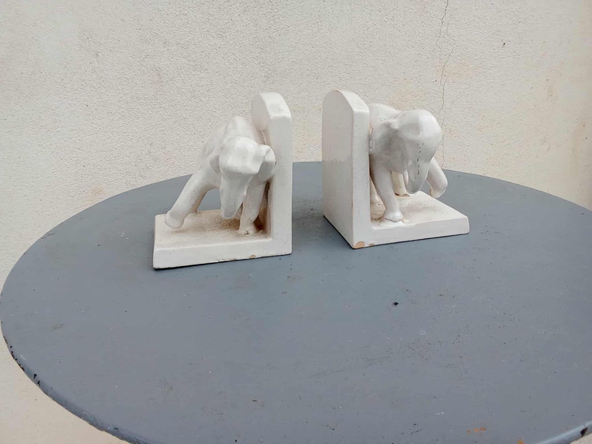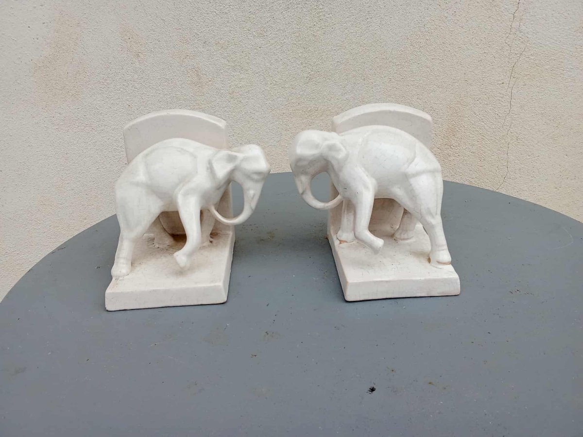 Charmante paire de serre-livres en faïence craquelée figurant deux éléphants stylisés, typiques de la période Art Déco. Belle patine d’origine et lignes élégantes. Dimensions : H. 12 cm – L. 12 cm – P. 10,5 cm. Bon état général.