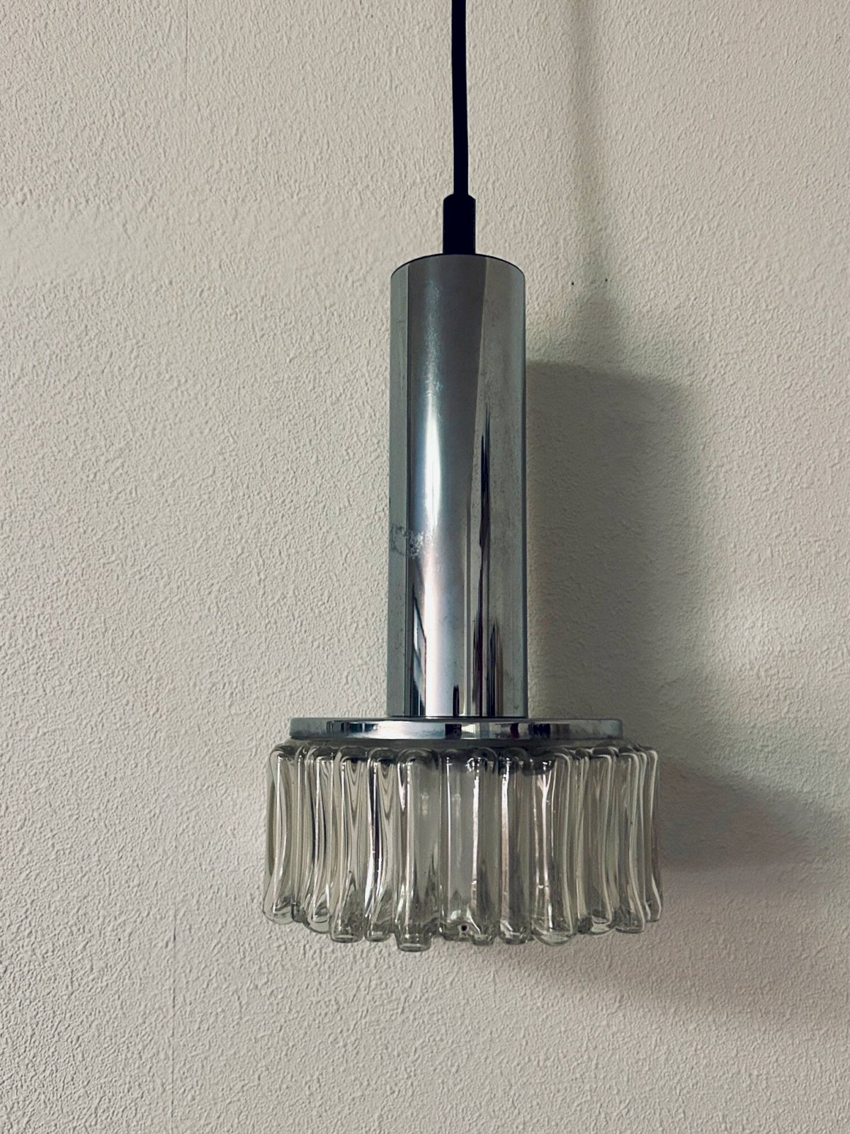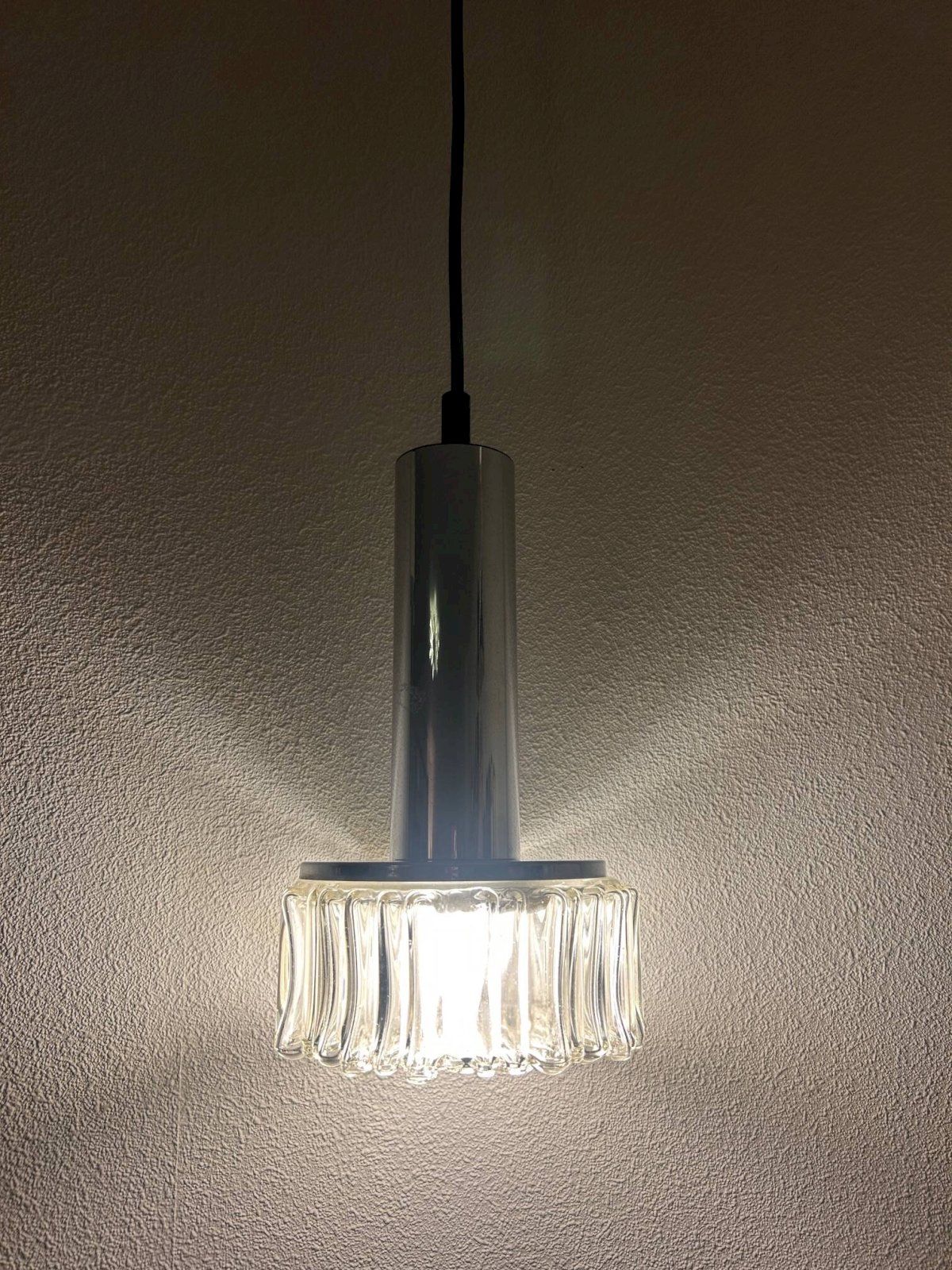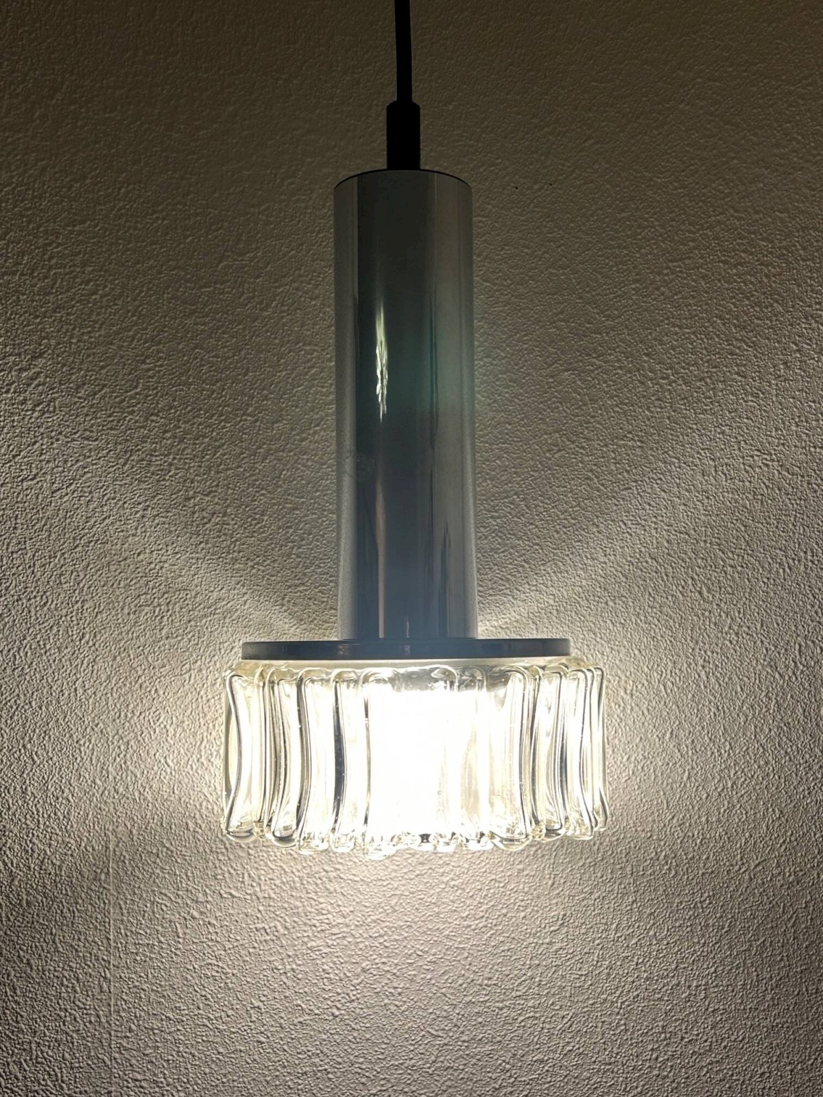 Paire de suspensions en chrome et verre bullé des années 70 éditées par Staff Leuchten.Suspension seule hauteur 28 centimètres, diamétre 16cm.Fil ajustable.