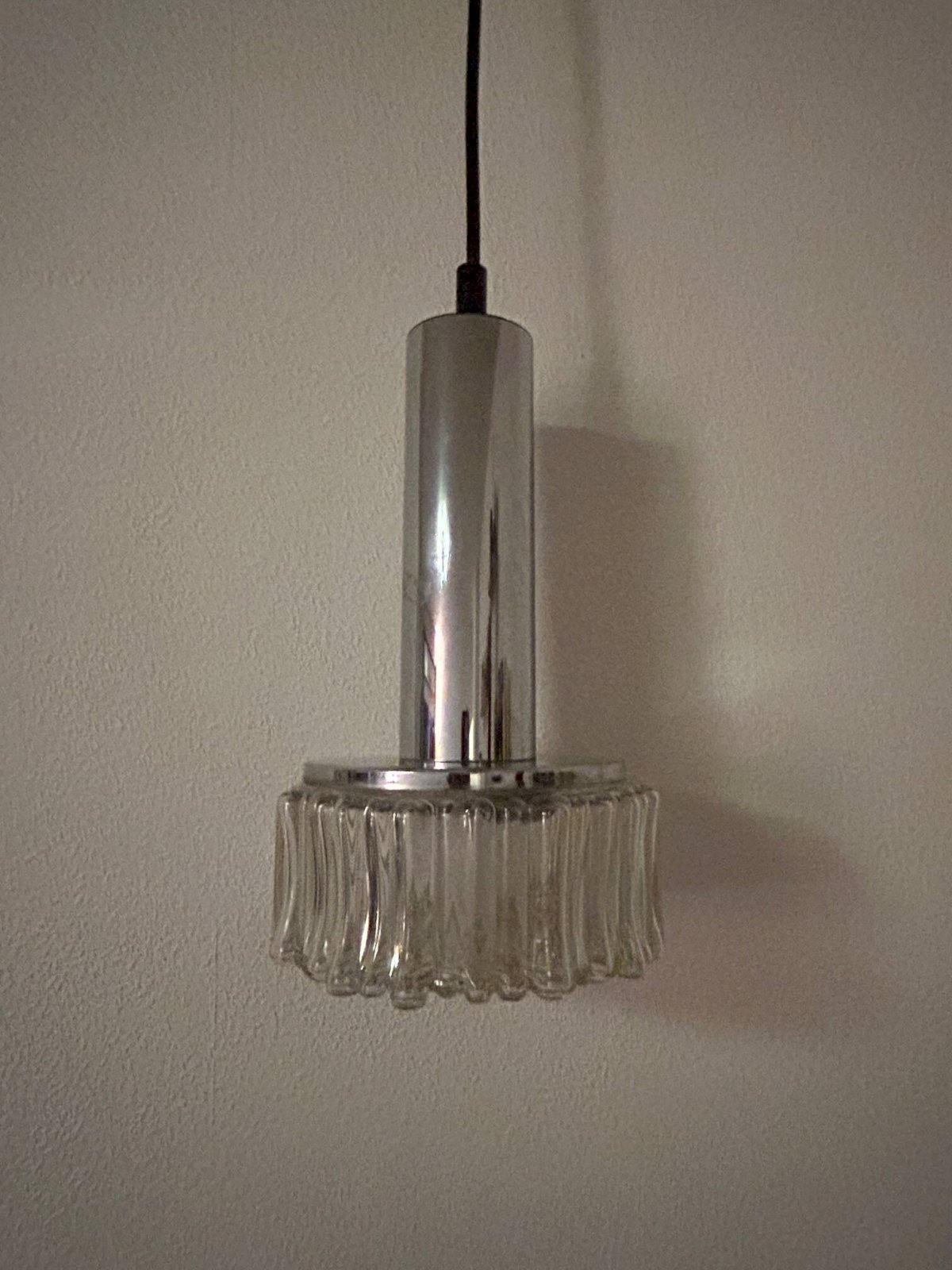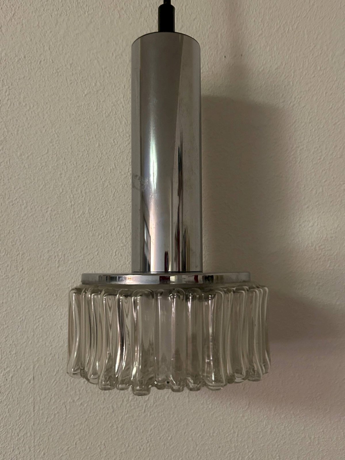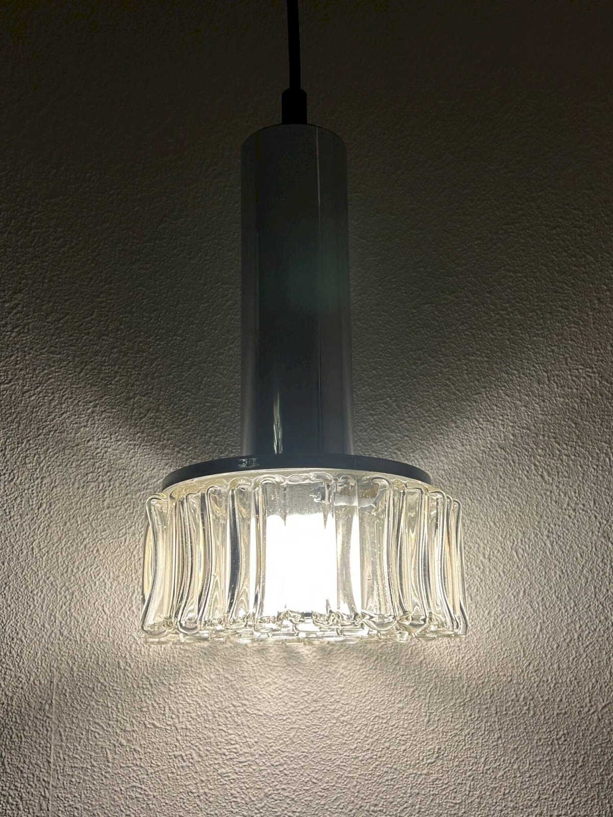 Paire de suspensions en chrome et verre bullé des années 70 éditées par Staff Leuchten.Suspension seule hauteur 28 centimètres, diamétre 16cm.Fil ajustable.