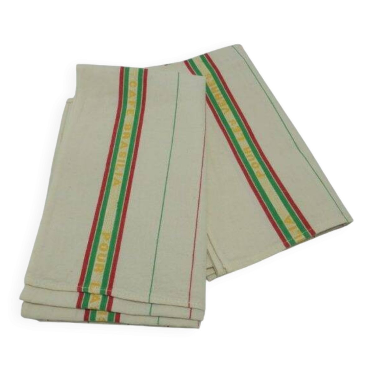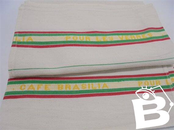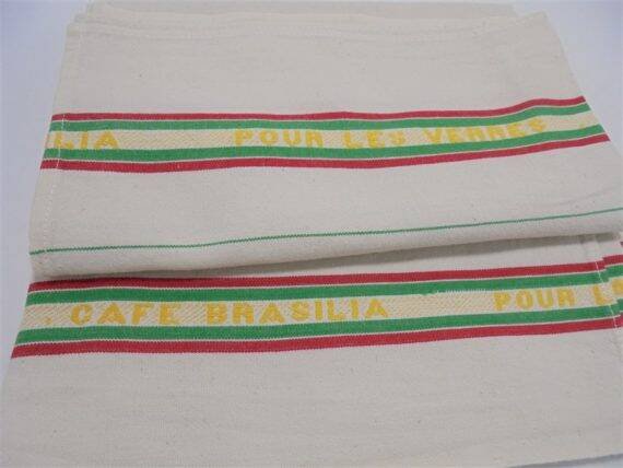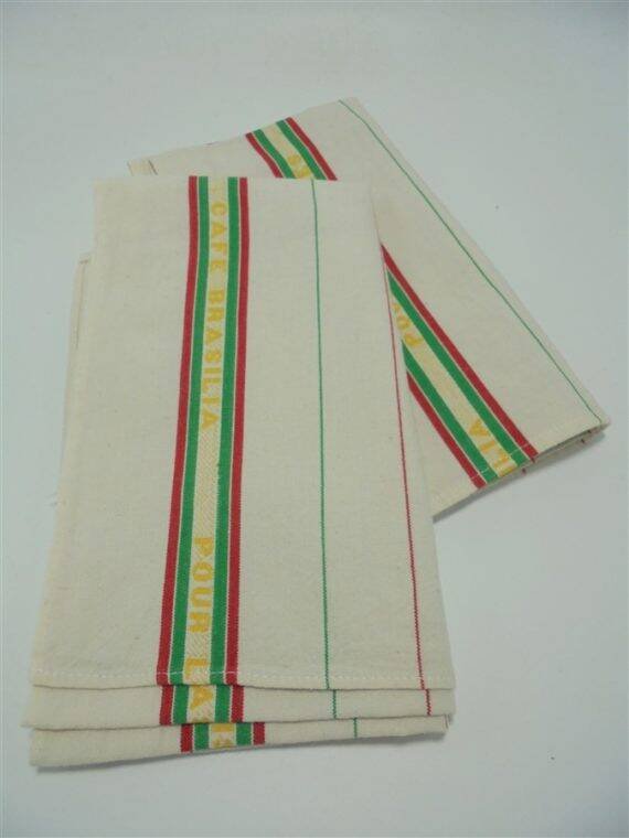 Paire d'anciens torchons brodés "CAFE BRASILIA - POUR LES VERRES", rayés, aux couleurs vert, jaune et rouge.Dimensions : 65 x 53 cmPoids : 120 g