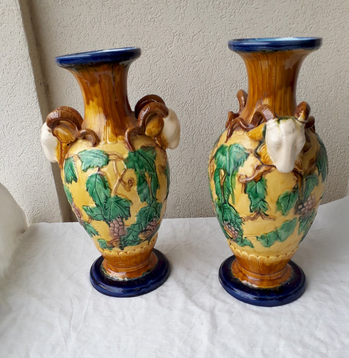 Ancienne paire de vases en barbotine, sans indication de manufacture, ornées de têtes de boucs, et d'un décor de feuilles de vignes.