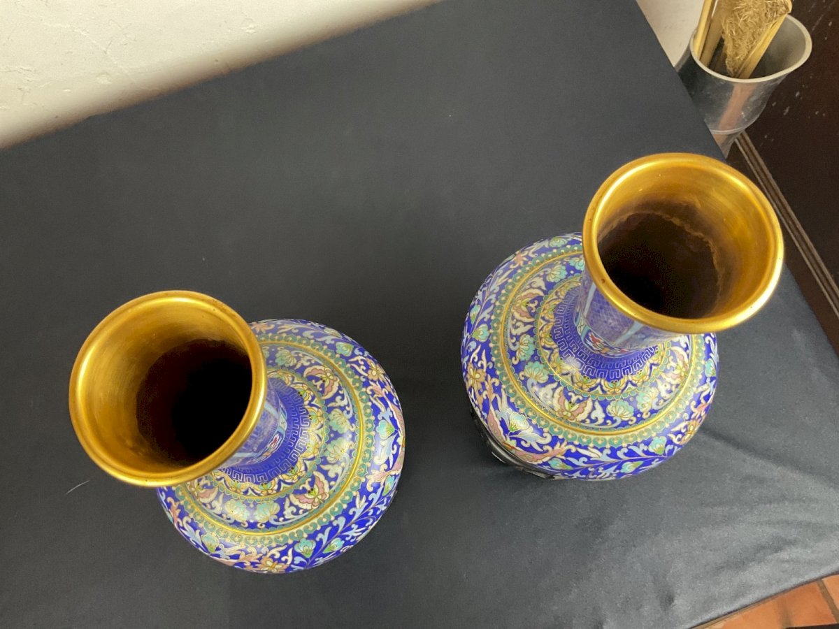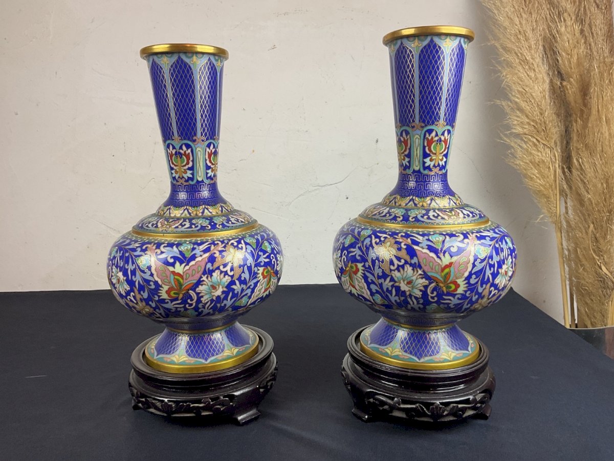 Paire de Vases Cloisonnée avec étiquette , Zi Jin Cheng Hauteur sans support 25,8 cm Authenticité:Original Origine:Asie Matière:Bronze