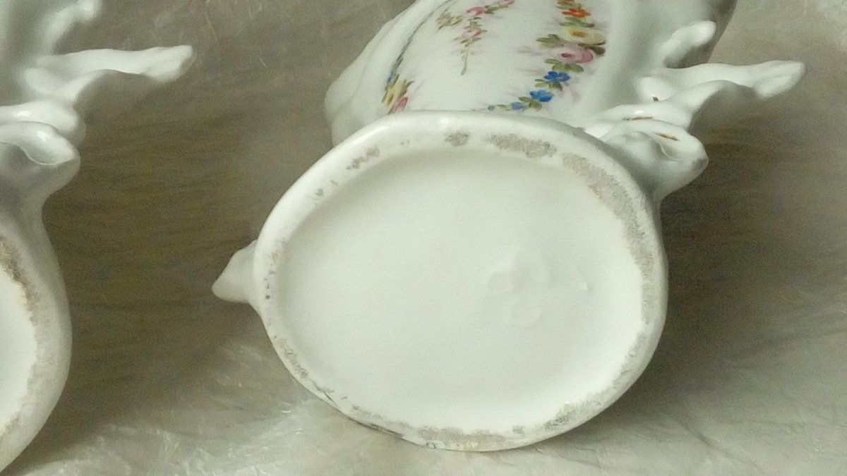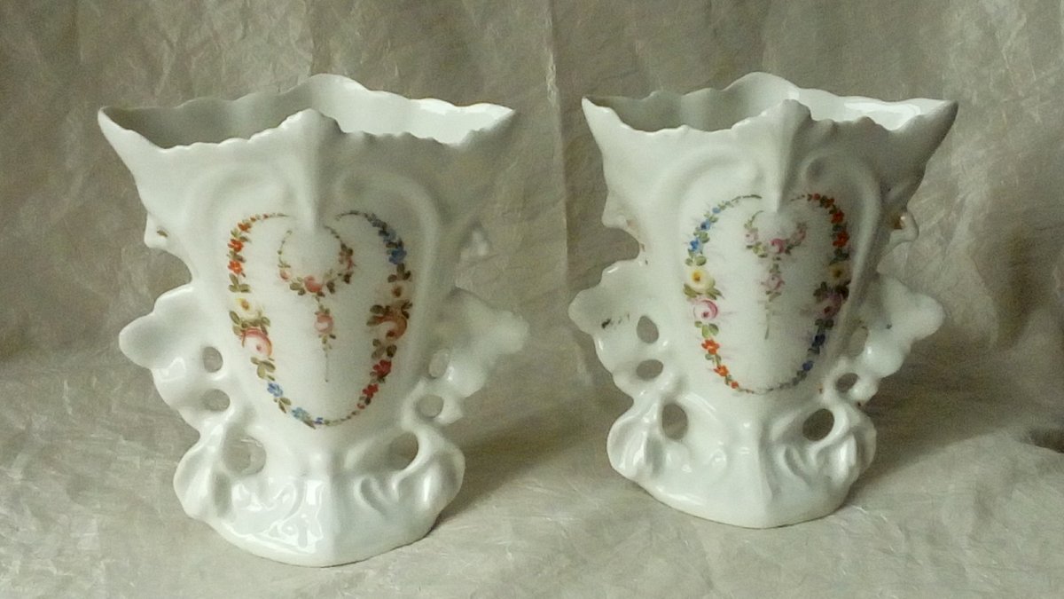 TRES BELLE PAIRE DE VASES DE MARIÉE  EN PORCELAINE DE PARIS FIN 19 ÈME  DECOR FLORAL HAUTEUR 17.50 cm LONGUEUR 15 cm PROFONDEUR 8 cm LÉGÈRES EGRENURES ET LÉGER CHEVEU EN ÉTOILE SOUS UN VASE ABSENCE DE DORURE  VISIBLE SUR LES PHOTOS Authenticité:Original Type:Objet de vitrine, Décoratif Origine:France Sous-type:Vase Pays de fabrication:France Matière:Porcelaine Style:Napoléon III