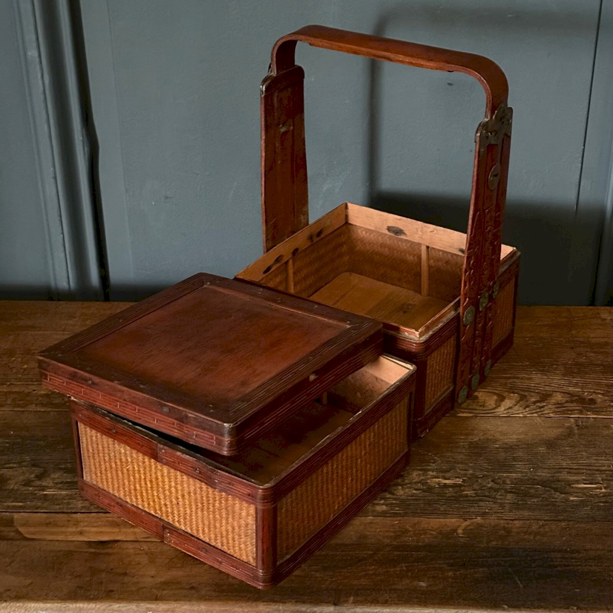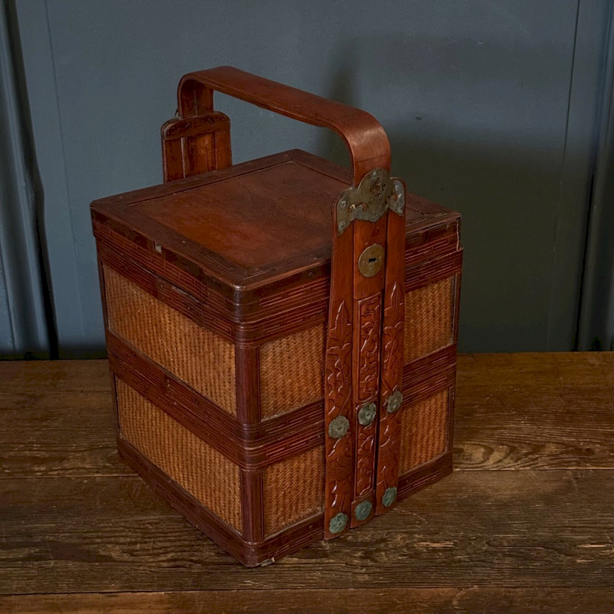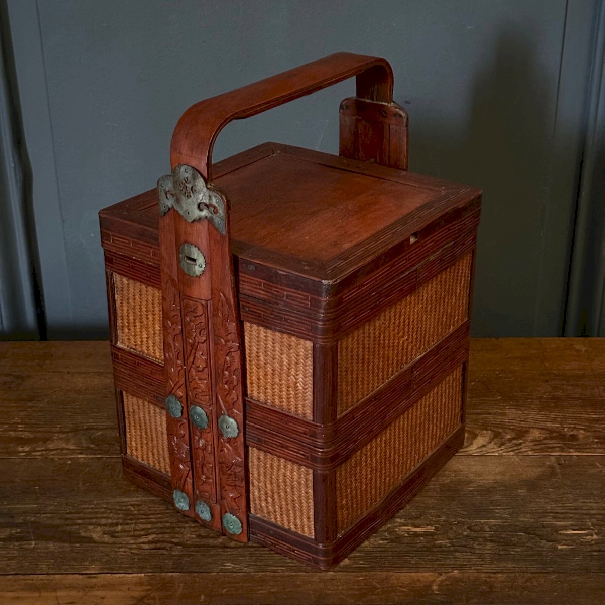 Panier chinois de déjeuner XXe en bambou et rotin bois gravé L9008