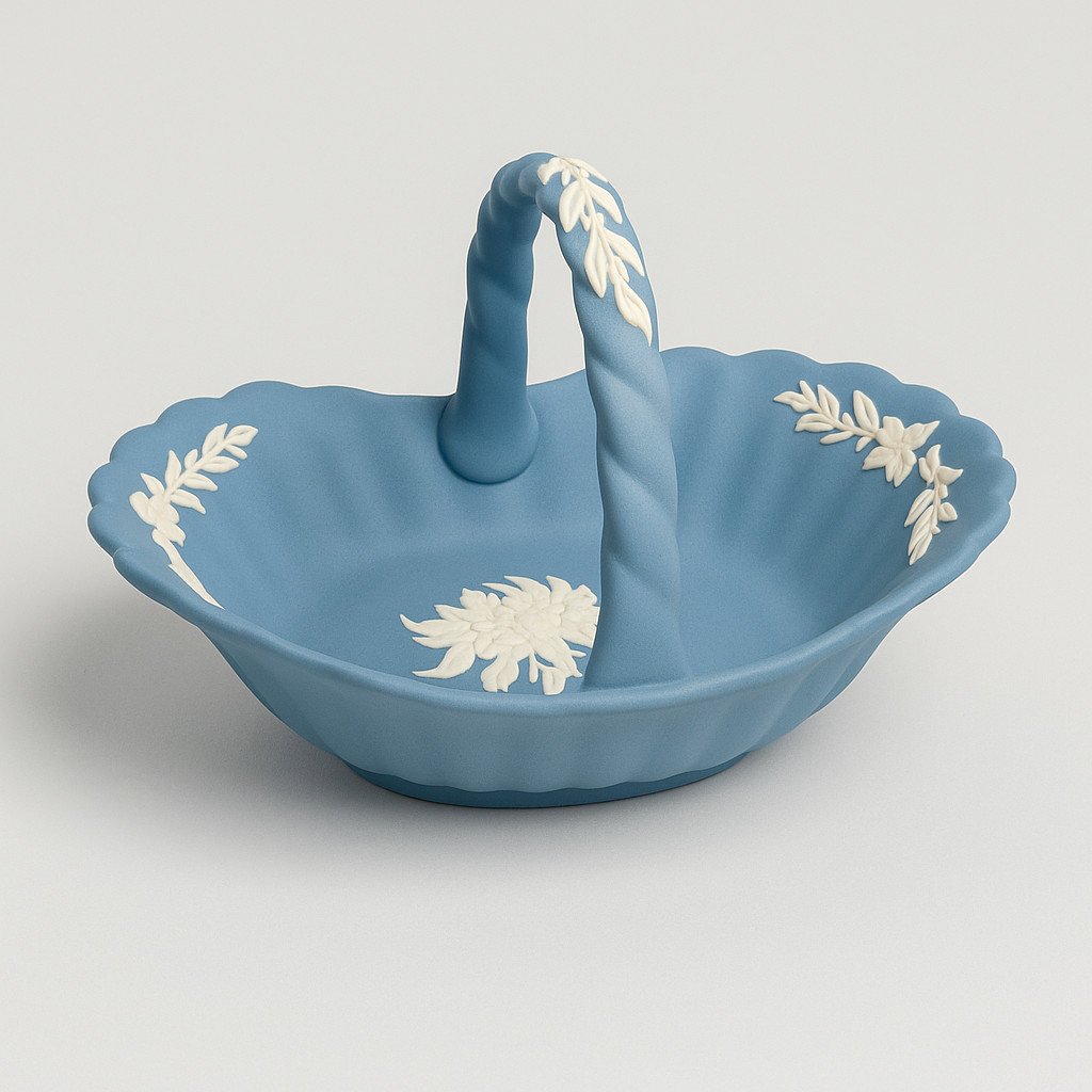 Panier Wedgwood Jasperware bleu – Bas-reliefs blancs – Porcelaine anglaise