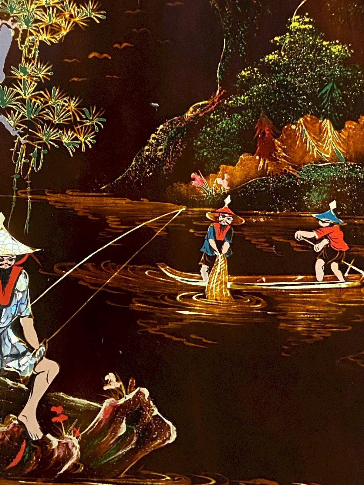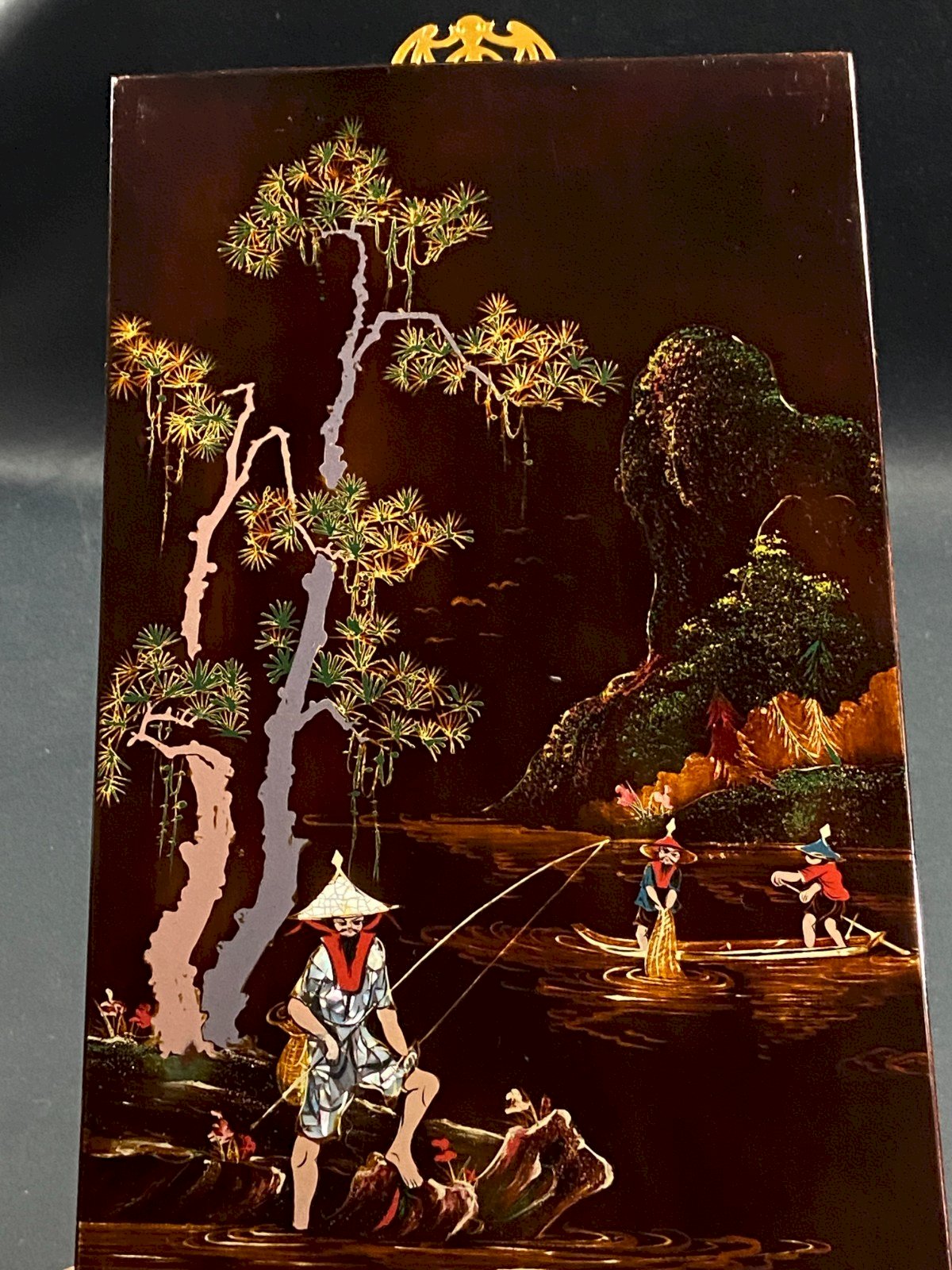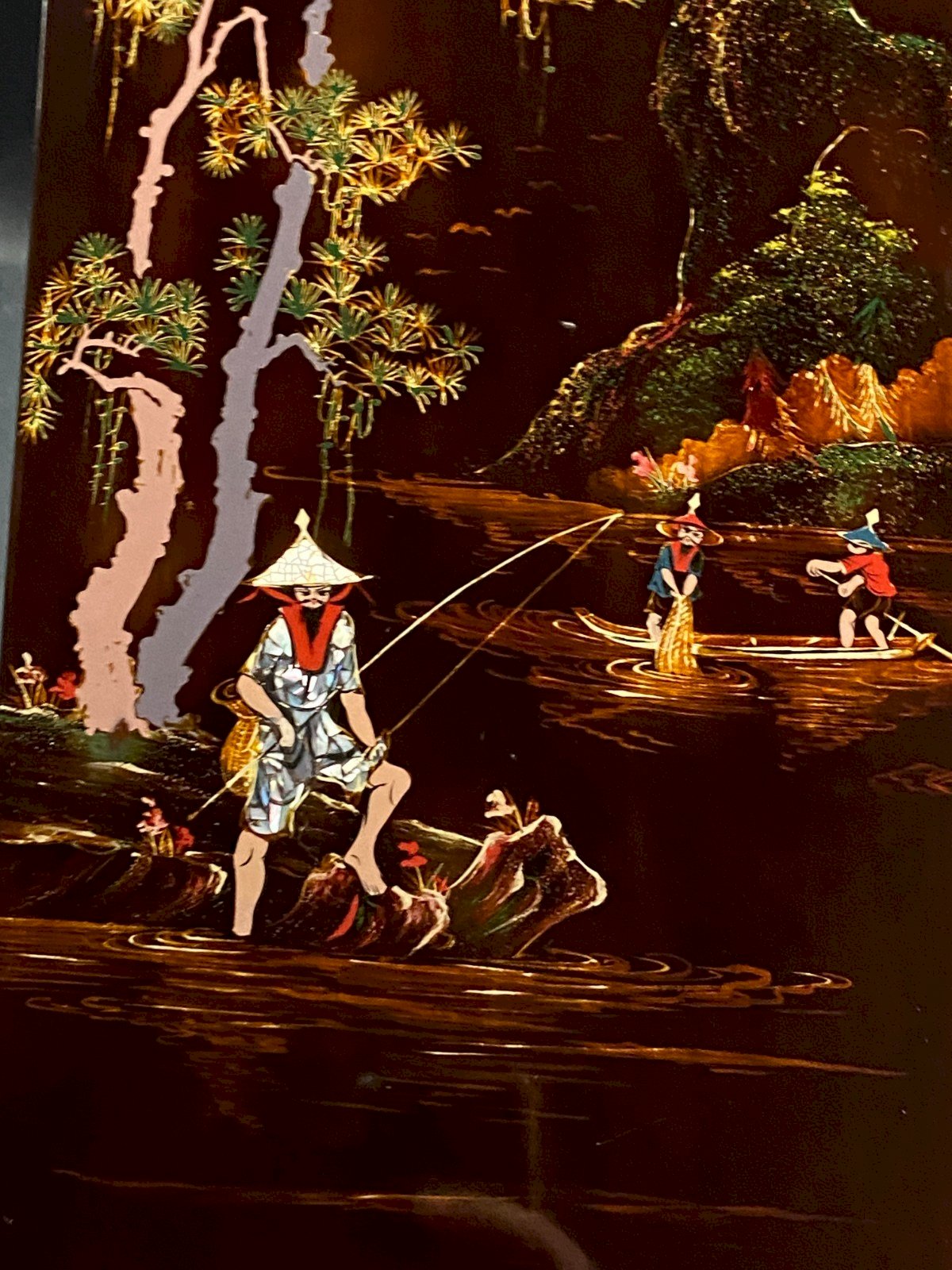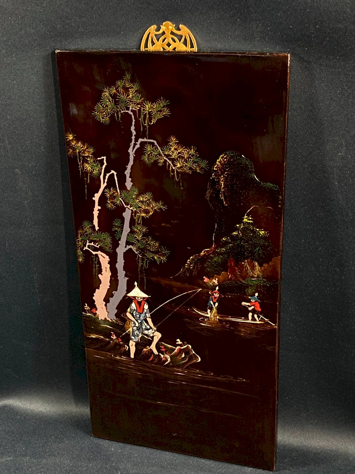 Panneau bois laqué Minh-Thanh Vietnam scène fluviale aux pêcheurs bord rivière