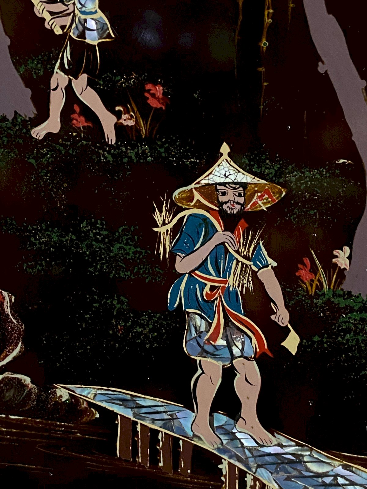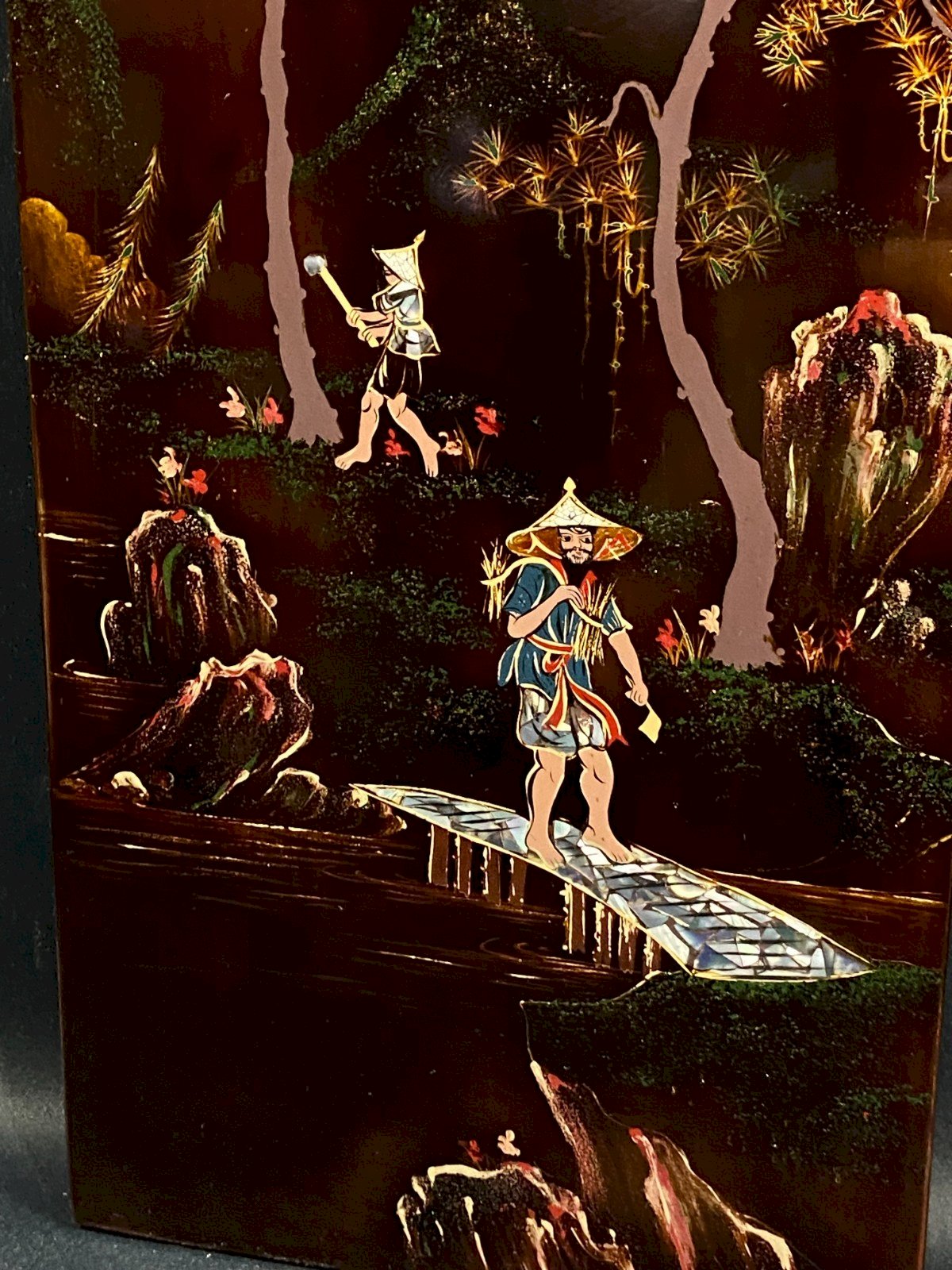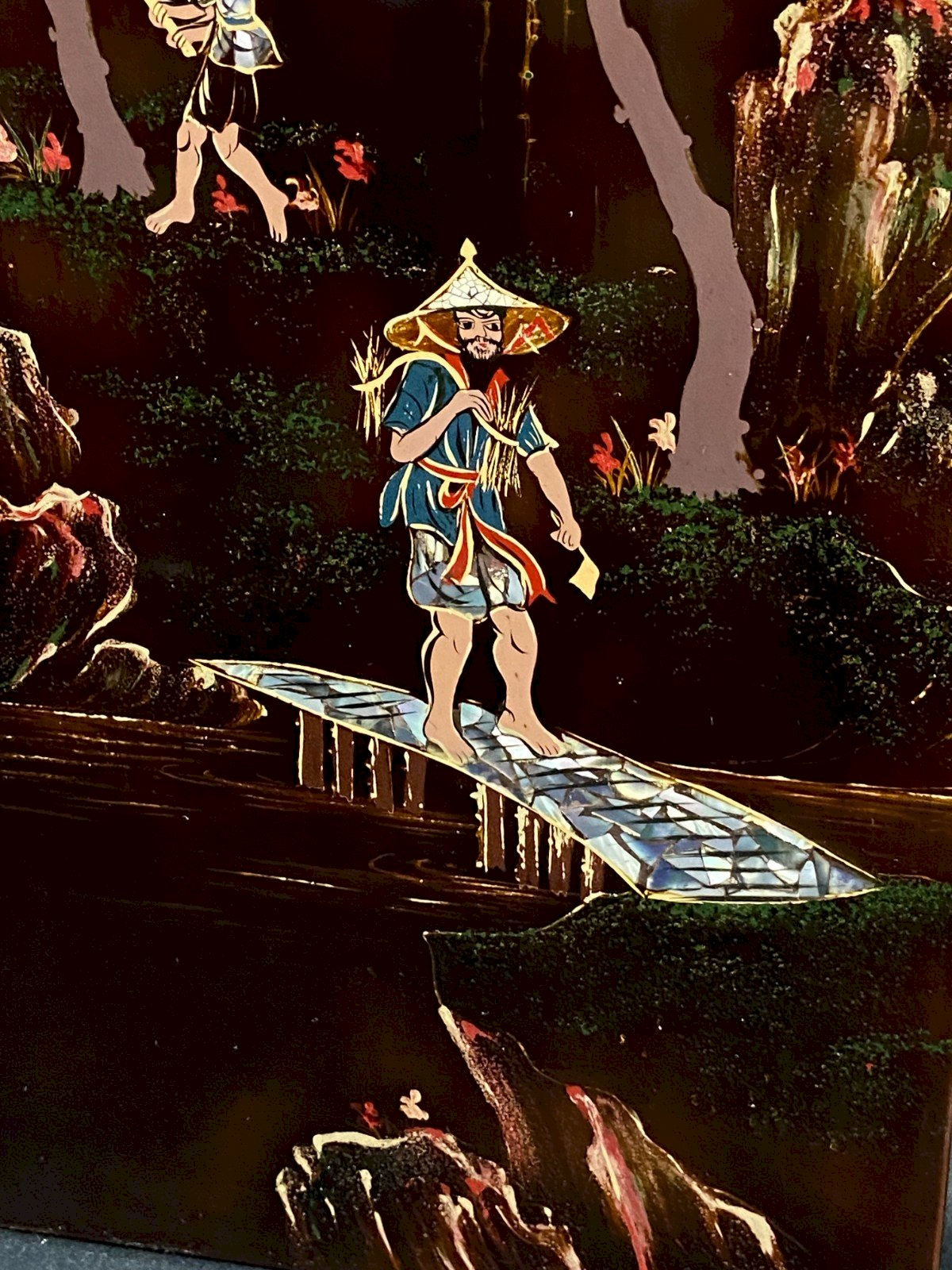 Panneau de bois laqué Minh-Thanh Vietnam scène rurale au porteur sur le pont