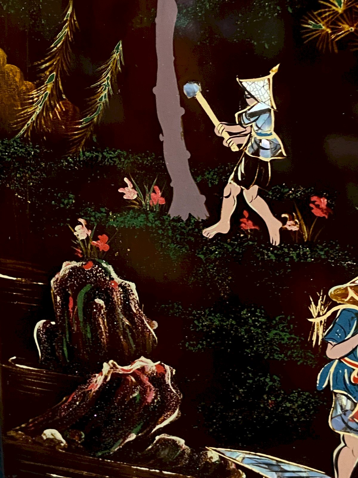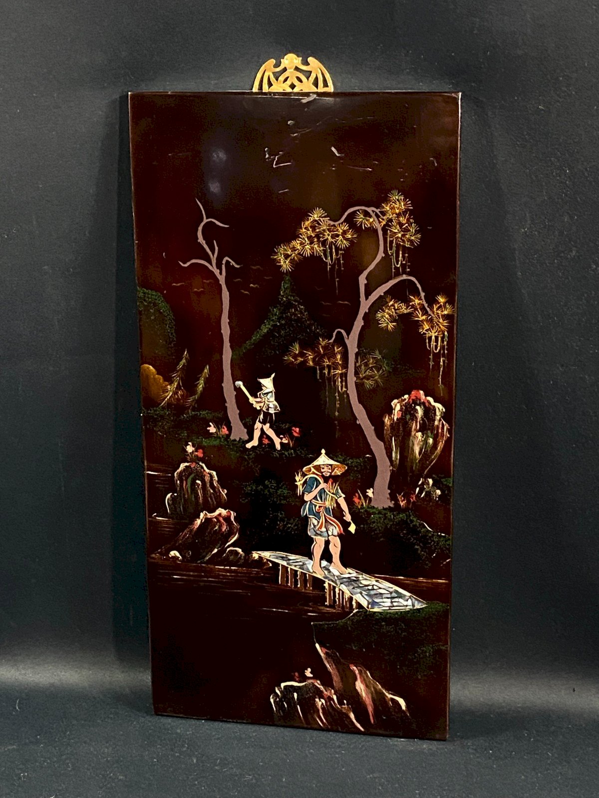 Panneau de bois laqué attribué à Minh-Thanh Vietnam représentant une scène rurale au porteur sur le pont milieu XXe Scène champêtre animée de deux personnages dont un porteur traversant un petit pont au dessus d'une rivière. Les arbre stylisés aux branches rosées, rochers vert émeraude sur fond brun-rouge sombre nuancé évoquant le style poétique des paysages indochinois. Accroche murale en laiton doré ajouré figurant une chauve-souris stylisée, symbole traditionnel de bonheur et longévité. Dimensions max : 40 x 19,4 x 1 cm Poids : 588 grammes Présence de griffures en partie supérieures Envoi TRES dans le monde entier Authenticité:Original Type:Peinture, Toile Origine:Vietnam Matériaux provenant de:Viêt Nam Matière:Bois