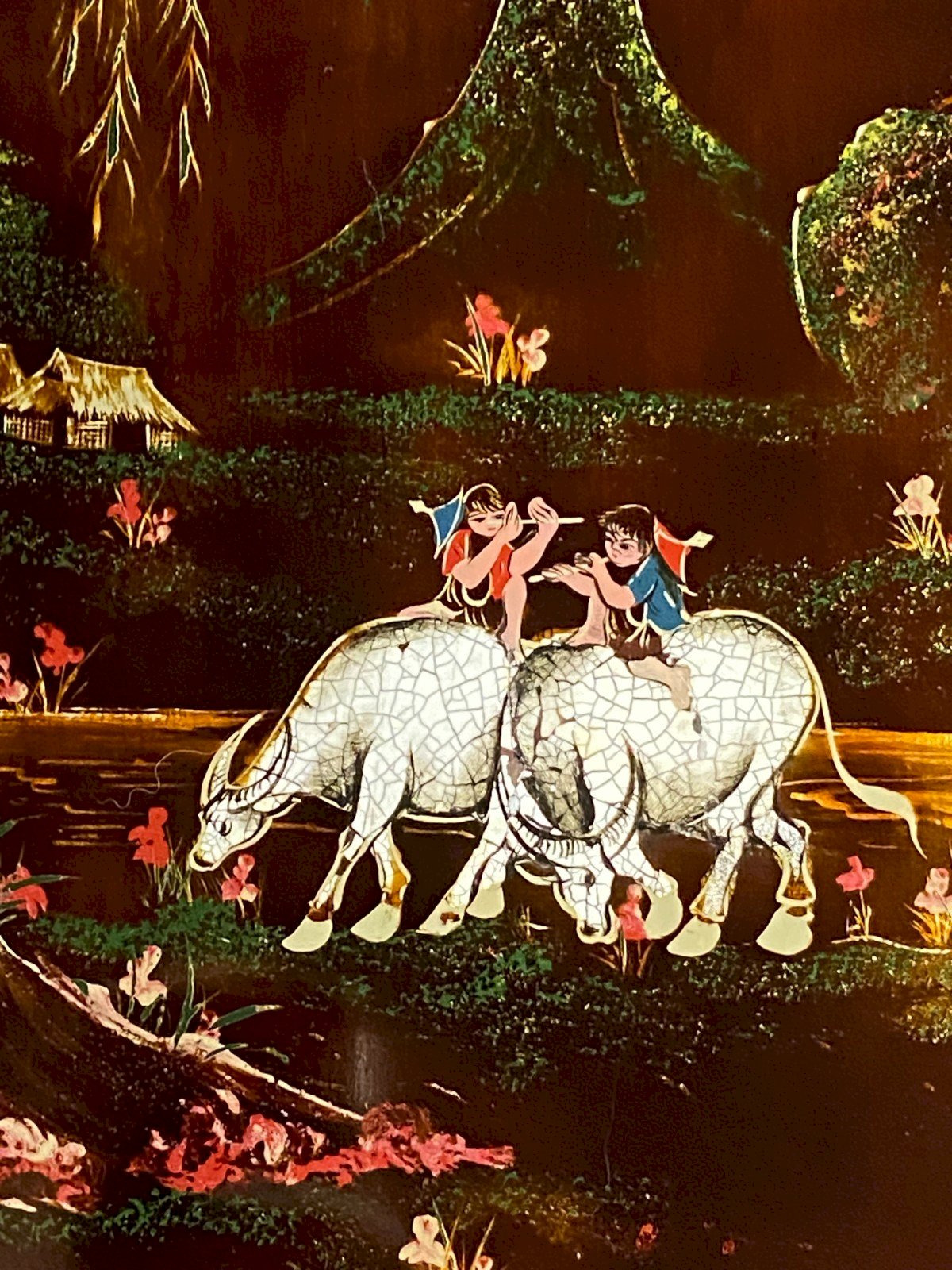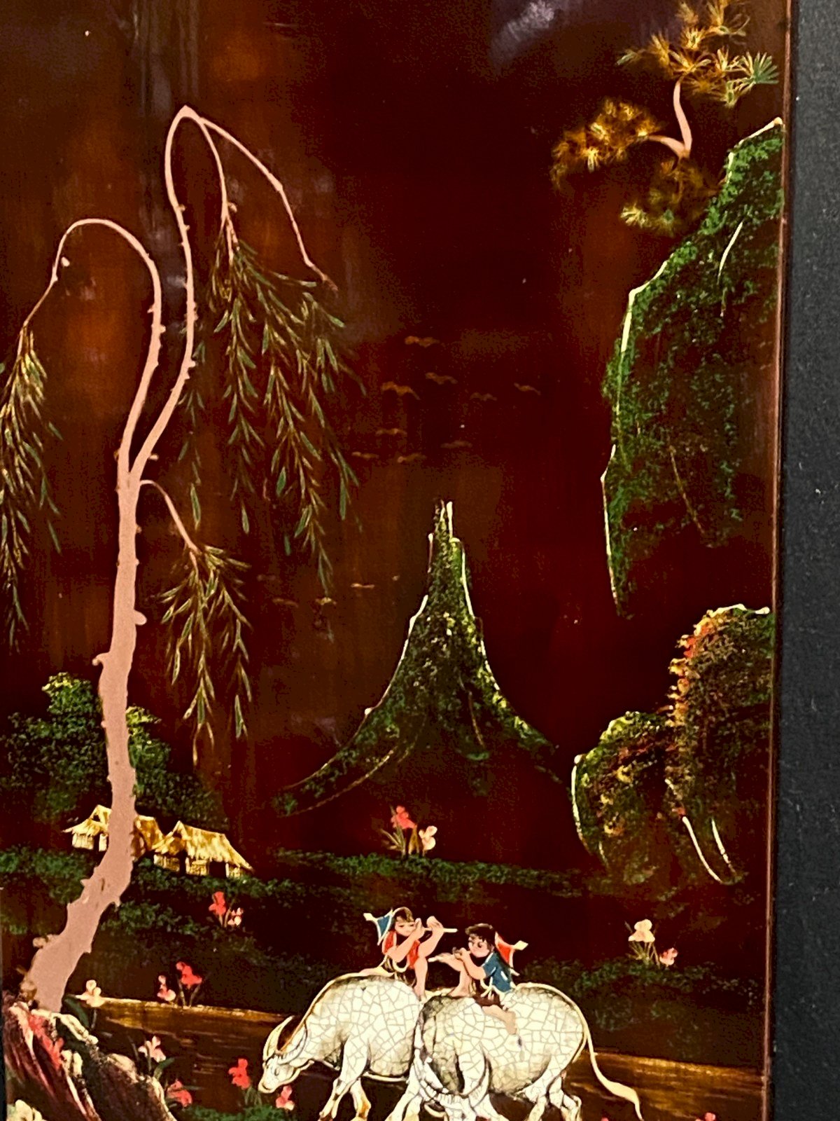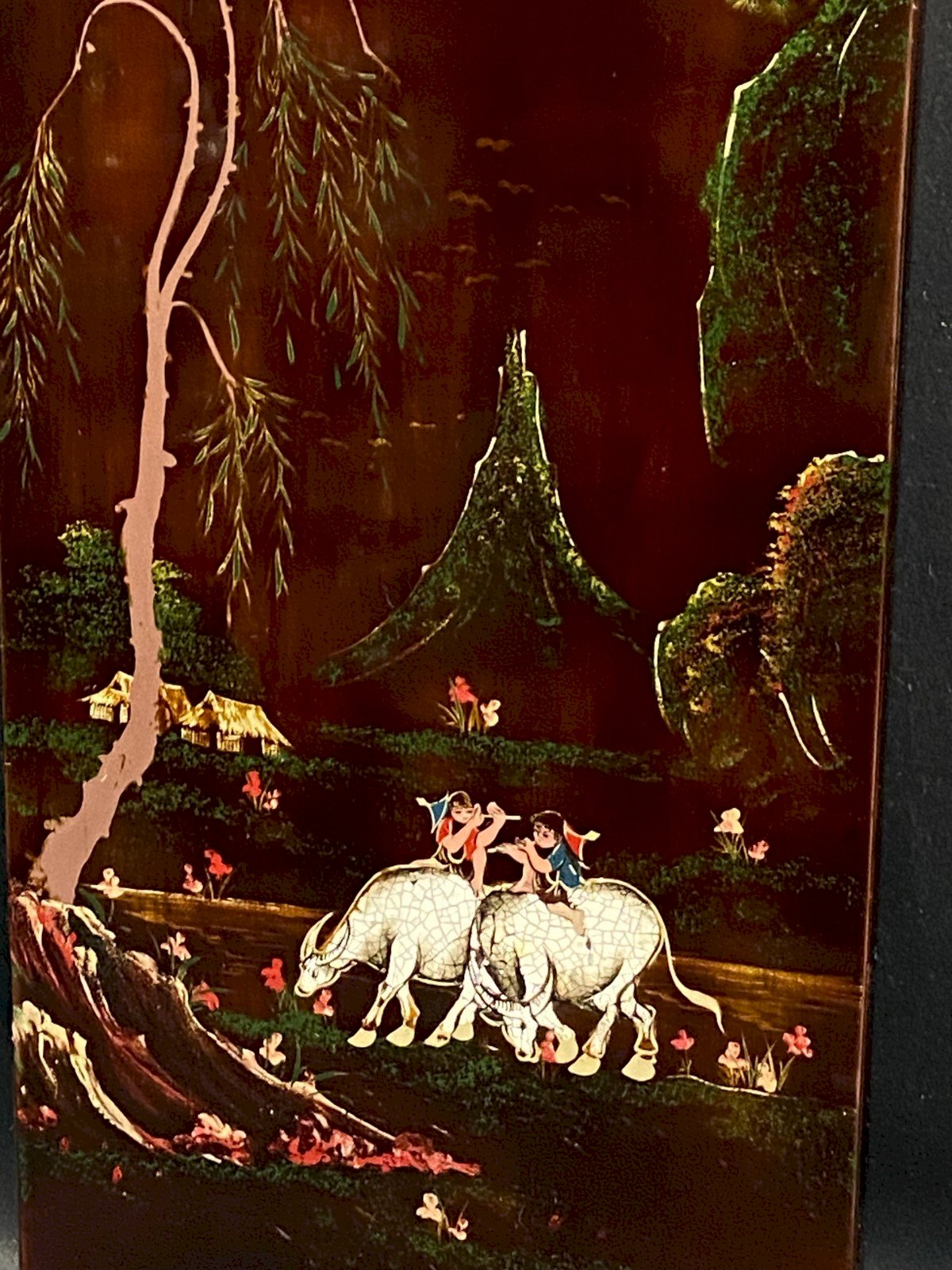 Panneau de bois laqué signé Minh-Thanh Vietnam scène rurale aux buffles d'eau