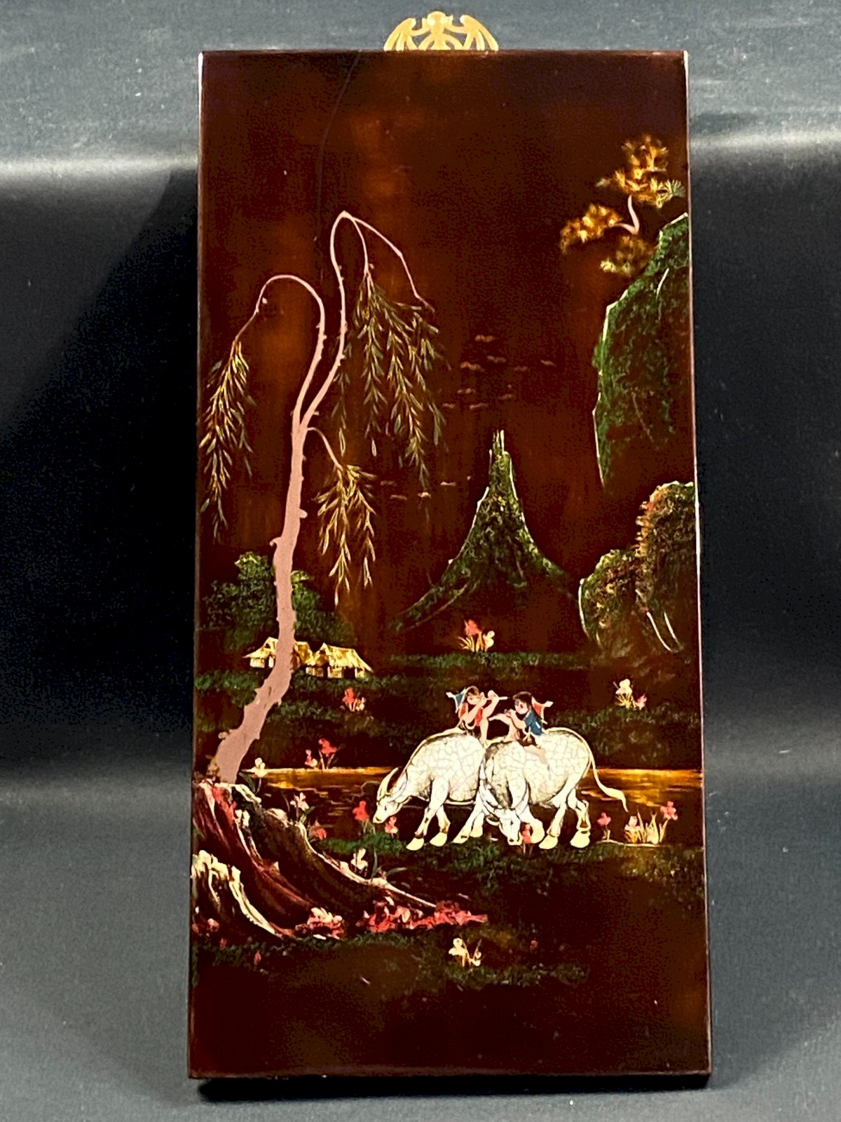Panneau de bois laqué signé Minh-Thanh Vietnam représentant une scène rurale aux buffles d'eau milieu XXe. Scène champêtre animée de deux enfants jouant sur le dos de buffles d'eau au bord d'un ruisseau, entourés d'un paysage montagneux, de maisons sous les arbres et d'un saule pleureur. Accroche murale en laiton doré ajouré figurant une chauve-souris stylisée, symbole traditionnel de bonheur et longévité. Palette raffinée à dominantes vertes, or et rouge corail sur fond brun-rouge sombre typique des laques vietnamiennes. Signature au revers à la peinture dorée : Minh-Thanh - Vietnam Dimensions max : 40 x 19,4 x 1 cm Poids : 630 grammes Je ne relèverais que quelques détails usuels en surface (légers frottements, légères rayures) Envoi TRES dans le monde entier Matériaux provenant de:Viêt Nam Authenticité:Original Type:Peinture, Toile Origine:Vietnam Matière:Bois