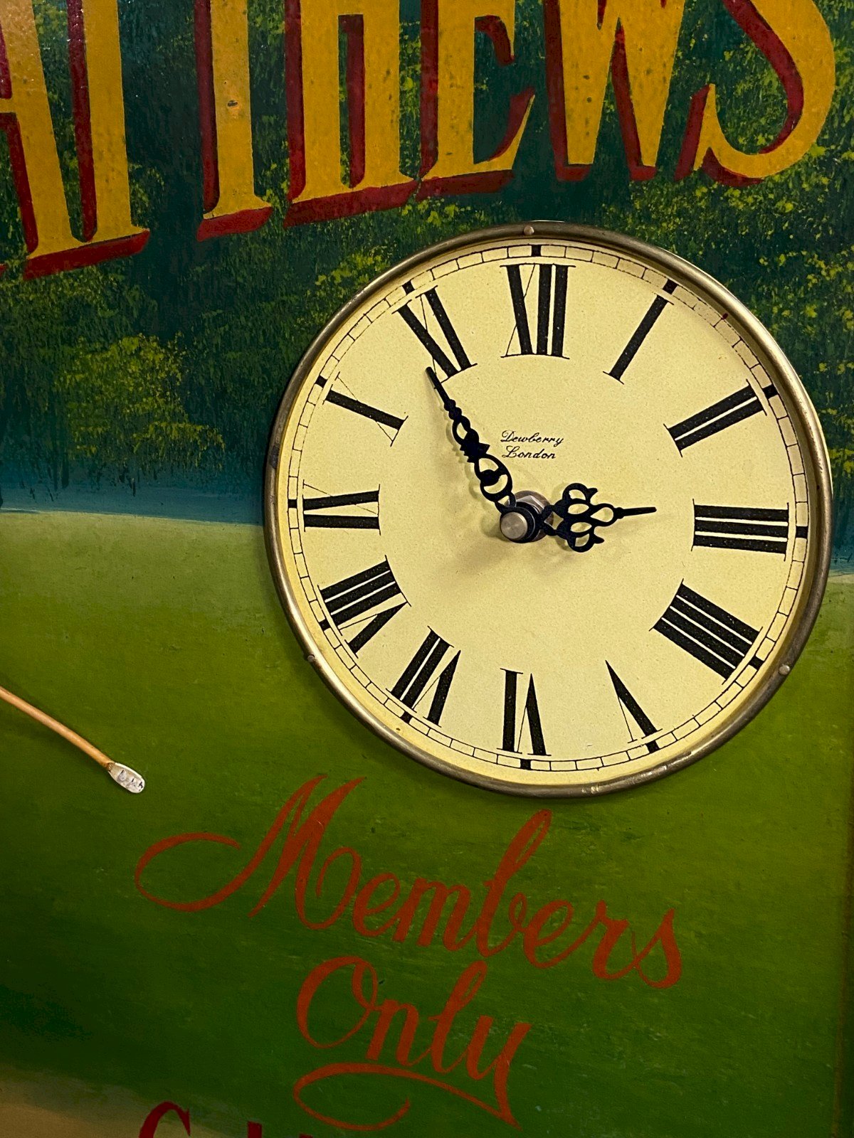 Panneau décoratif en bois conçu comme une enseigne de clubhouse de golf titré Golf Club St Matthews accompagné des mentions Membres Only et Gold Medal. - Golfeuse sculptée directement dans le bois peint à la main dans un style volontairement rétro des années 1930-1940 - Horlogerie intégrée avec cadran à chiffres romains et signature Newberry London et mécanisme à quartz moderne visible au dos. Je signale la présence de diverses petites traces d'usures en surface Dimensions max : Hauteur 58,5 x 46,3 cm Poids : 2322 grammes - Envoi ultra sécurisé à destination du monde entier - Retrait des commandes possible sur rendez-vous, rue Notre-Dame à Bourges. - Possibilité de groupage au sein d'un même colis : merci de bien vouloir me contacter préalablement afin que je puisse calculer vos frais de transport optimisés. Couleur:Vert Type:Pendule murale Mécanisme:A quartz Pays d'origine:Royaume-Uni Sous-type:A aiguilles Matière:Bois Forme:Rectangulaire