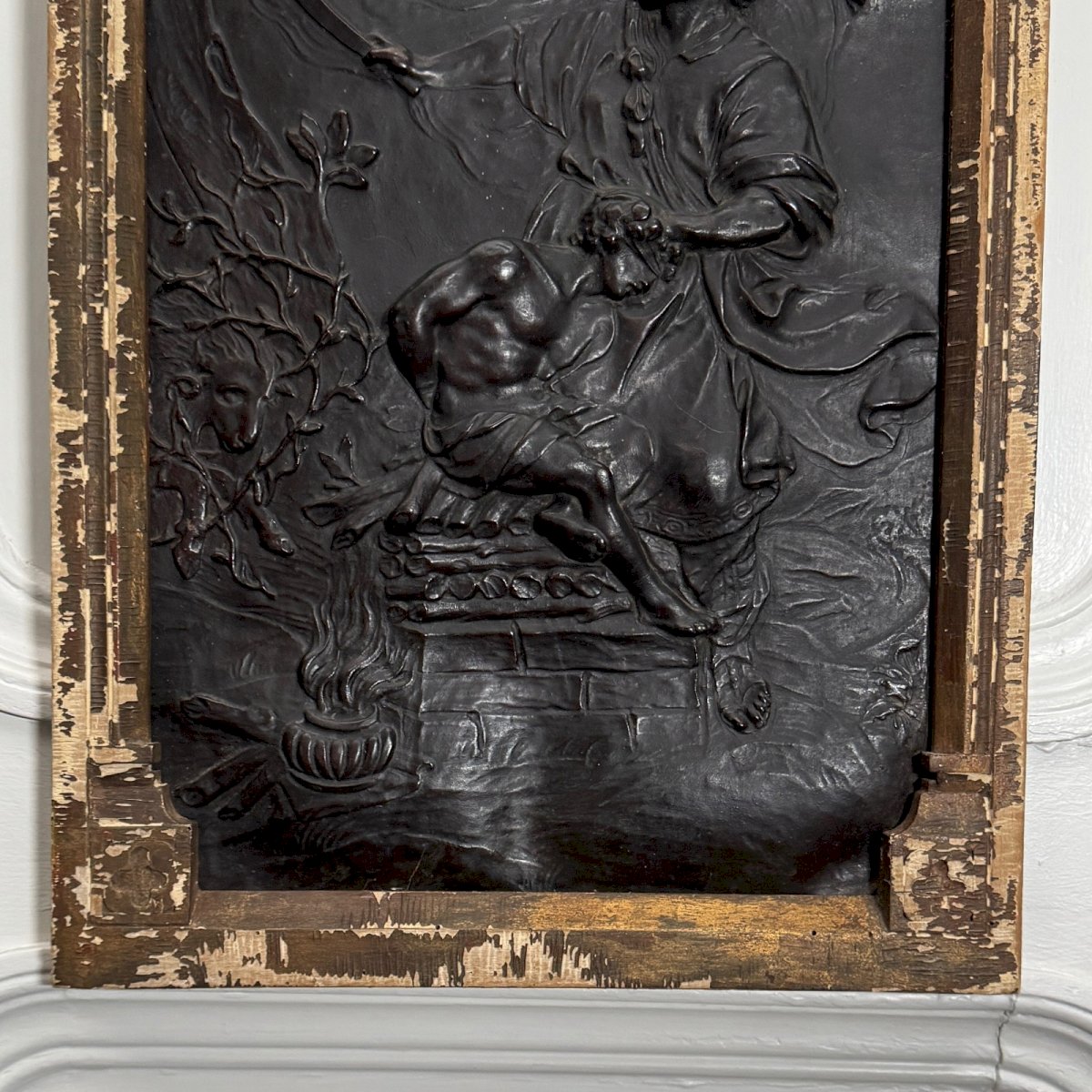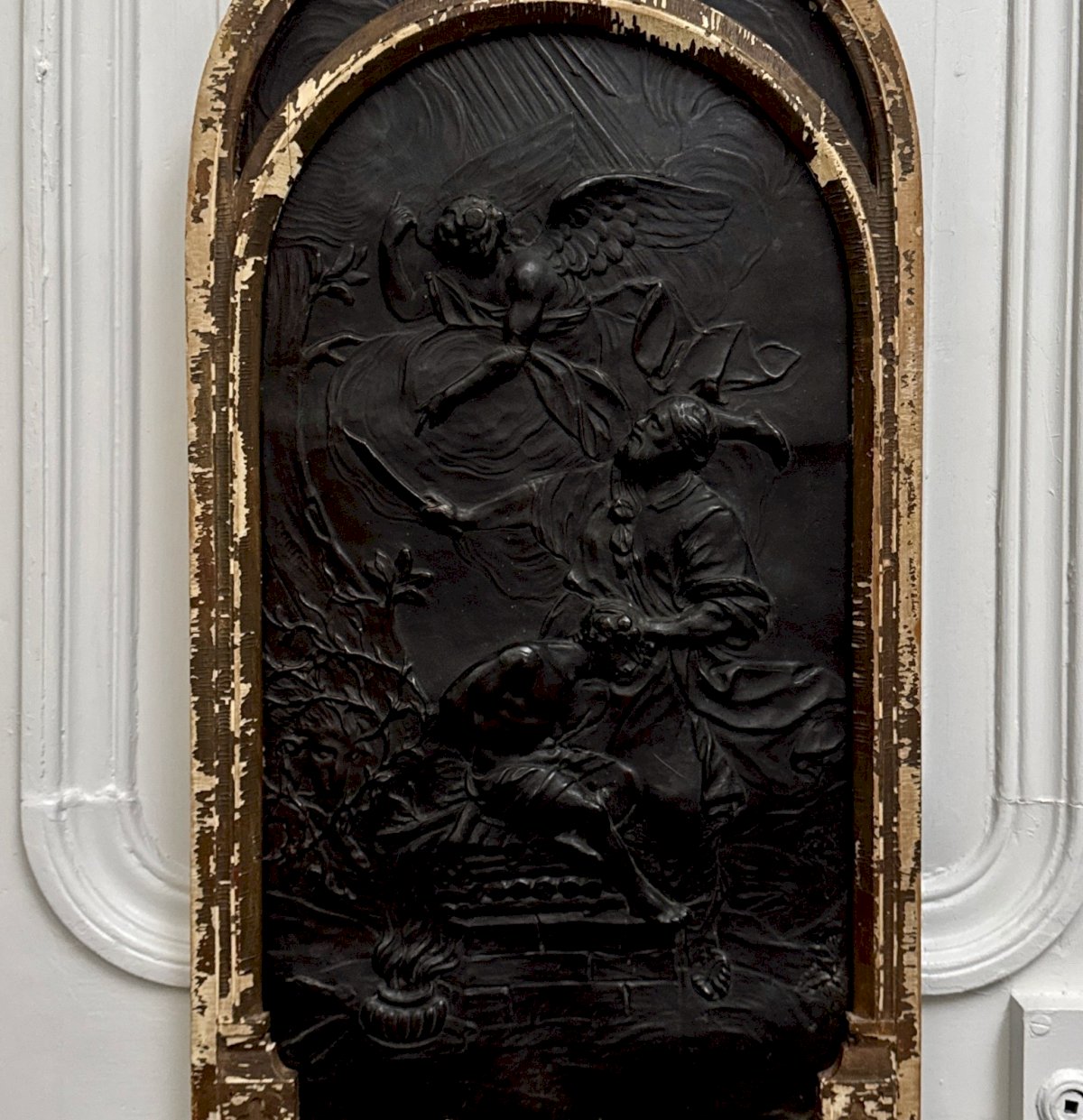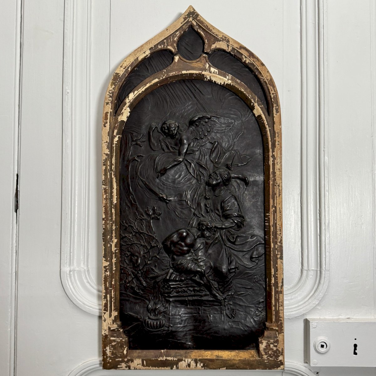 Panneau en cuir repoussé décor religieux néogothique XIXe entourage bois M3973