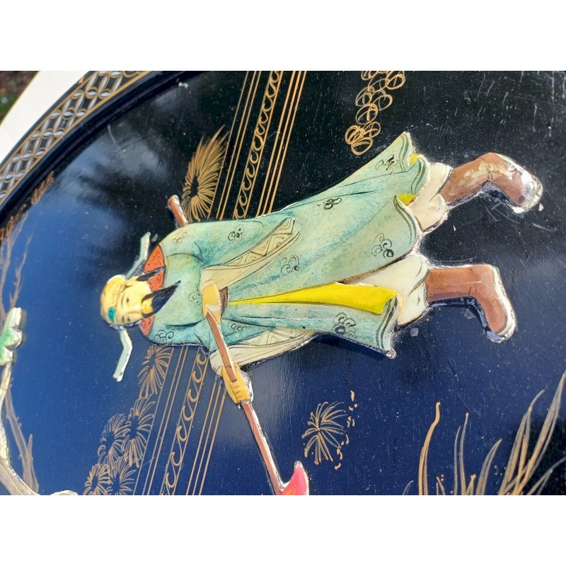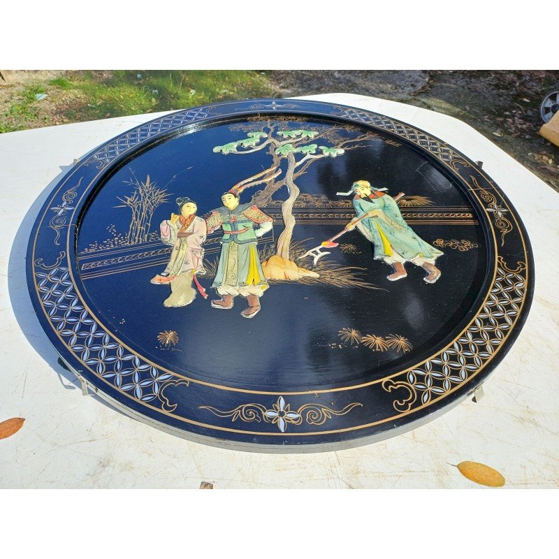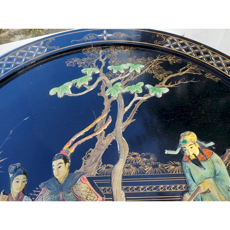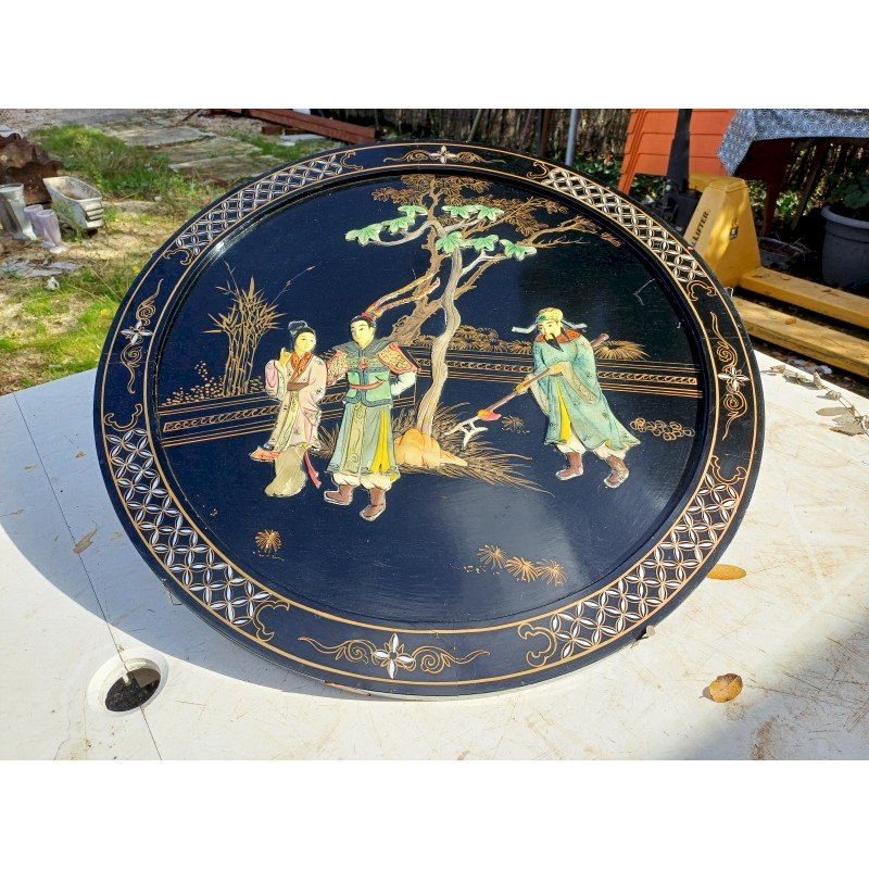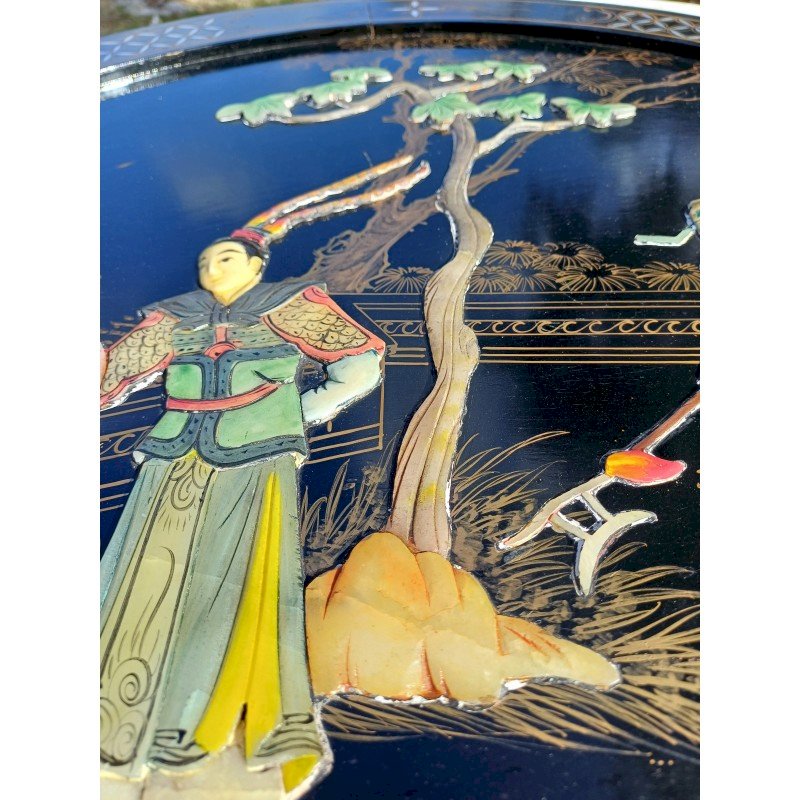 Panneau Laqué Noir et Or , rond Japonisant , Personnages et Végétations en Pierre dure et Os , Diam : 61 cm , épaisseur : 2 cm , poids : 3 Kg , trés bon ètat