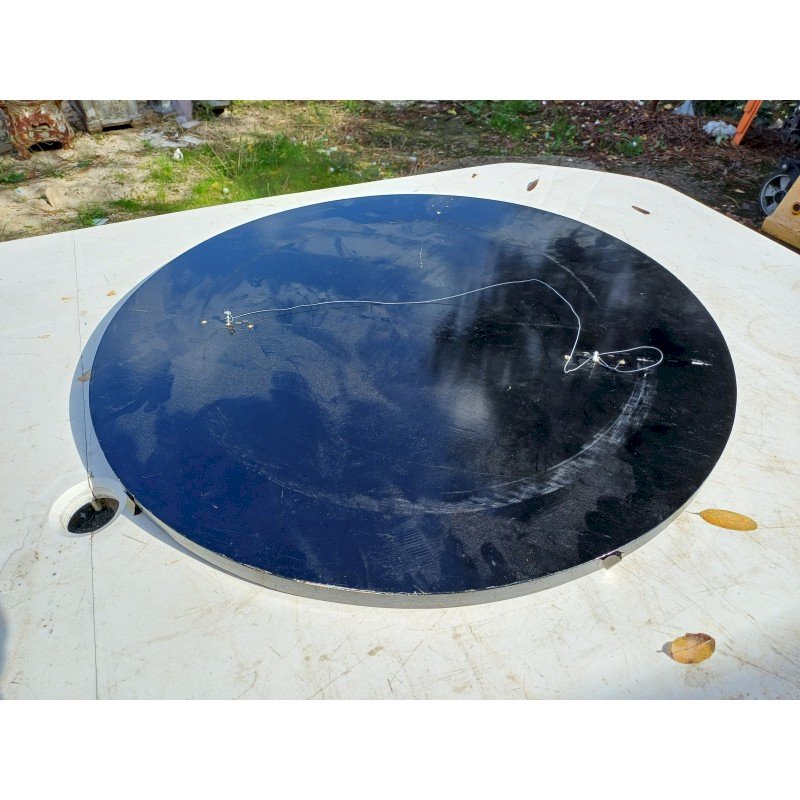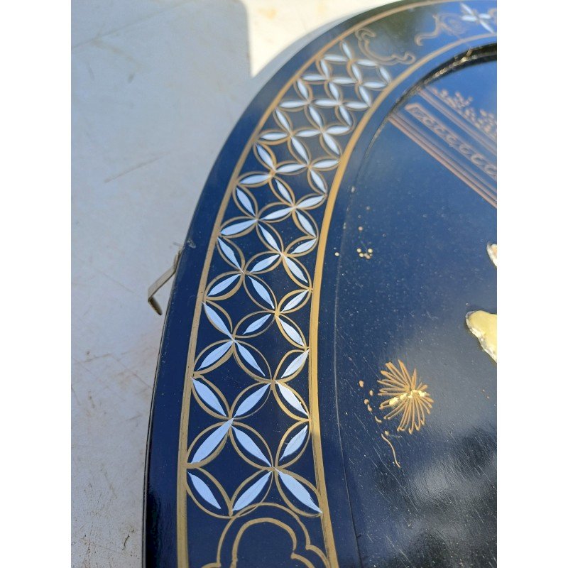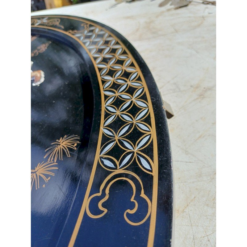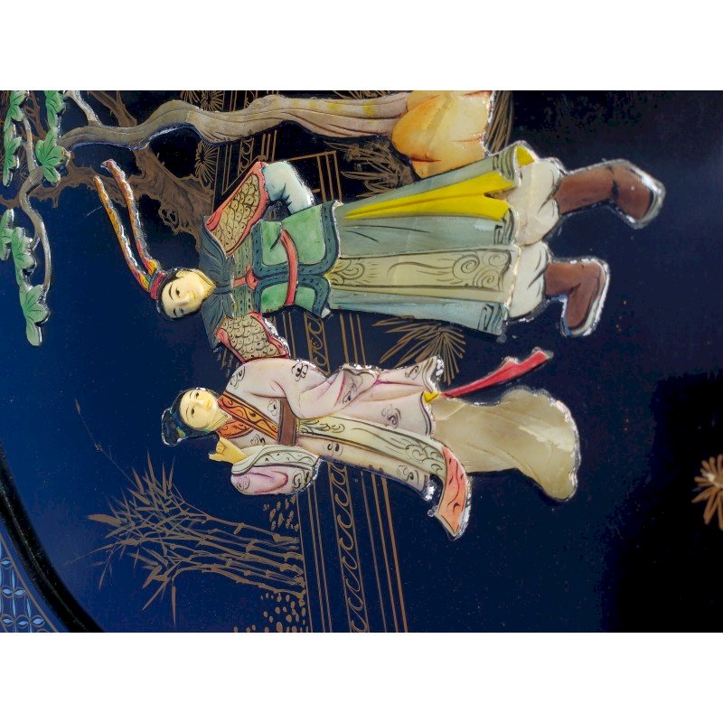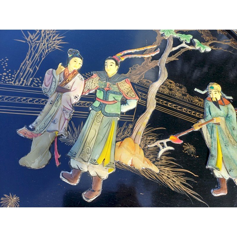 Panneau Laqué Noir et Or , rond Japonisant , Personnages et Végétations en Pierre dure et Os , Diam : 61 cm , épaisseur : 2 cm , poids : 3 Kg , trés bon ètat