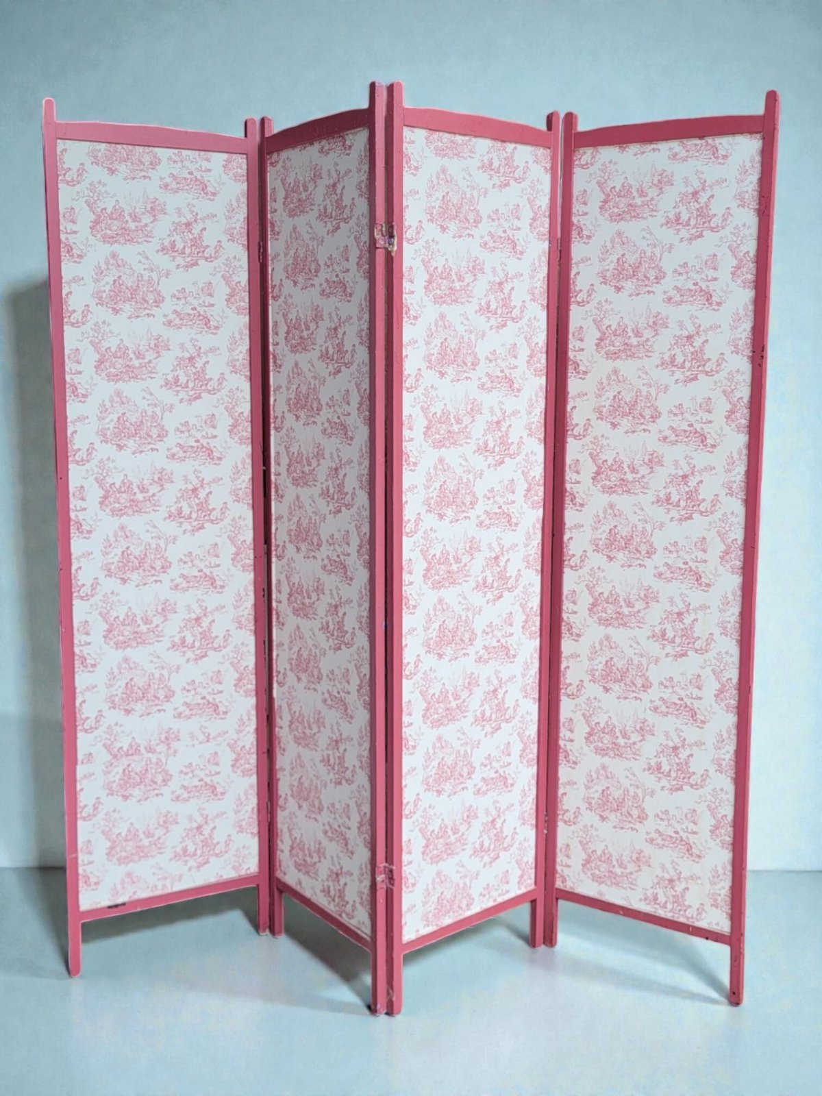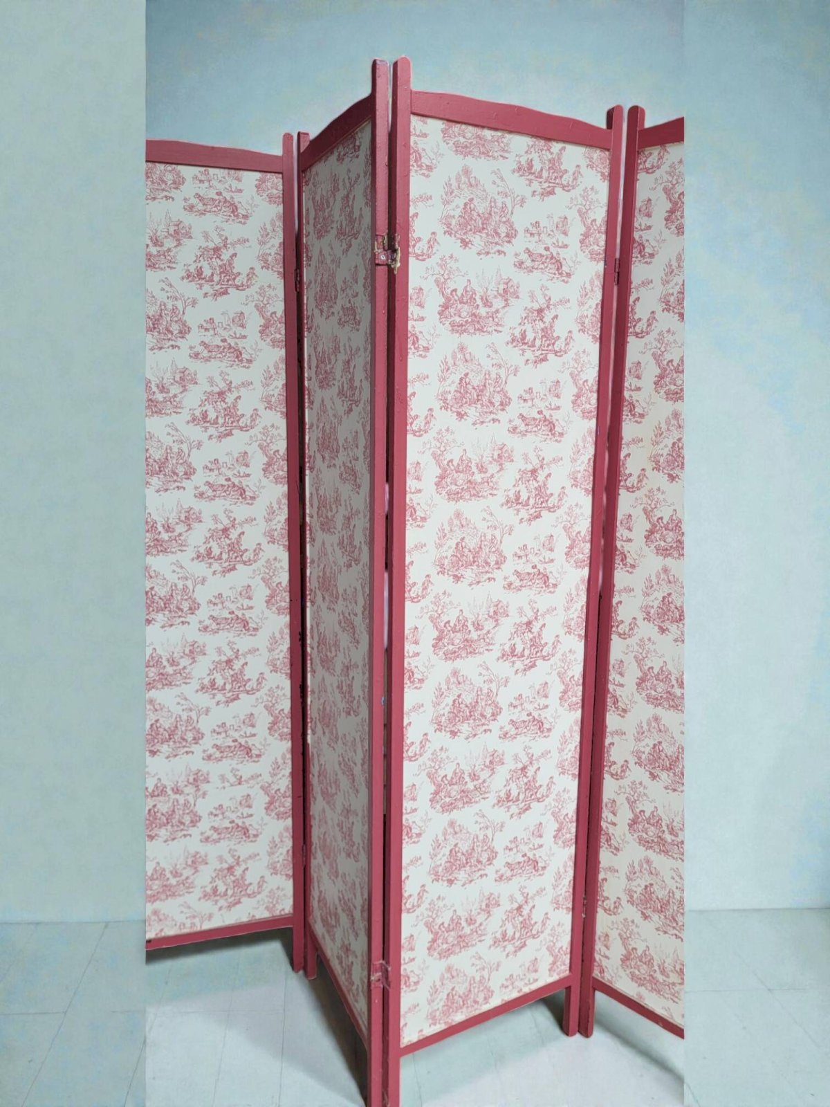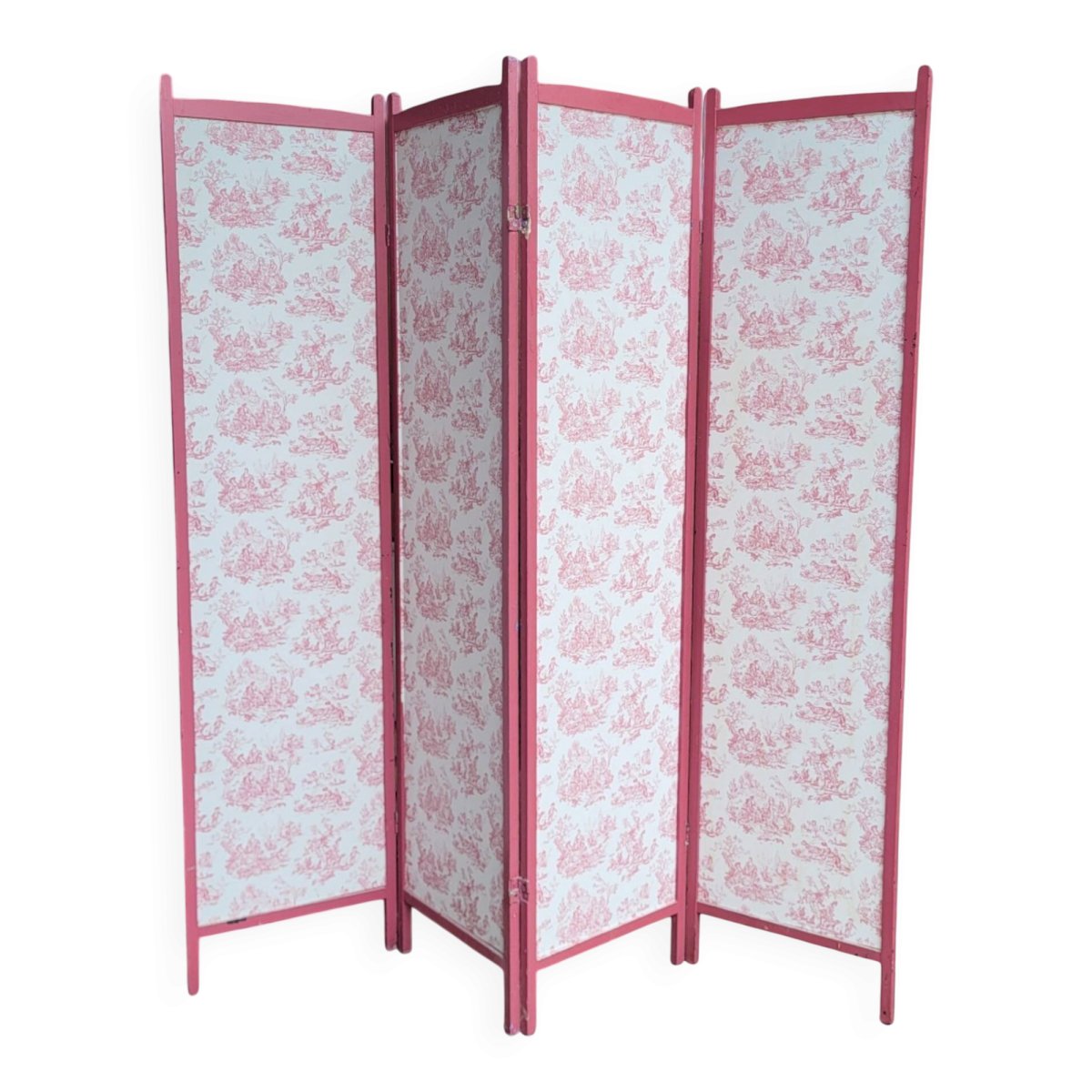 Paravent 4 feuilles tout en bois, peint et tapissé papier peint toile de jouy.Hauteur 170 cm.Largeur d'une feuille 42 cm.Traces d'usage et d'ancienneté.