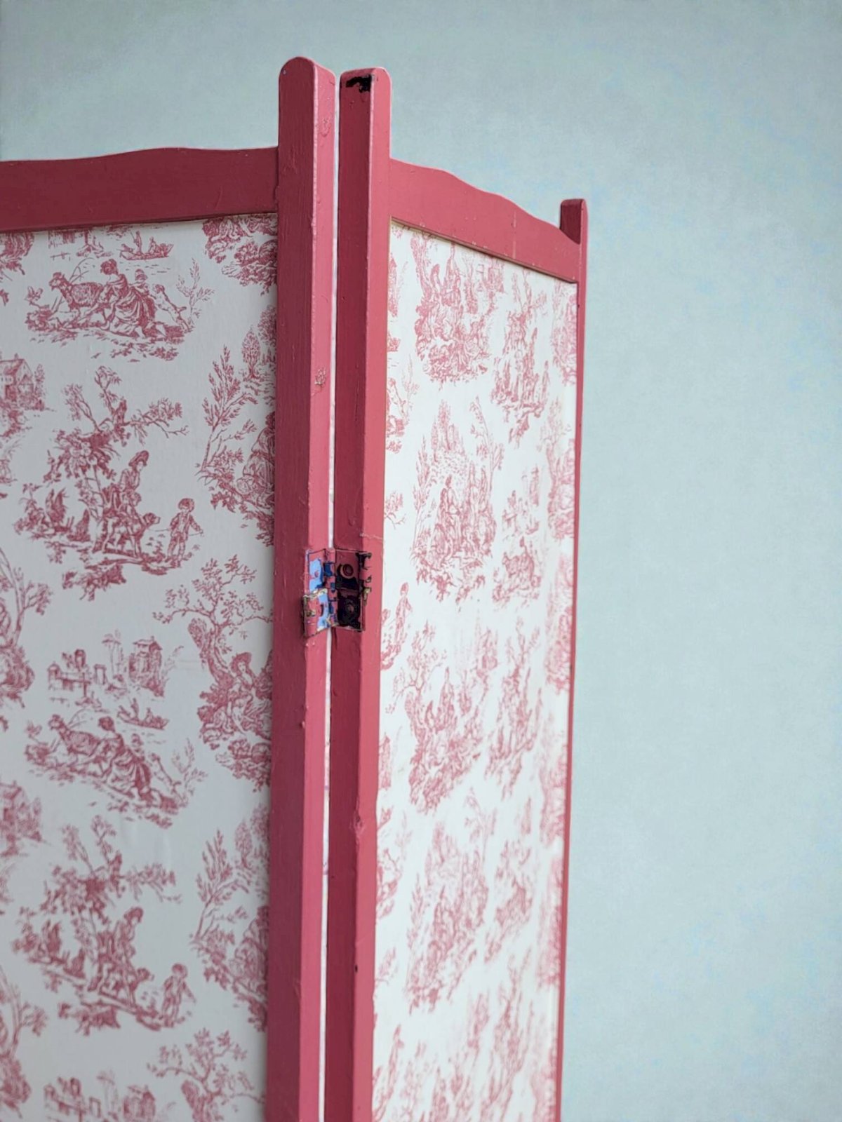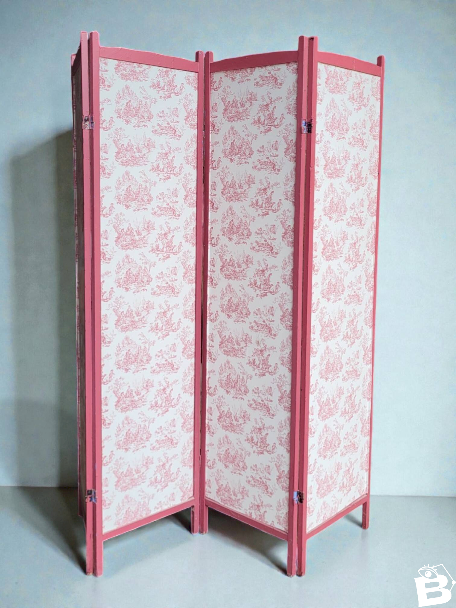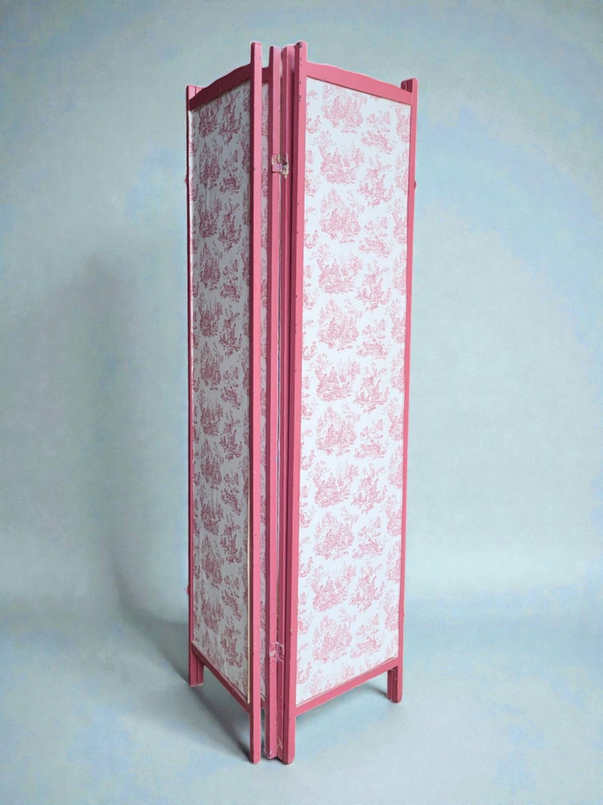Paravent 4 feuilles tout en bois, peint et tapissé papier peint toile de jouy.Hauteur 170 cm.Largeur d'une feuille 42 cm.Traces d'usage et d'ancienneté.