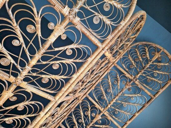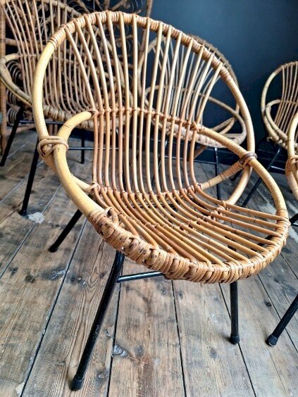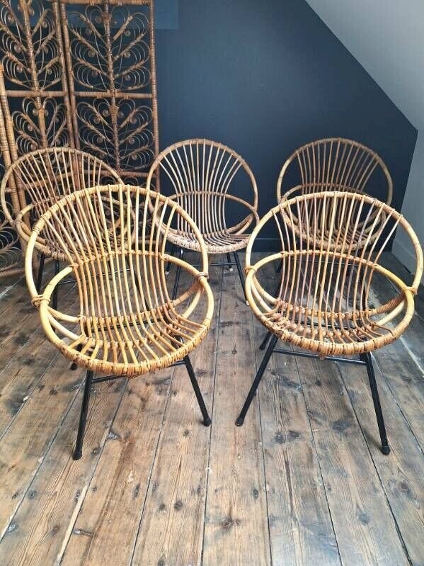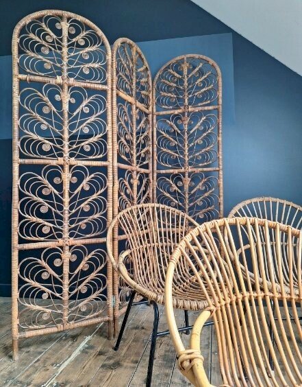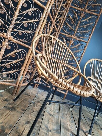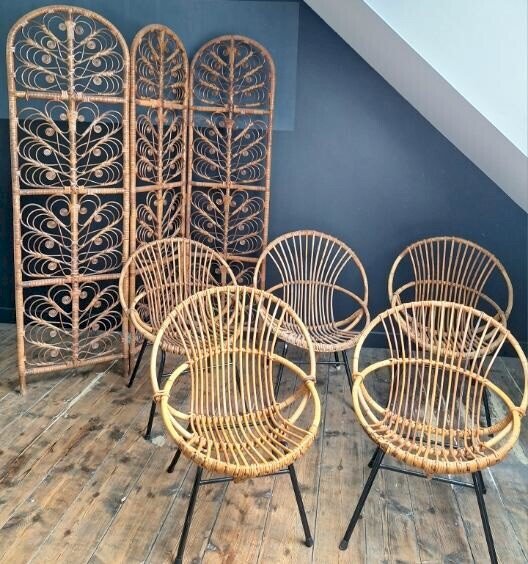 Merci de m’écrire si vous souhaitez me faire une offre. Le prix indiqué est pour le lot mais pas de souci pour ne vendre qu’une pièce. Paravent peacock vintage et sièges coquille rotin Prix du paravent 400€, prix d'un siège 70€. Dimension du paravent 155xh180cm. Quelques brins manquants ou dénoués mais très bel état général. Prix 400€. Taille adulte pour les fauteuils, dimensions moyennes 60x60xh77, assise 38cm. Pieds compas en métal. Quelques traces normales d’usage et d’âge (notamment sur les pieds, quelques cerclages manquants, brins réparés) mais bon état général (cf photos). Prix à l'unité 70€. Remise à mon domicile ou possibilité de livraison par transporteur (ex 50€ pour le paravent et 30€ pour un fauteuil vers Paris et région parisienne, me contacter pour d’autres destinations). Les délais de livraison de 2 à 4 jours sont imposés par et sont donc donnés à titre purement indicatif. Rétro oeuf salon jardin chaise