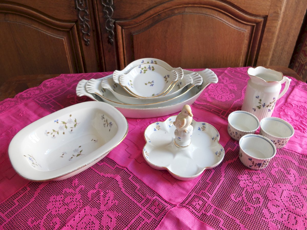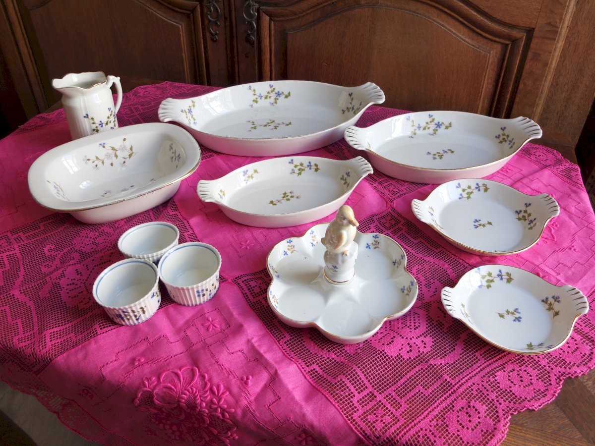 Partie de service de table ancien décor aux barbeaux (ou bleuets) en porcelaine à feu L.L. et porcelaine de Bayeux, liseré doré. Vintage. Différents modèles (fleurs).