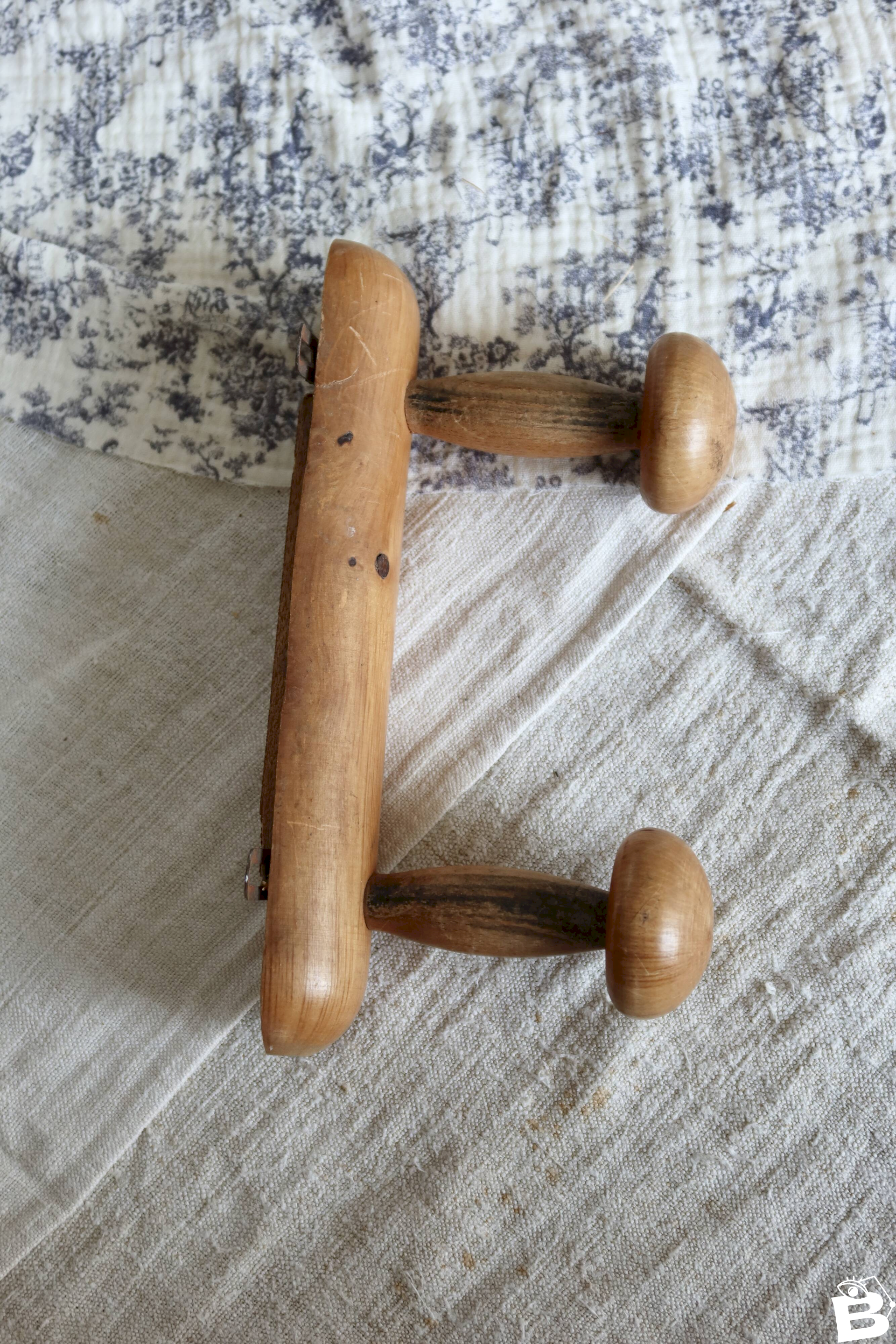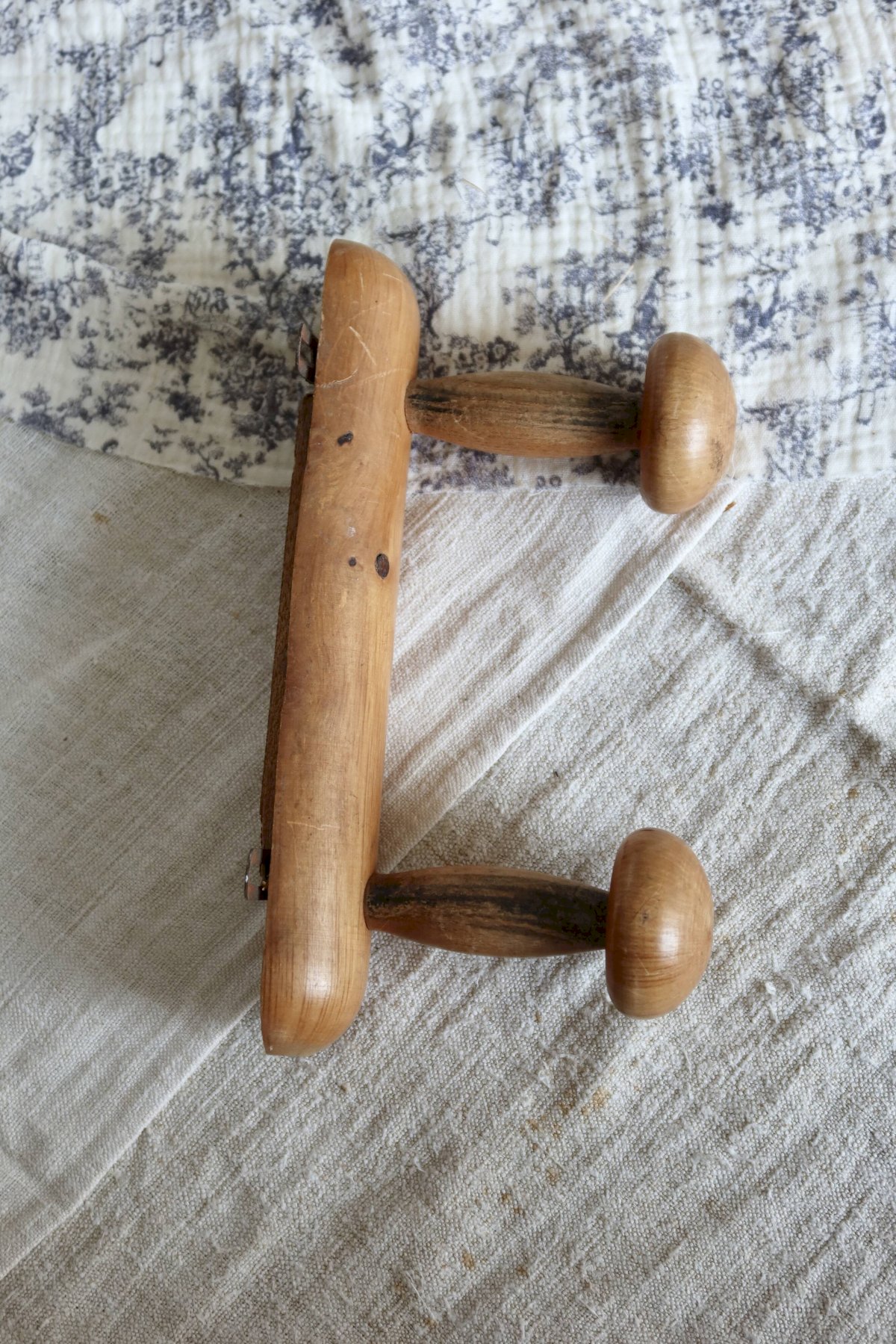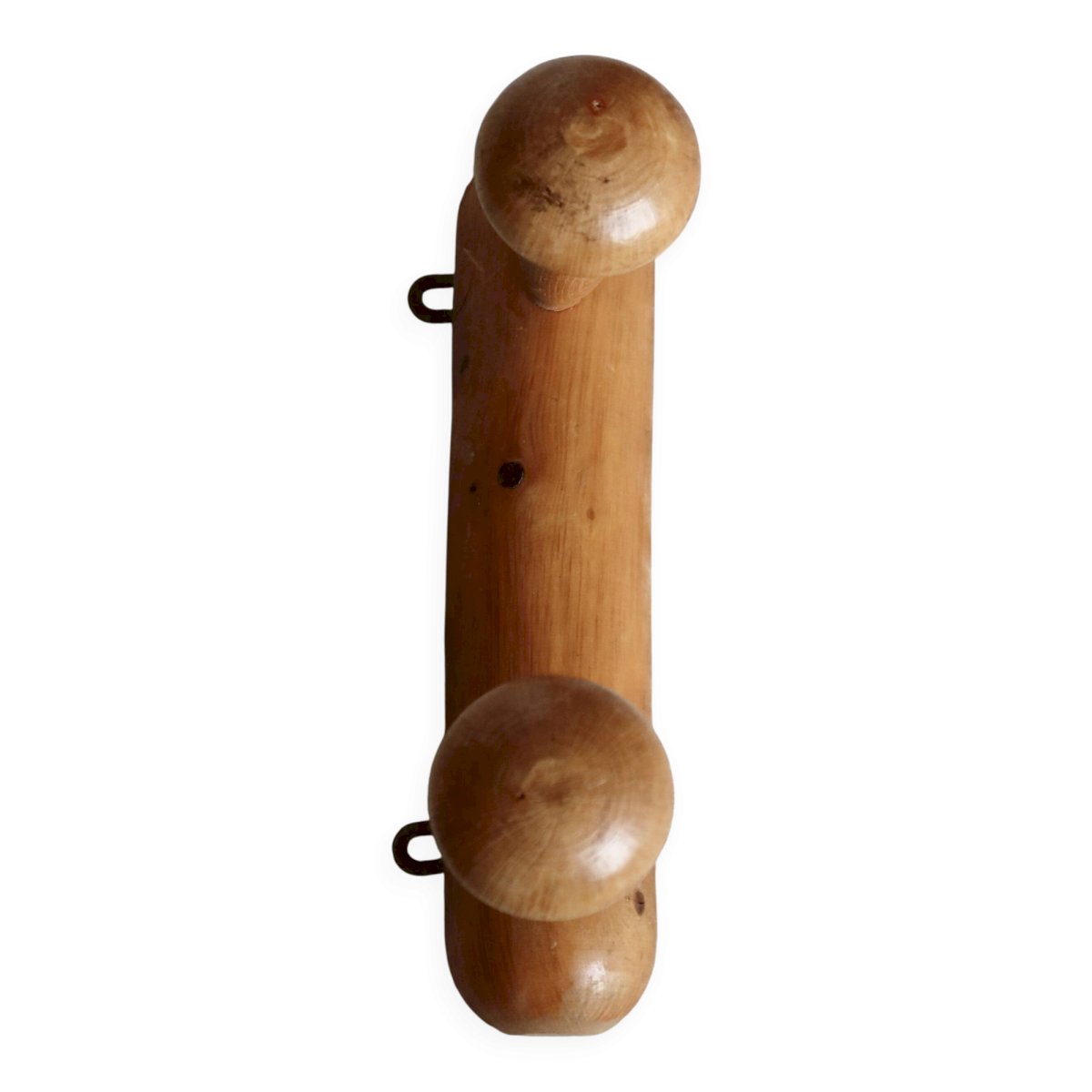 Patère ancienne en bois massif équipée de deux crochets ronds tournés, au charme rustique et authentique.