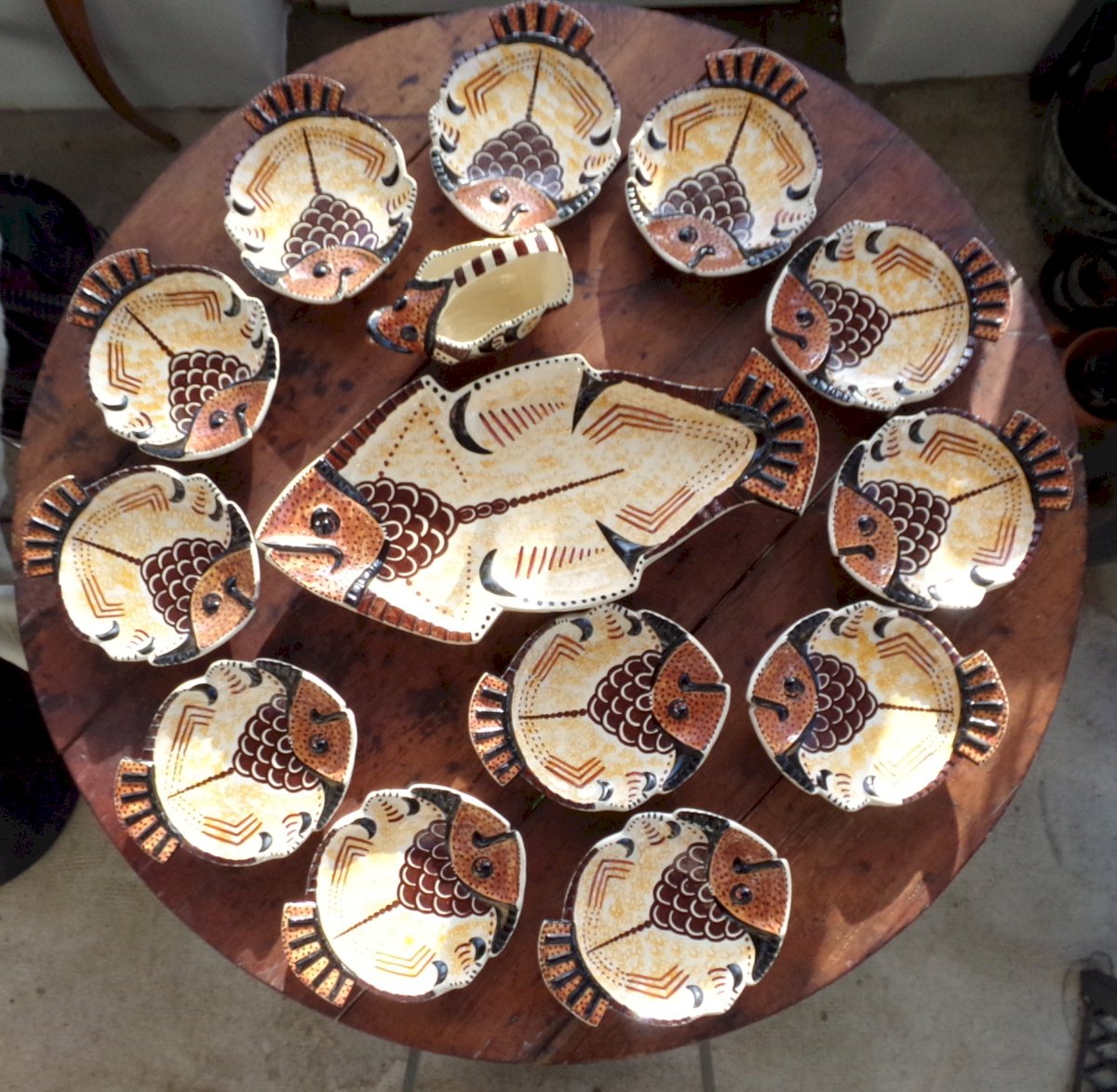 Mid-Century Paul Fouillen Quimper Service à Poissons Complet Beige/Jaune/Marron Terrecuite