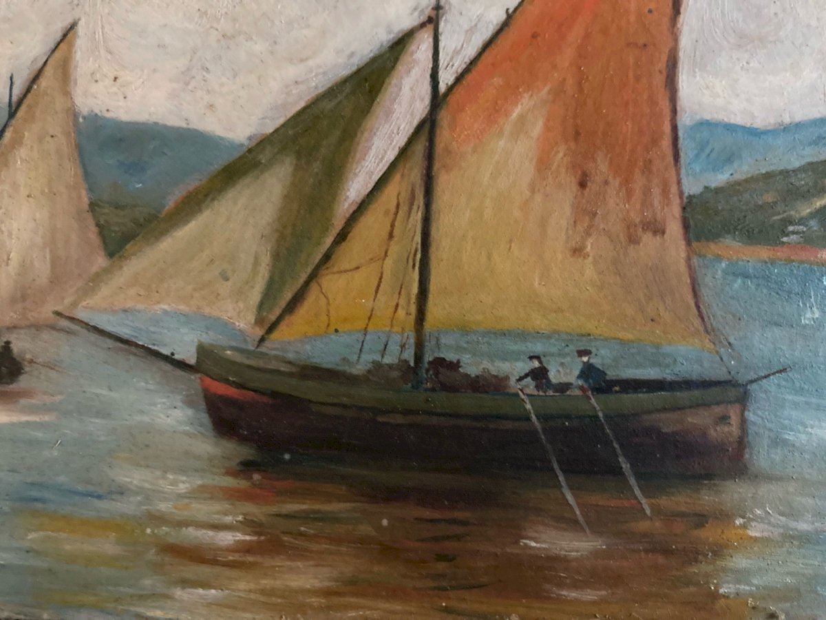 Peinture 1940 Huile sur carton Mer bateau Bretagne ? Signé Brugel Art