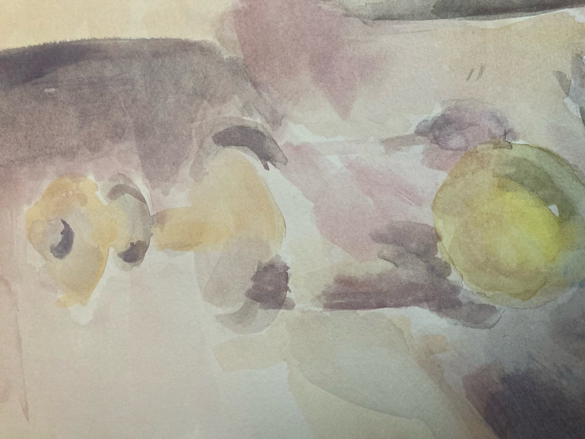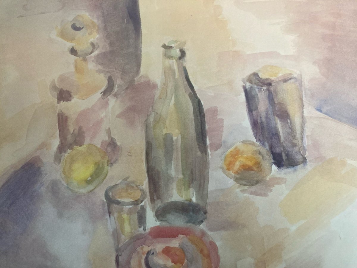 Peinture 1970 Gouache Papier Post Cubisme Nature Morte Citron Bouteille