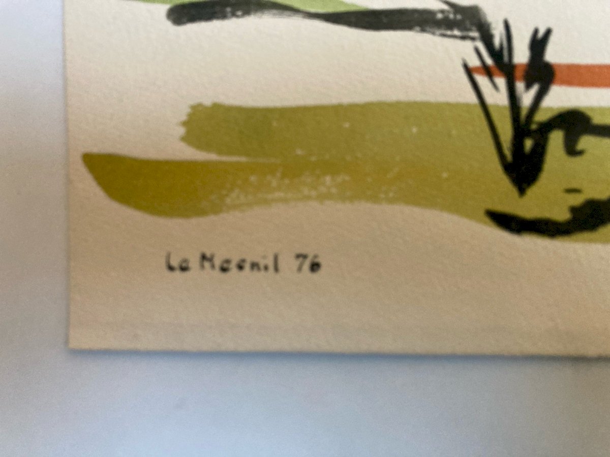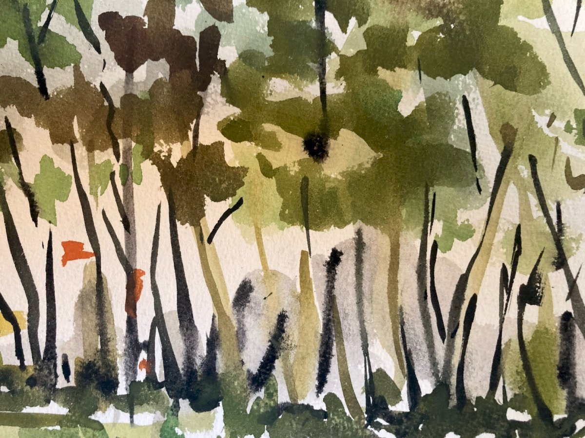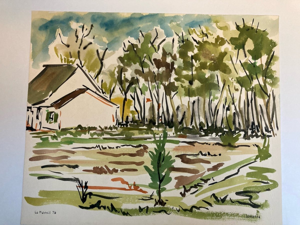 Peinture 1976 Papier Gouache Aquarelle Le Mesnil À Identifier Paysage Art Wagrez