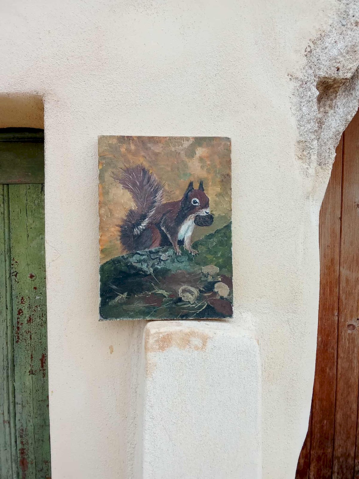 Charmante huile sur toile représentant un petit écureuil roux, pleine de douceur et de vitalité.
