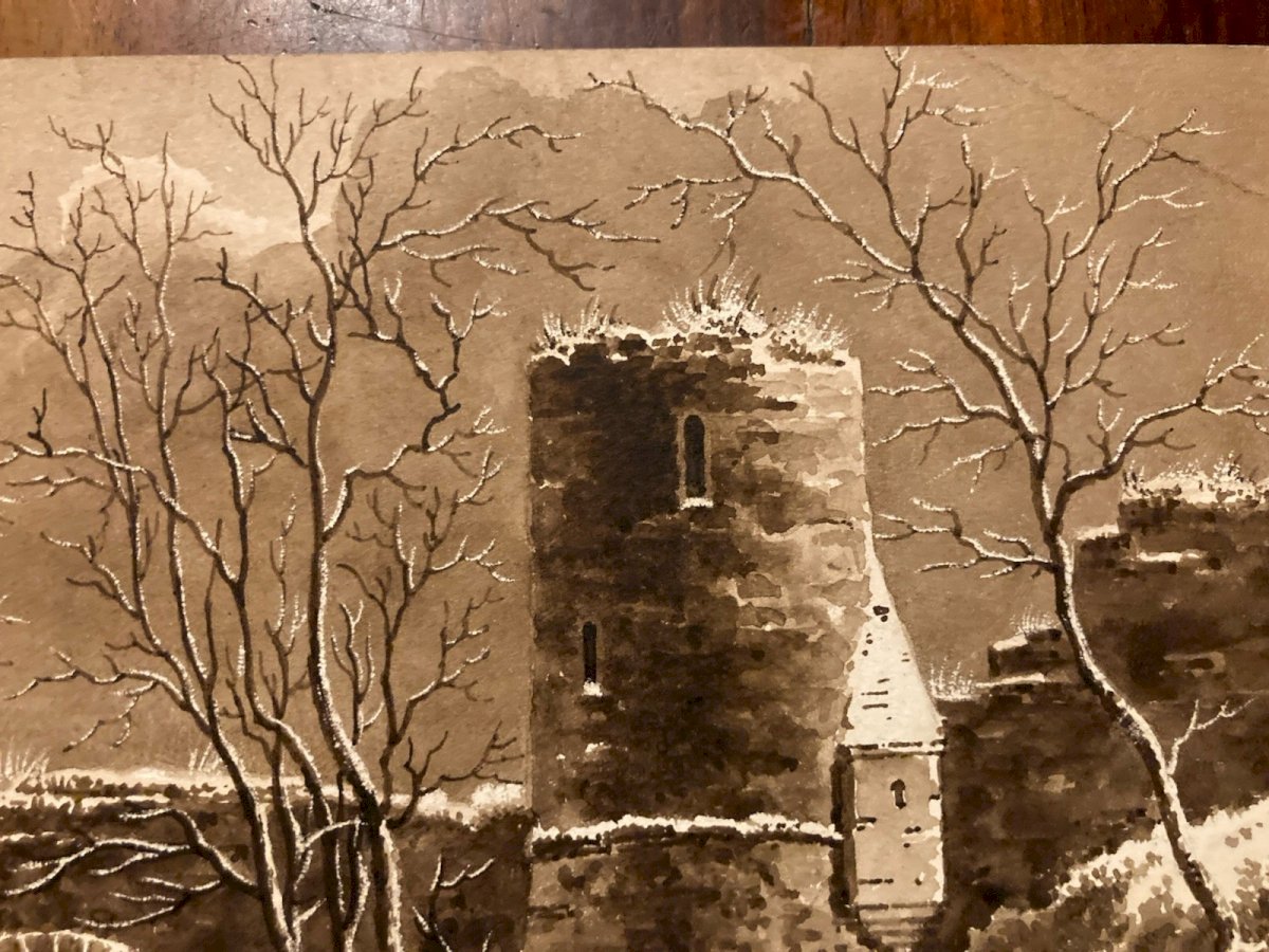 Peinture Dessin XIXe 1820 Encre Lavis Château Chevalier Ruines Ancien Art Porche