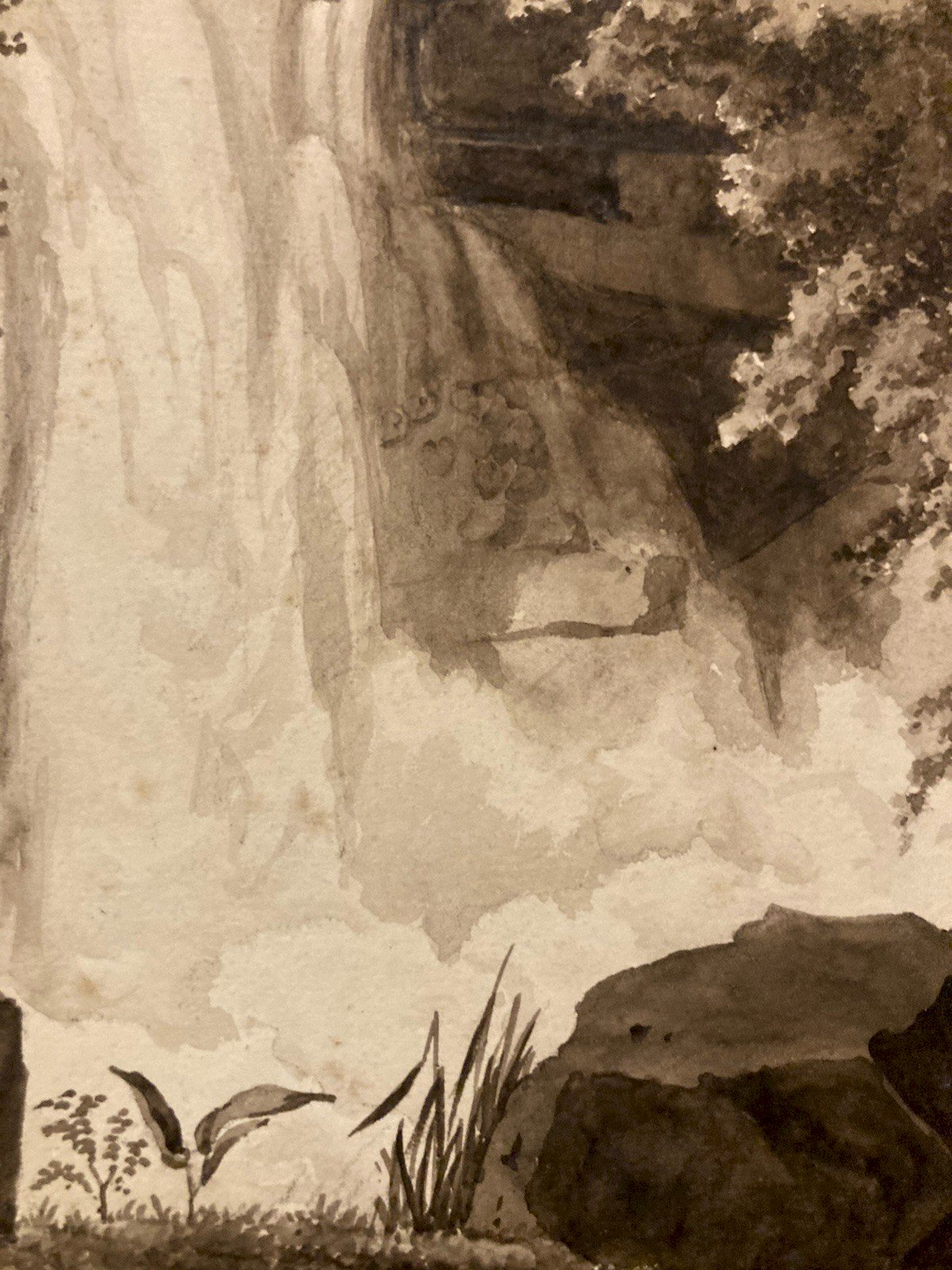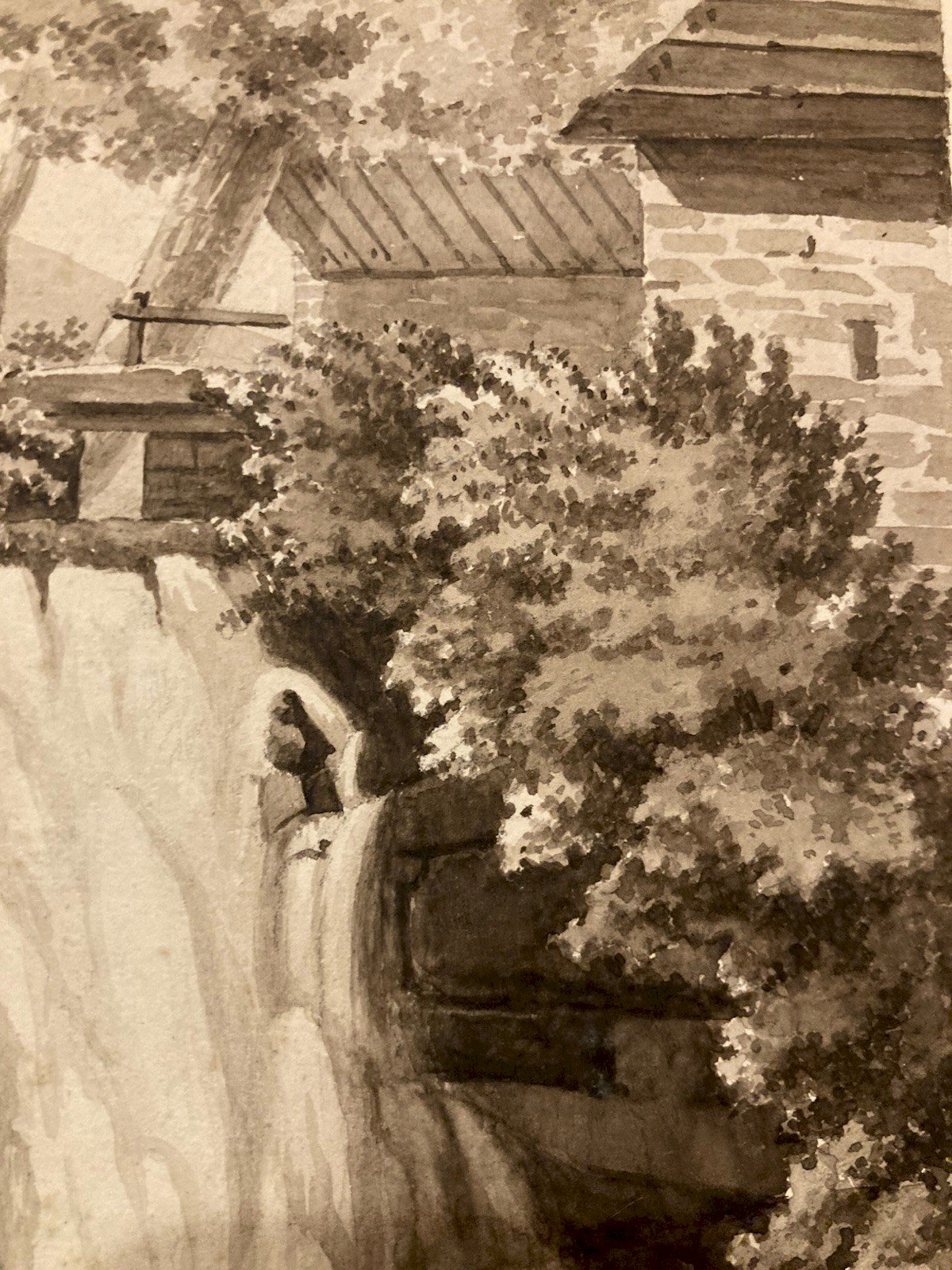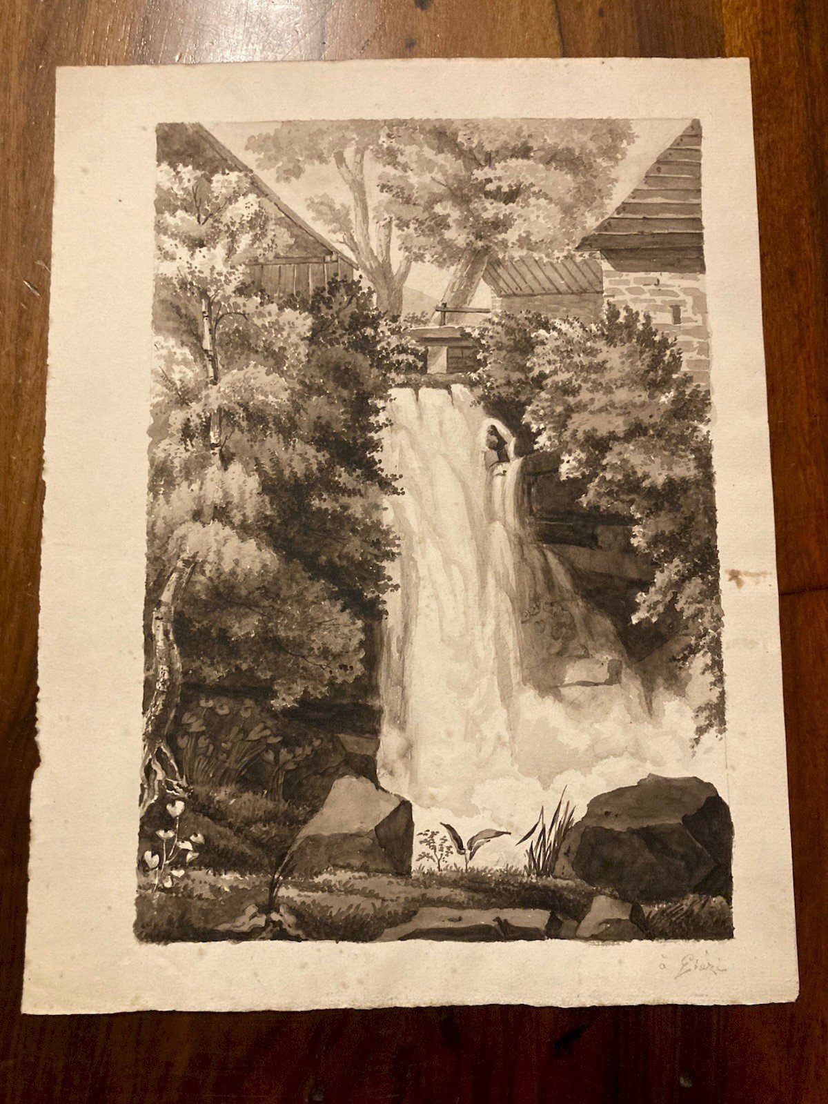 Peinture Dessin XIXe 1850 Encre Lavis Chute Eau Riviere Nature Ancien Suisse ?