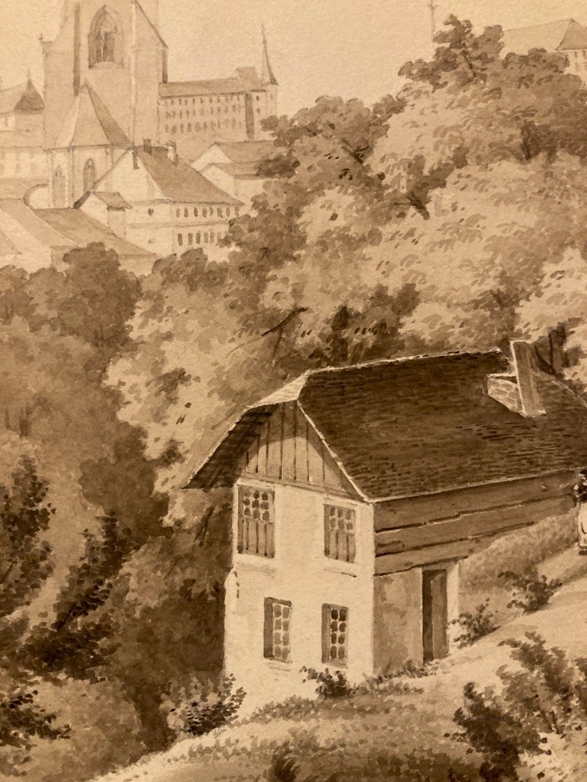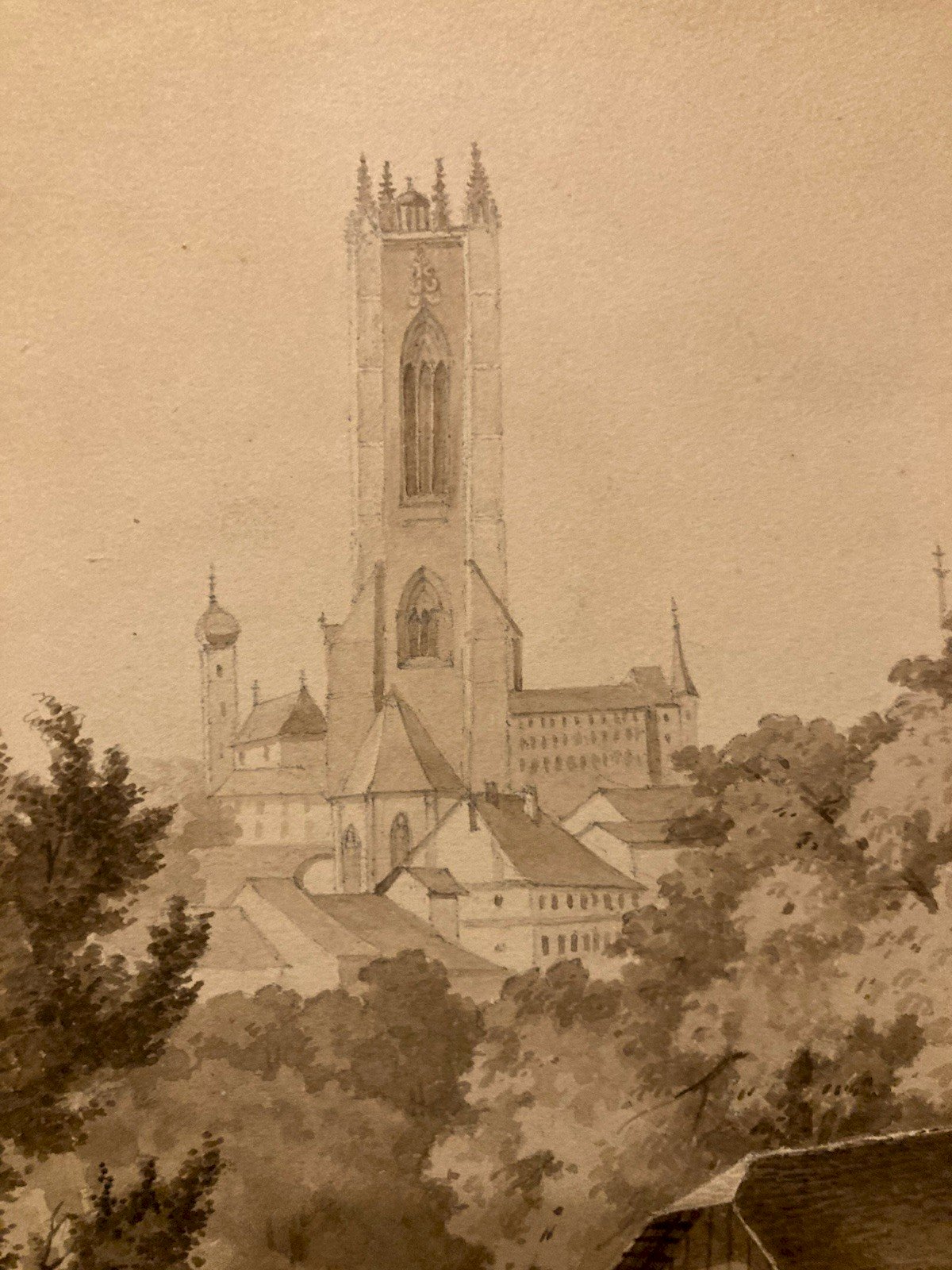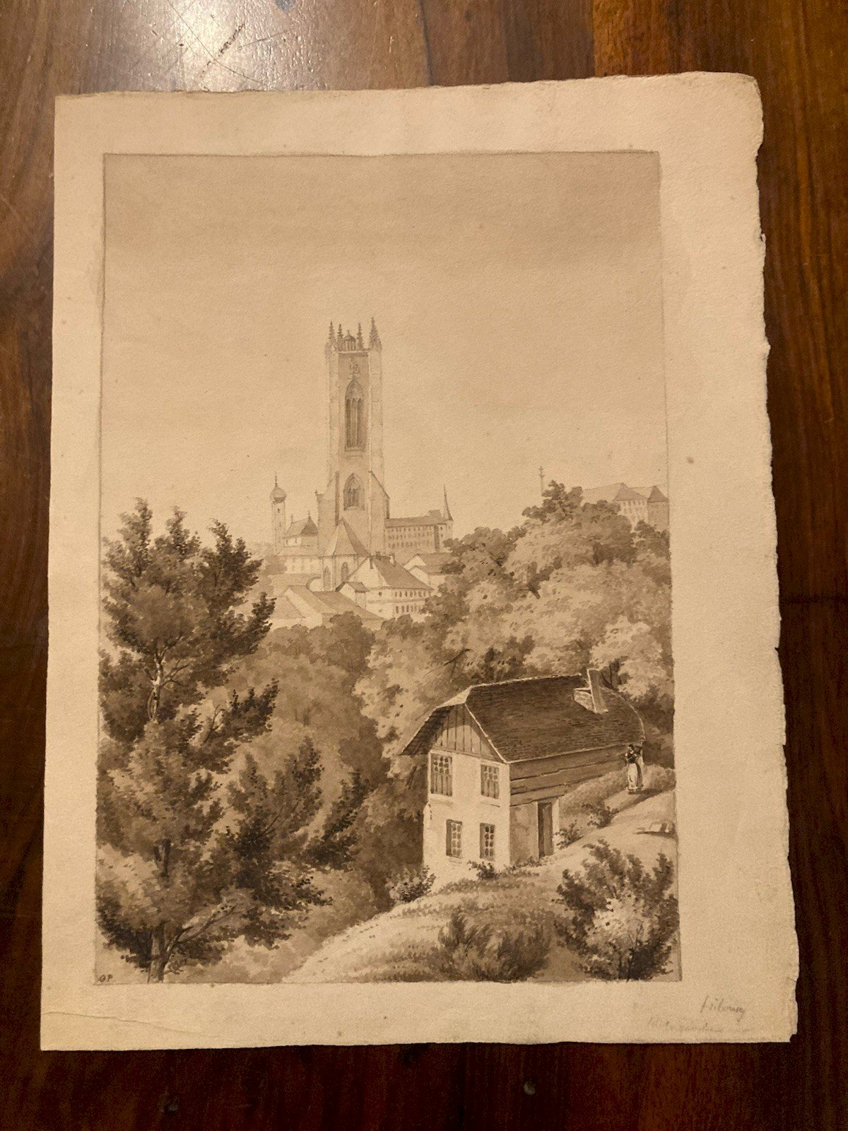 Peinture Dessin XIXe 1850 Encre Lavis Eglise Cathédrale Fribourg Ancien Suisse