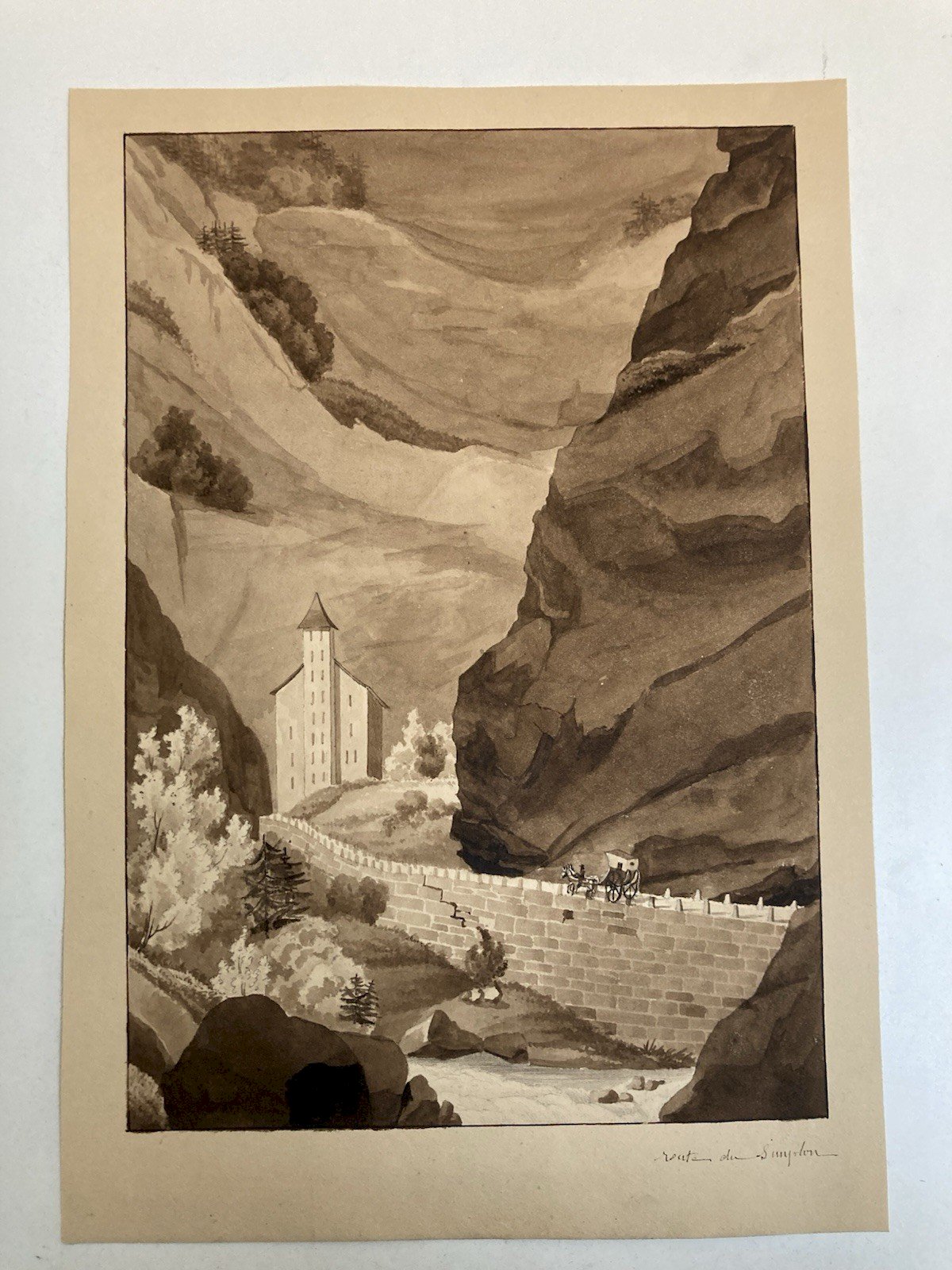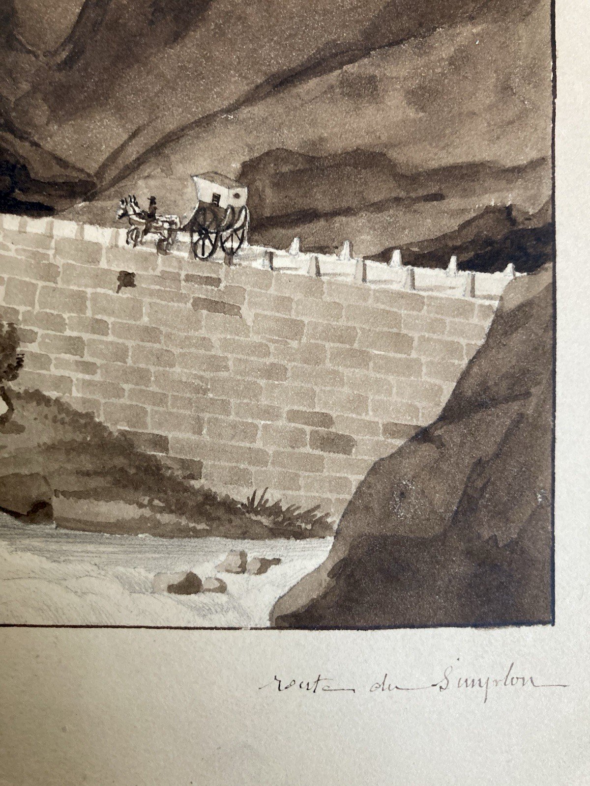 Peinture Dessin XIXe 1850 Route De Simplon Tour Stockalper à Gondo Suisse Ancien