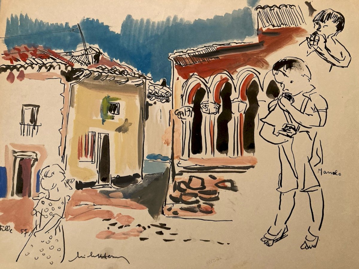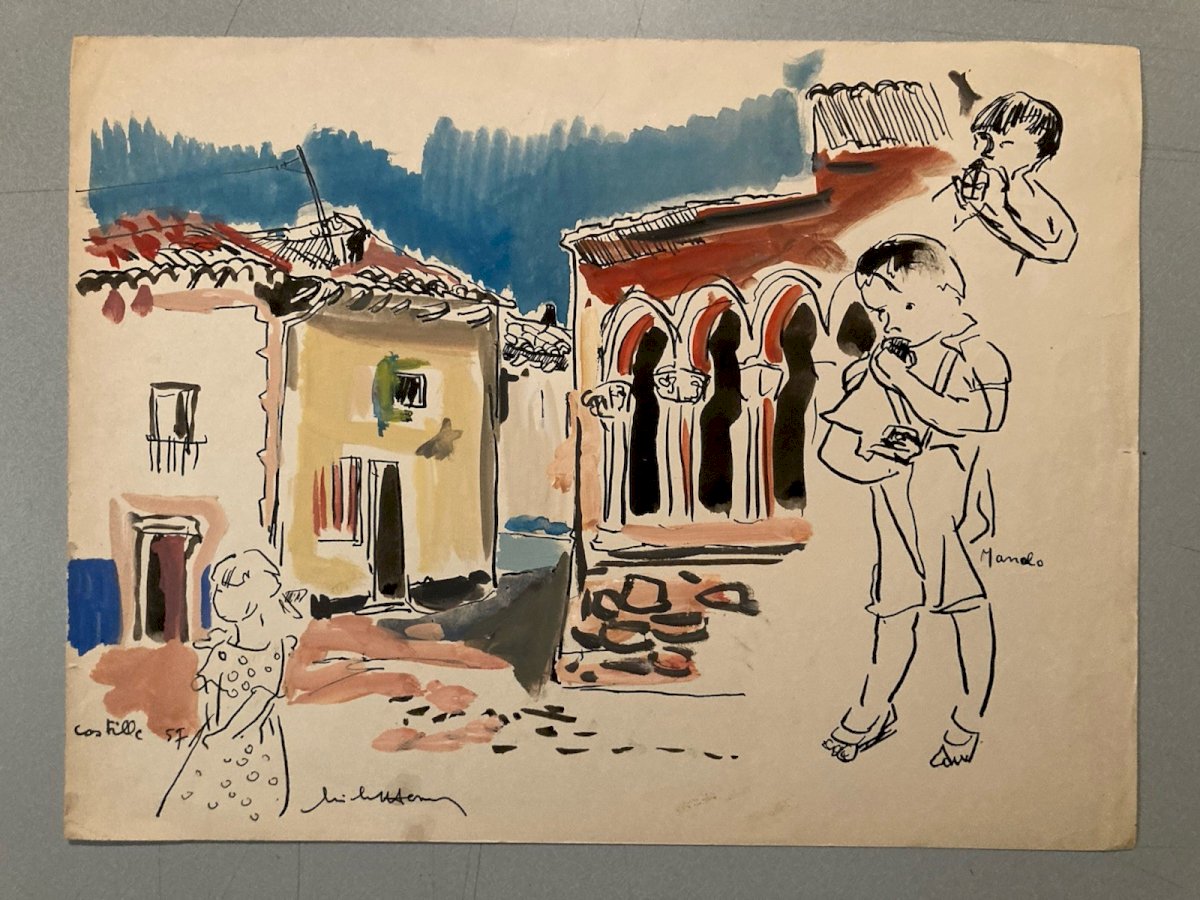Peinture gouache Michel Henry 1955 Castille Espagne Enfant Ancien Art Dessin XXe
