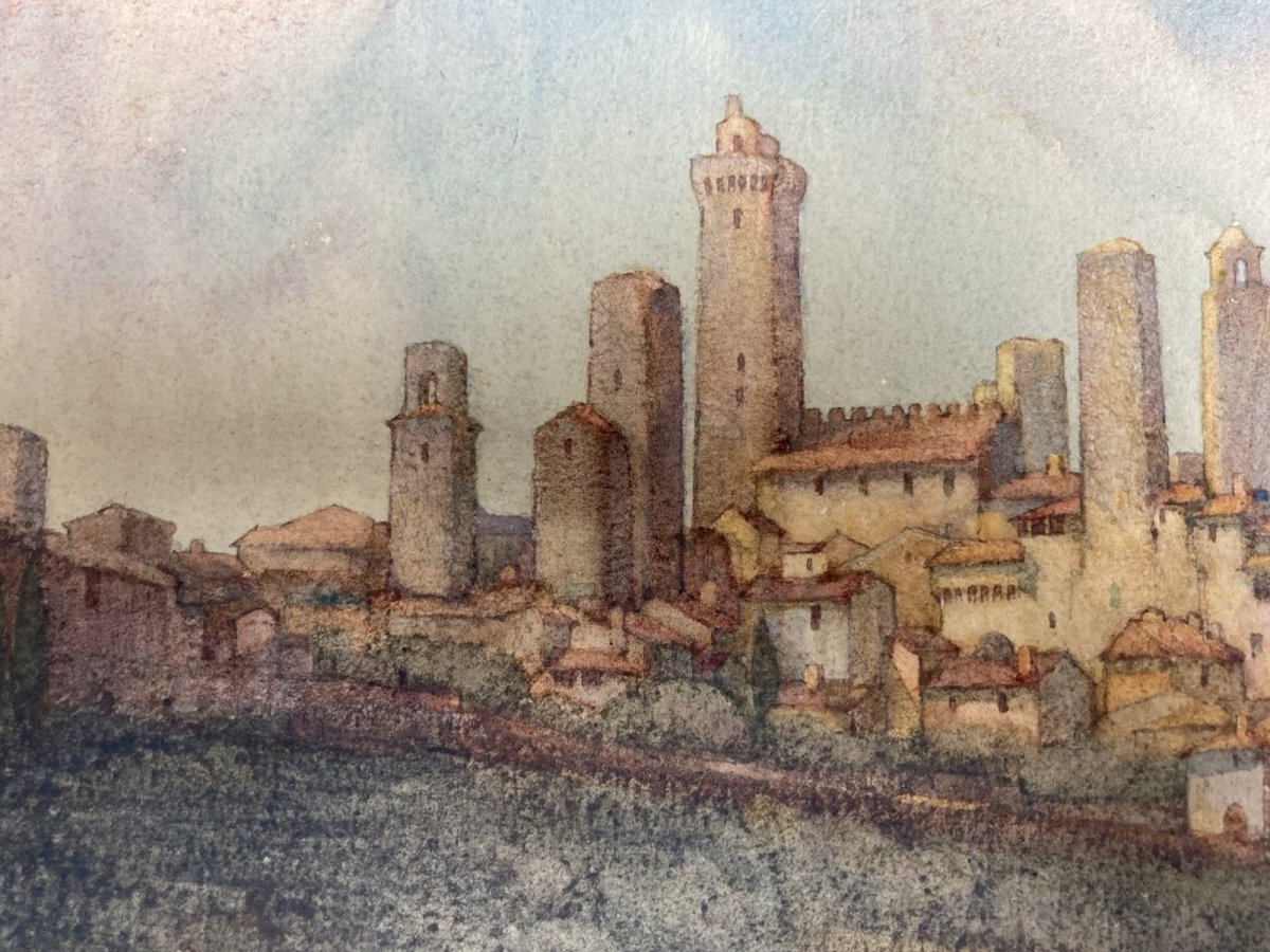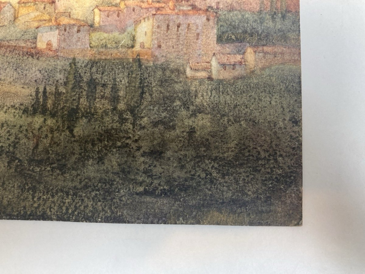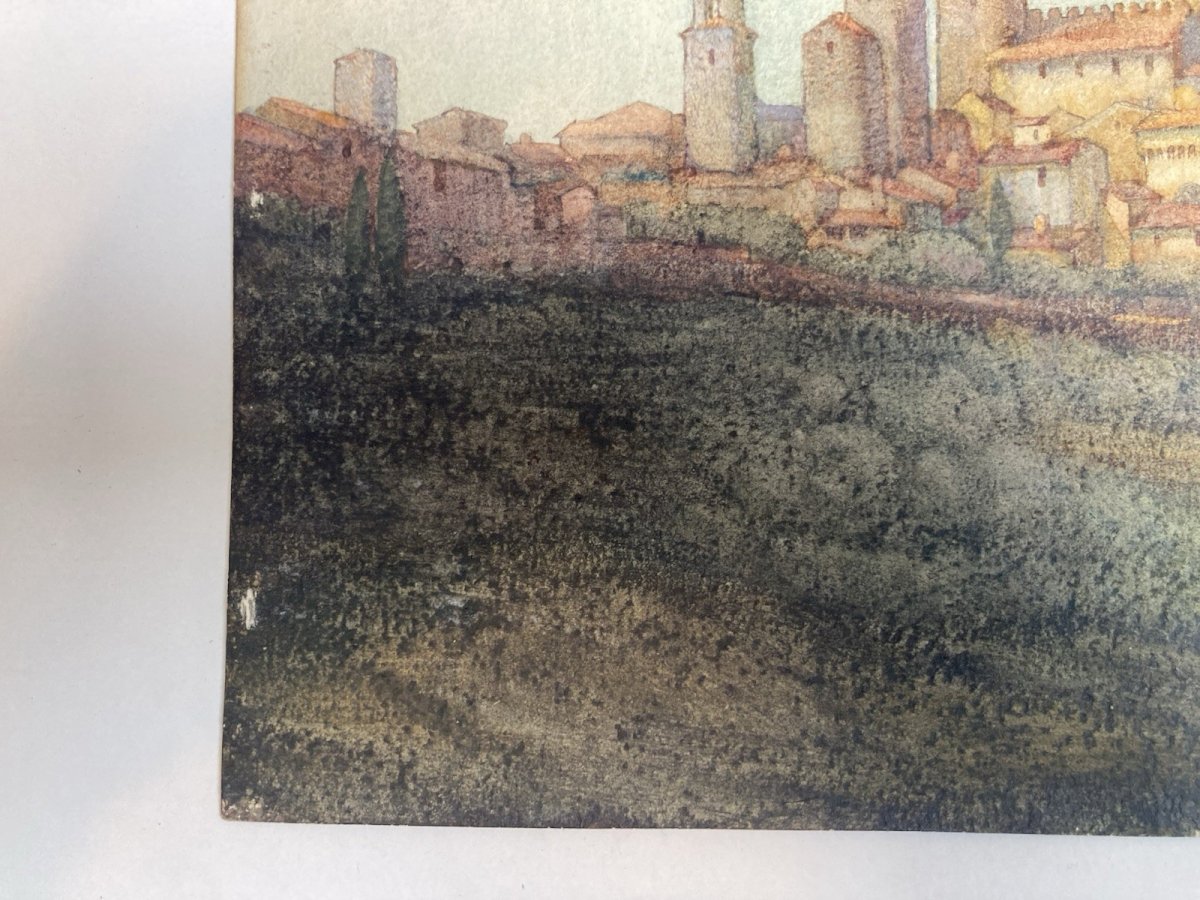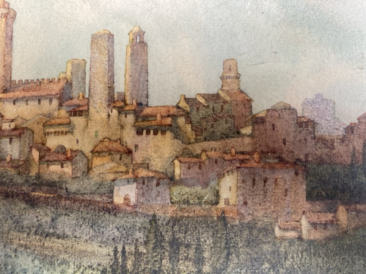 Peinture gouache Papier Paysage Toscane Italie XIXe Art San Gimignano Ancien
