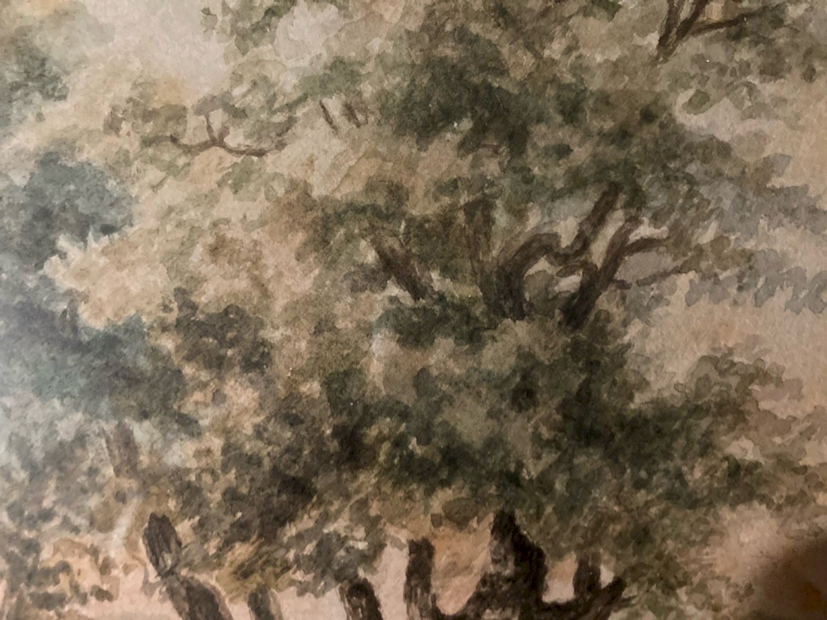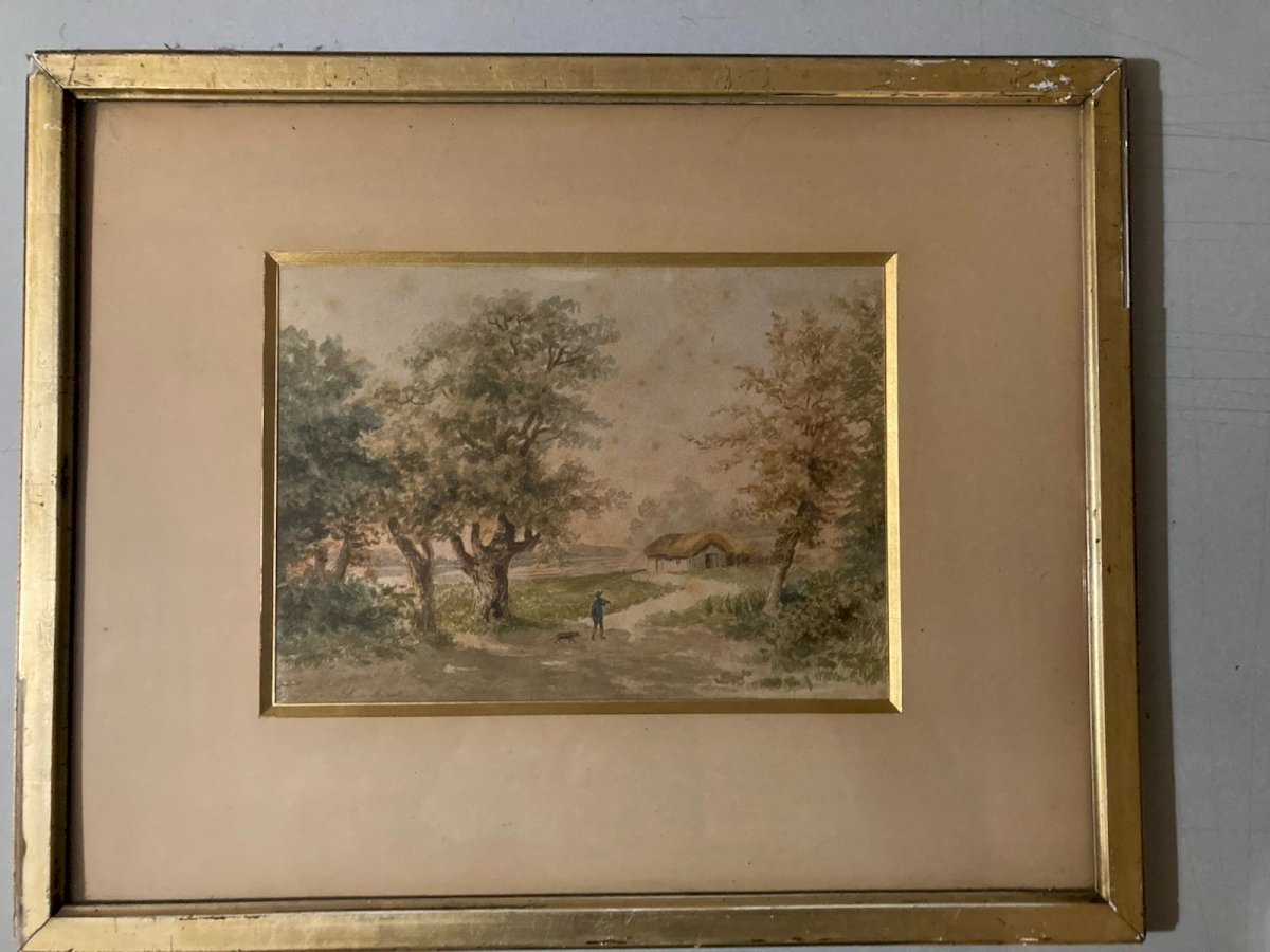 Peinture Gouache Papier XIXe Retour De Chasse Homme Fusil Ancien Chien Art