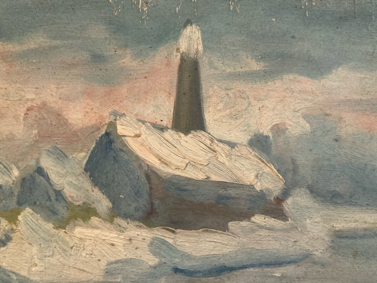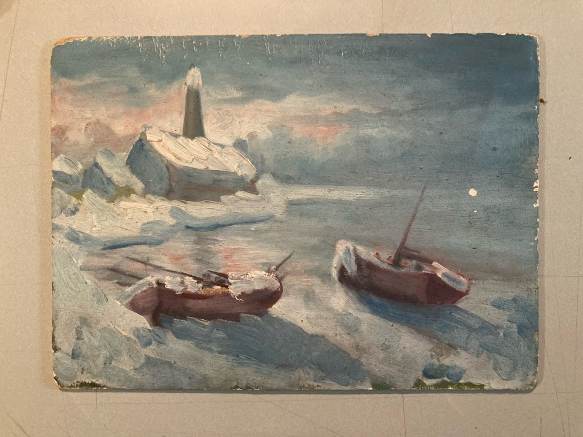 Peinture Huile Panneau Carton Hsp Debut XXe Maison Neige Mer Bateau