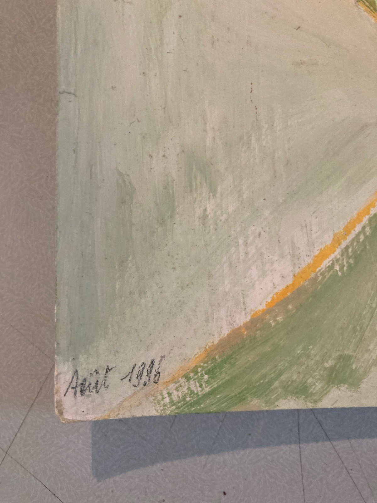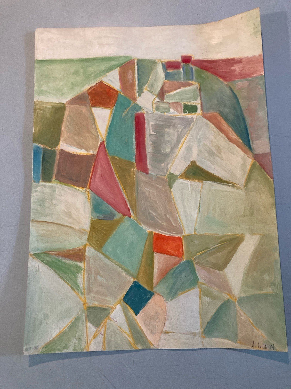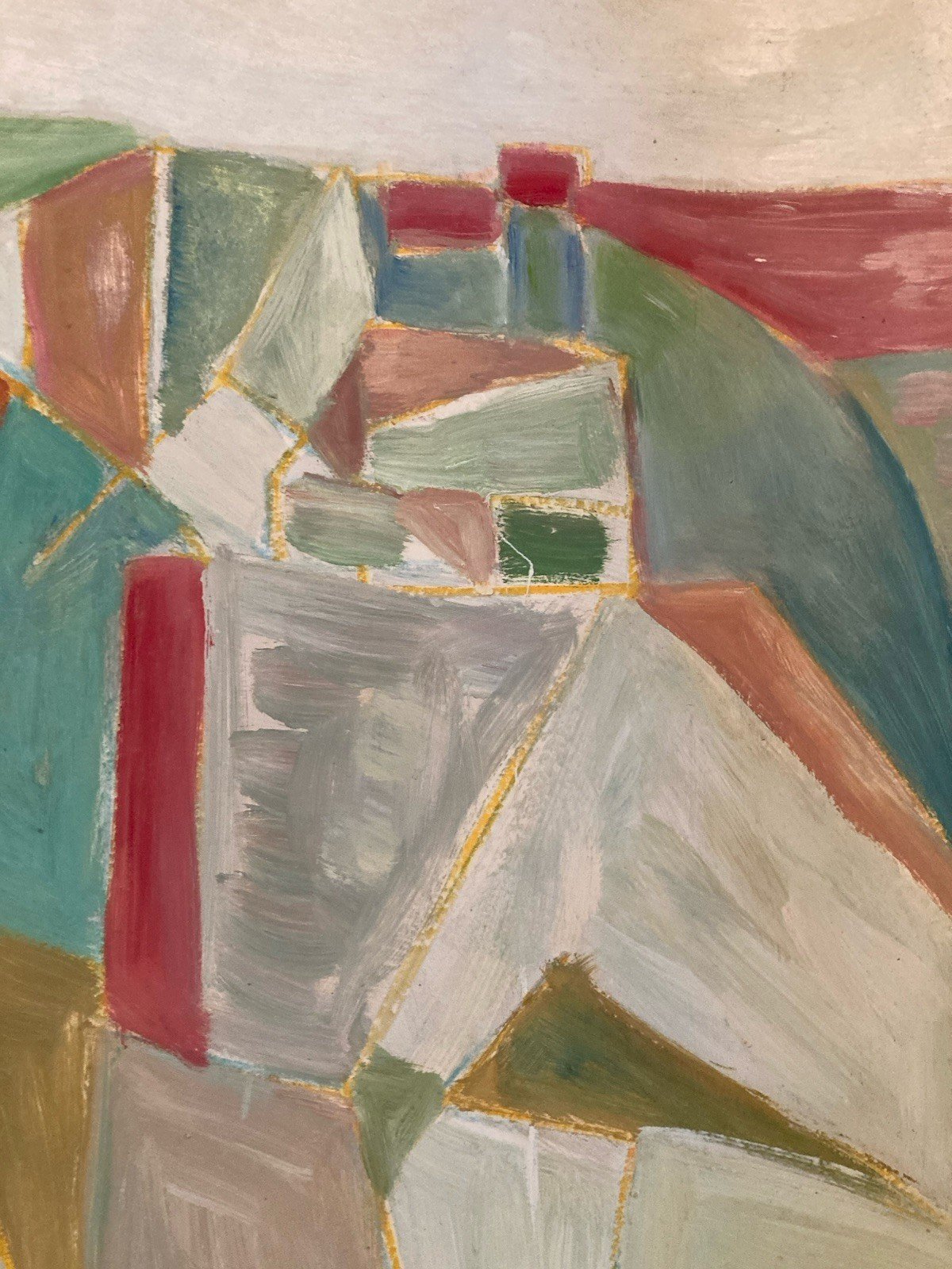 Peinture Huile Papier Abstrait Abstraction 1980 Paysage Art Cubisme