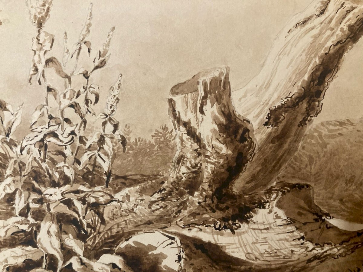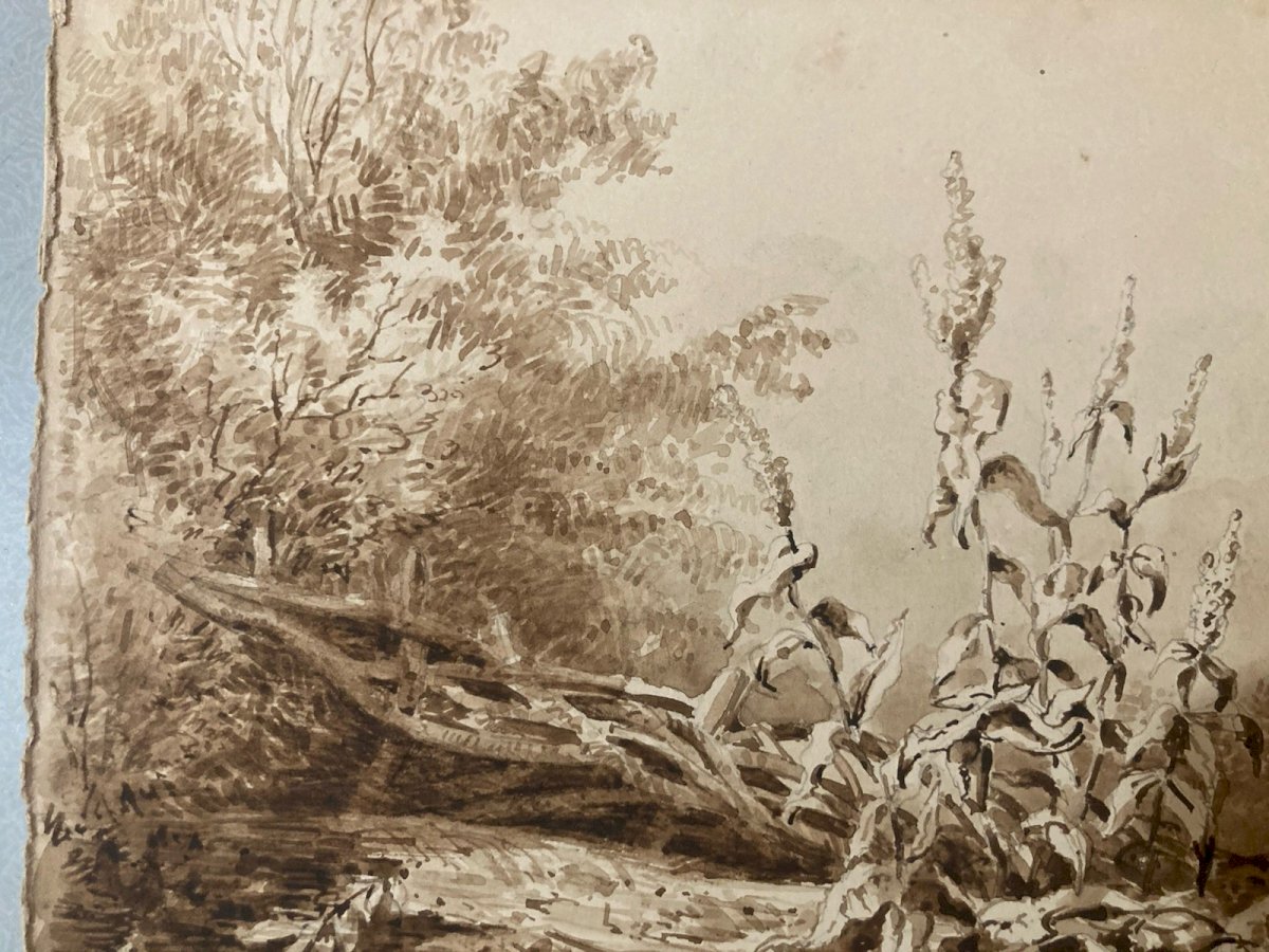 Peinture Lavis Encre Sur Papier XIXe 1850 Forêt Paysage Plante Tronc