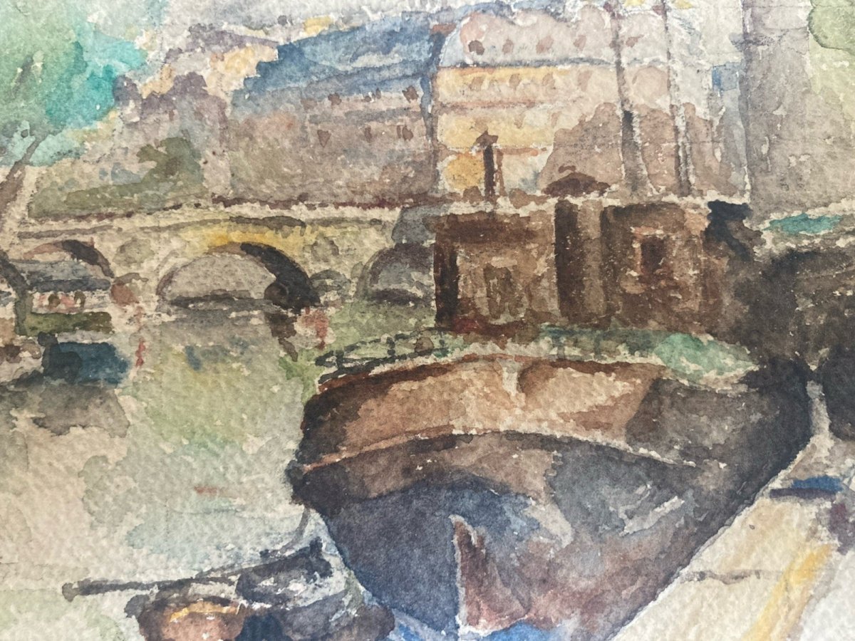 Peinture Seine Paris Quai Aquarelle 1950 Bateau Art Péniche À Identifier