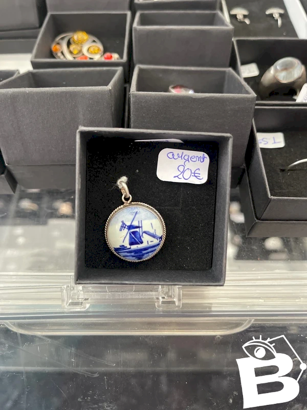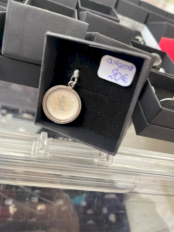Pendentif rond en argent émaillé vert décor de papillon et fleurs