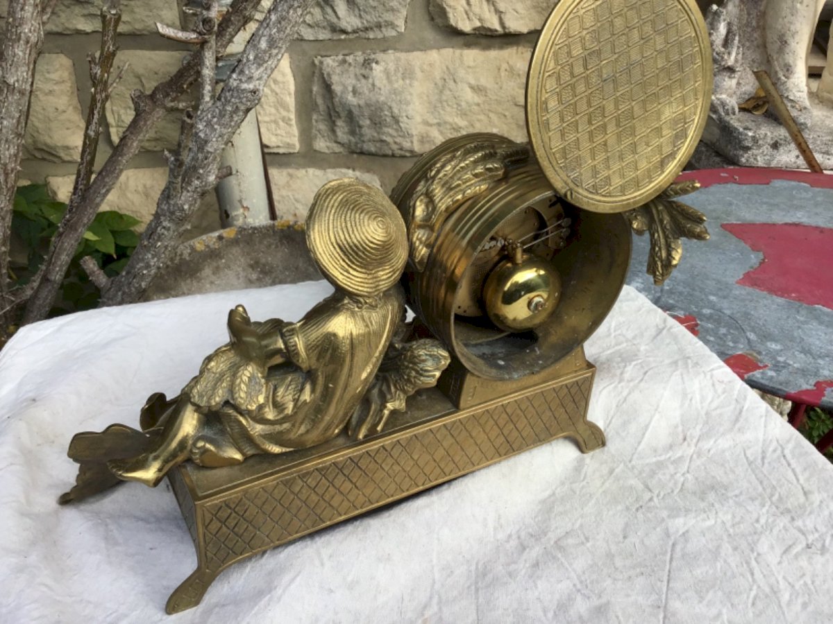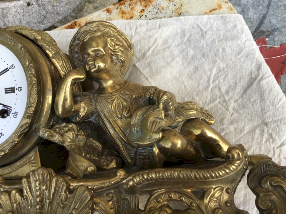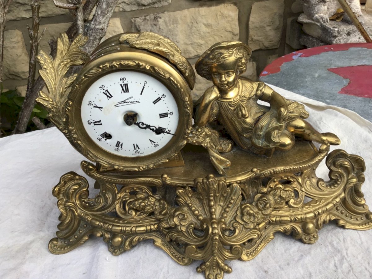 Pendule de cheminée XIXe Napoléon III bronze doré –  Superbe pendule de cheminée d’époque Napoléon III en bronze doré, décor enfant Le modèle représente un jeune enfant assise avec gerbe blé surmontant un cadran émaillé à chiffres romains. Base richement décorée de scènes en relief dans le goût du Second Empire. Mouvement mécanique d’origine,  Sonnerie sur cloche (heures et demi-heures). Cadran émaillé, aiguilles ajourées XIXe. Lunette vitrée manquante. → mécanisme à réviser (nettoyage/huilage conseillé). Couleur:Doré Type:Pendule à poser Période:XIXème et avant Pays d'origine:Italie Matière:Bronze Style:Napoleon III Forme:Fantaisie