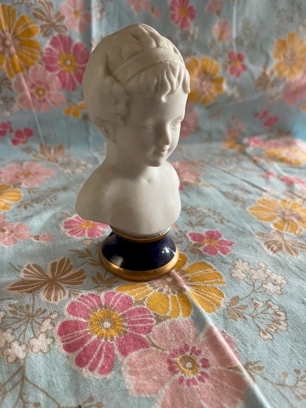 JOLI PETIT BUSTE PETITE FILLE BISCUIT socle Bleu de Four Objet de Vitrine déco