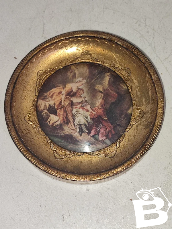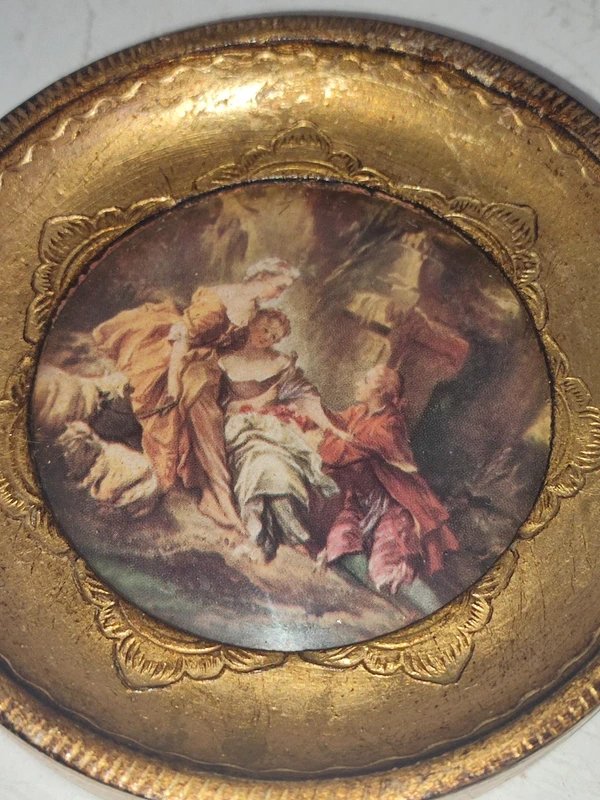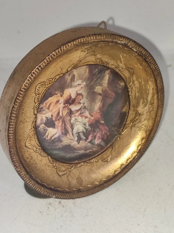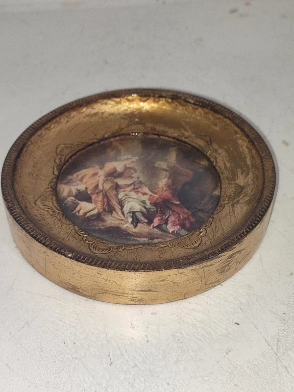 petit cadre ancien avec image en fond style 18-19eme en bon etat un peu d'usures de la dorure du cadre (voir photos) diametre 10cm...