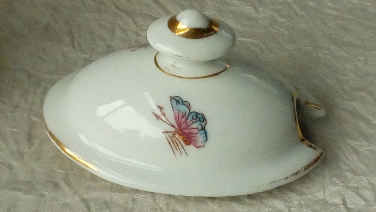 CHARMANT PETIT MOUTARDIER EN PORCELAINE MODÈLE SUR DORMANT DECOR DE PAPILLONS ET FLORAL HAUTEUR 10 cm LONGUEUR 14 cm LARGEUR 9 cm ÉCLAT A L’INTÉRIEUR DU COUVERCLE INVISIBLE UNE FOIS CELUI CI POSE Pays d'origine:France
