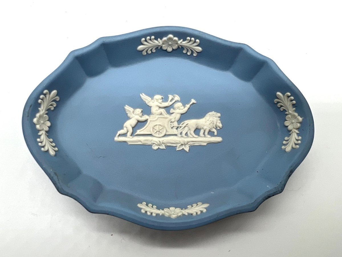 Ravissant petit plat en biscuit bleu ( Jasperware ) de la maison  Wedgwood , orné d’un bas-relief blanc représentant des putti et un lion tirant un char, symbole de puissance et de beauté. Les contours délicatement festonnés et les motifs floraux accentuent le charme classique de cette pièce. Parfait en vide-poche, pour une vitrine ou une table élégante. Dimensions : Longueur : 11 cm Largeur : 8 cm Hauteur : 2 cm État : Très bon état général, légères traces du temps. Wedgwood, Jasperware, porcelaine bleue, petit plat, décoration anglaise, biscuit de porcelaine, style néoclassique, chic anglais, objet de collection. Pays d'origine:Royaume-Uni