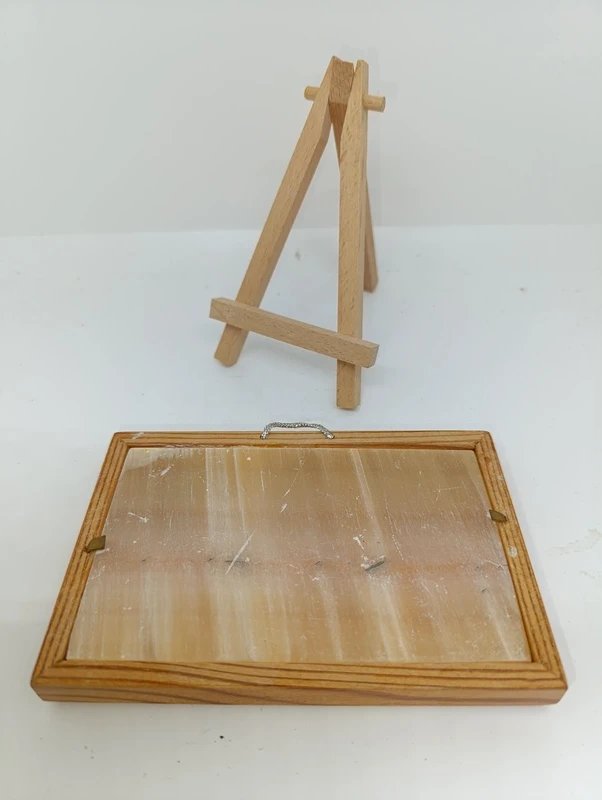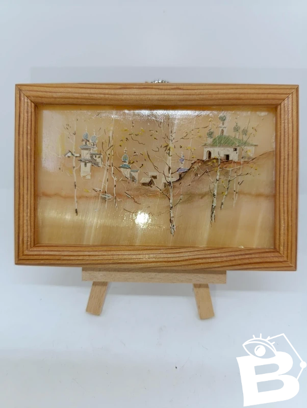 petit tableau sur pierre? Ã decor de paysage contour bois en bon etat semble etre sur pierre (onyx? ) ou matiere a definir beau travail dimension exterieur 14X9cm...