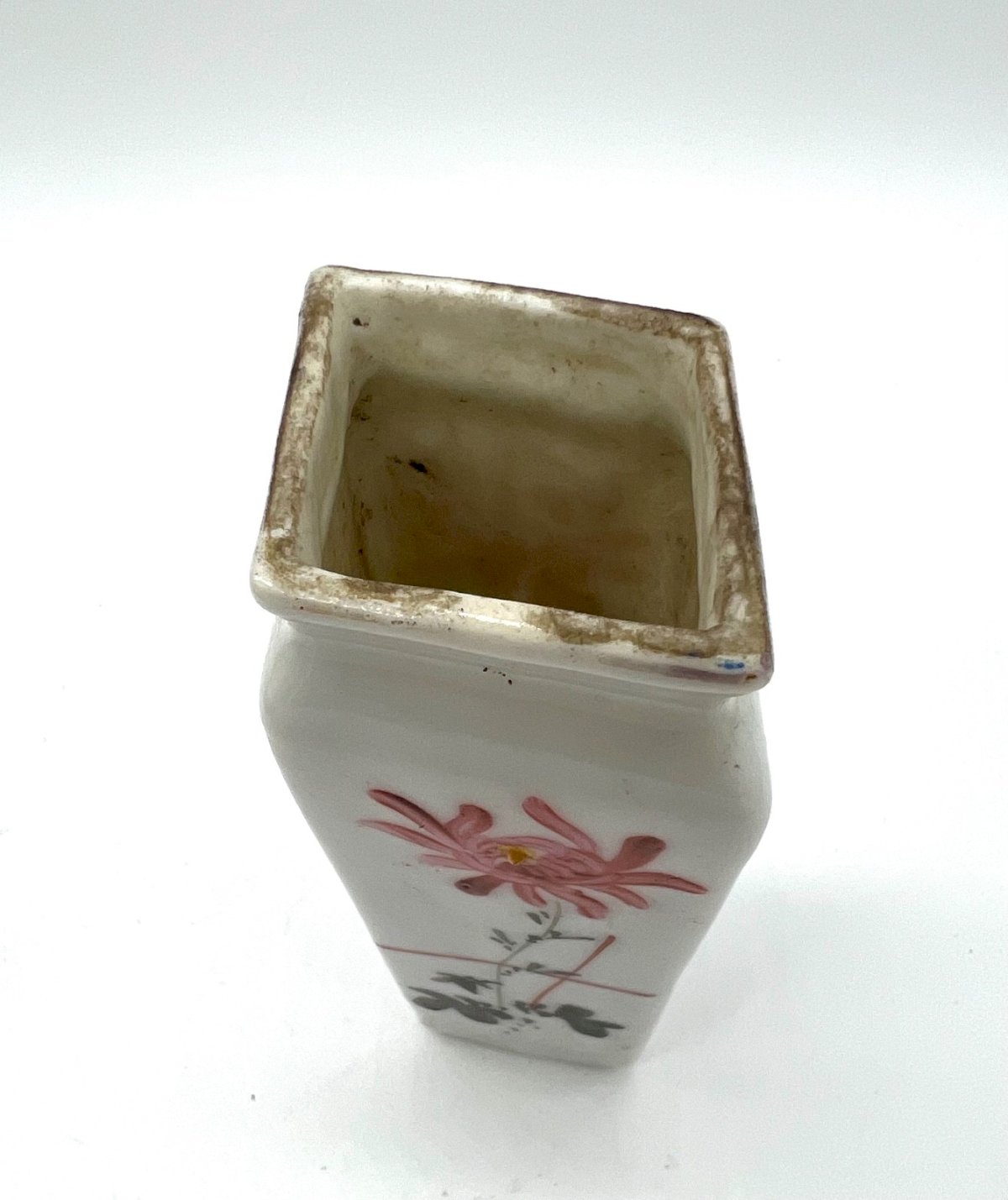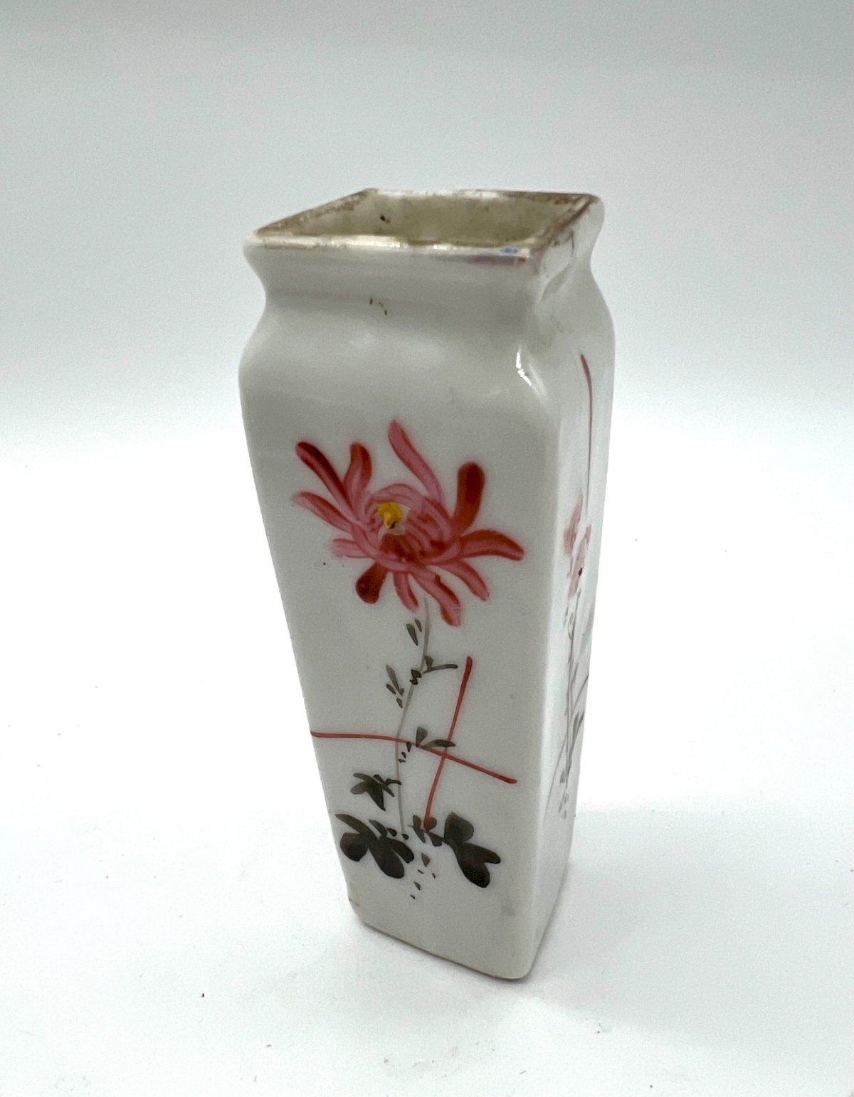Charmant petit vase ancien en porcelaine, de forme rectangulaire, délicatement peint à la main d’un motif floral de chrysanthème rouge sur fond blanc. Le décor, à la fois sobre et raffiné, s’inspire du style japonais du début du XXᵉ siècle, où la nature et la pureté des lignes étaient mises à l’honneur. Une pièce poétique et décorative, idéale pour une collection de miniatures, pour un cabinet de curiosités ou comme petit soliflore délicat sur une étagère. Caractéristiques : Époque :  début XXᵉ siècle Matière :  porcelaine peinte à la main Hauteur :  10,2 cm Largeur :  3,3 cm Profondeur :  3,3 cm État :  bon état général, patine d’usage, intérieur légèrement teinté par le temps, aucun éclat ni fêlure