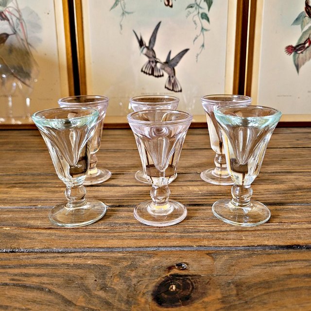 Parfaits pour une déco de table rétro, un coin bar vintage ou un cadeau plein de caractère.Il y a 6 verres dont deux présentent une couleur “bleuté”.Ils ont vécu mais sont en très bon état.6 verres en plus grande taille sont aussi disponibles (voir mes autres annonces).? Diamètre 4, 7 cm environ X hauteur 7, 9-8, 2 cm environ.Poids de 6 verres: environ 630 gr.