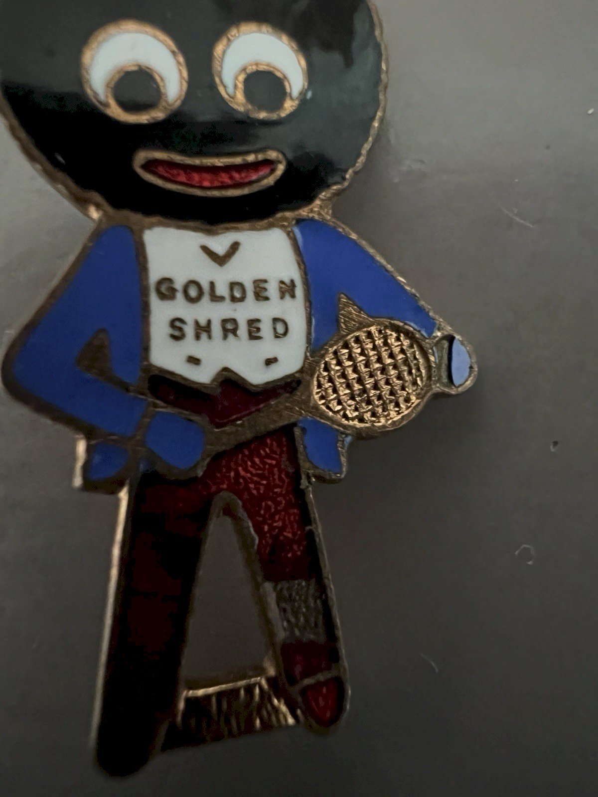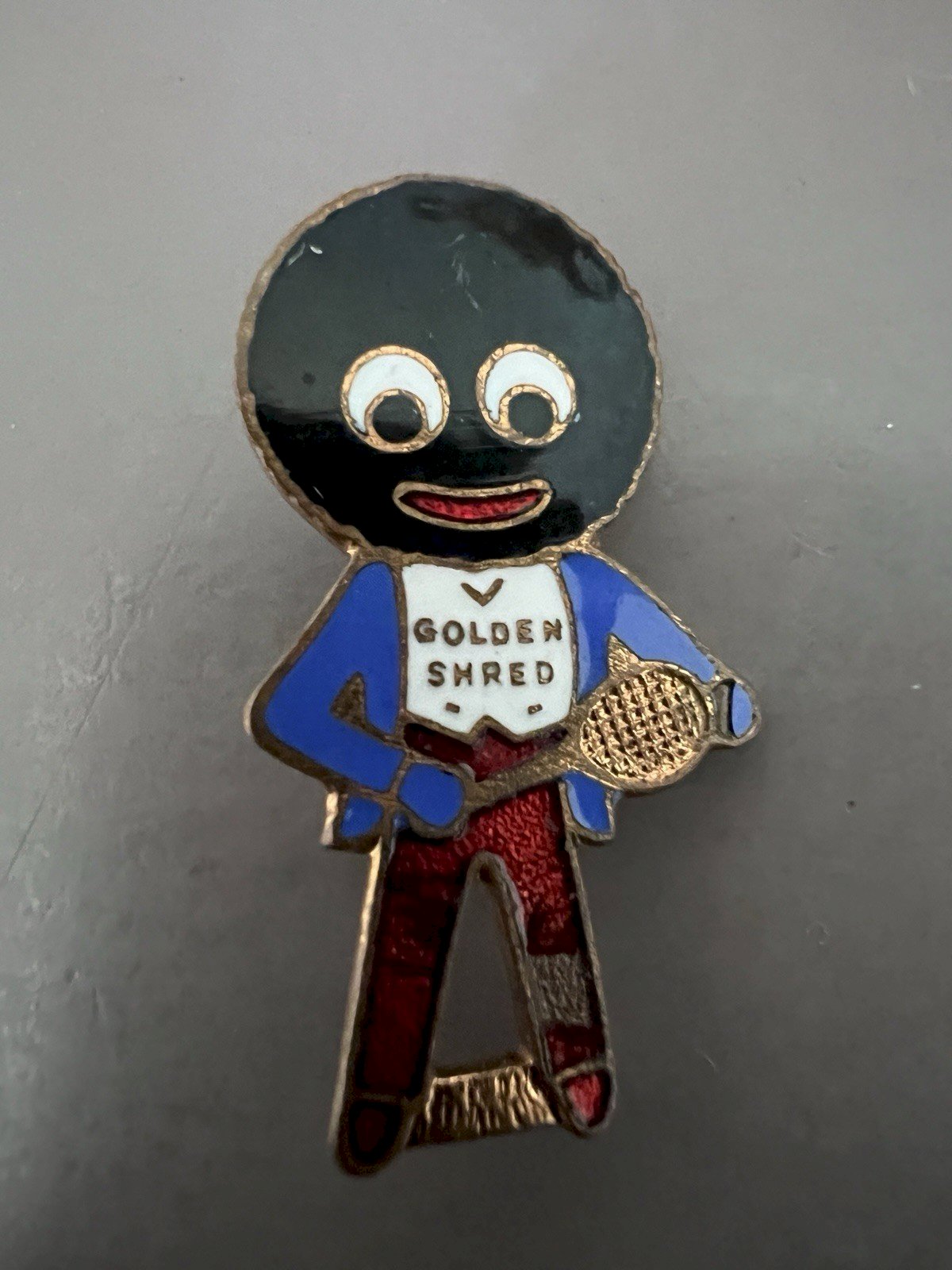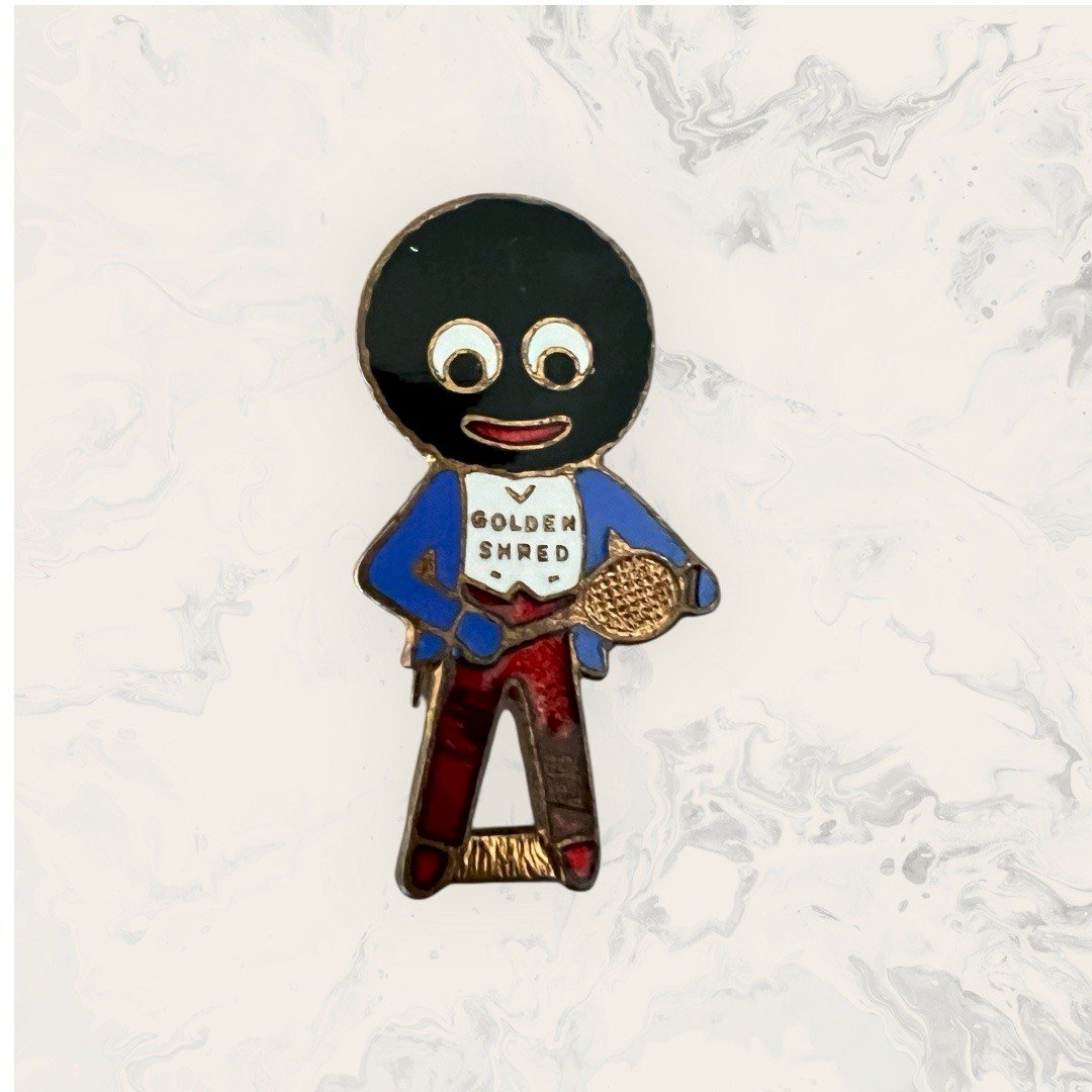 Petite Broche Ancienne Publicitaire Émaillé Tennis. Particularités Golden Shred était une marque de marmelade introduite à l'origine par Robertson's. Robertson's fabriquait de la marmelade et des confitures et a été fondée par James Robertson en 1864. L'usine d'origine était basée à Paisley, Renfrewshire, en Écosse. L'entreprise a également construit une usine à Droylsden à Manchester en 1891. En 1928, Robertson a lancé le programme de collecte de broches Golly. Il s’agit du programme de collecte le plus ancien de l’histoire. Badge ancien “Golly – Golden Shred” (Robertson’s) – joueur de tennis Fabricant : W. Miller Ltd – Birmingham 12 Période estimée : années 1950 Matière : métal émaillé Dimensions : environ 3,5x1,8 cm environ État : bon état général, traces d’usure liées à l’âge (voir photos) manque d’email Ancien badge publicitaire offert par la marque britannique Robertson’s dans le cadre de son programme de fidélité autour de la confiture Golden Shred. Représente le personnage emblématique de la marque en tenue de tennis. Objet de collection représentatif de l’histoire de la publicité anglaise du XXe siècle. Attention : ce badge est présenté ici pour son intérêt historique et publicitaire. Le personnage qu’il représente est aujourd’hui reconnu comme une figure stéréotypée et controversée. État:Occasion: Objet ayant été utilisé. Consulter la description du vendeur pour avoir plus de détails ...Occasion: Objet ayant été utilisé. les éventuelles imperfections. Type:Broche Original/reproduction:Original Période:Années 1950 Pays de fabrication:Royaume-Uni Matière:Métal, Tôle Thème:Sport